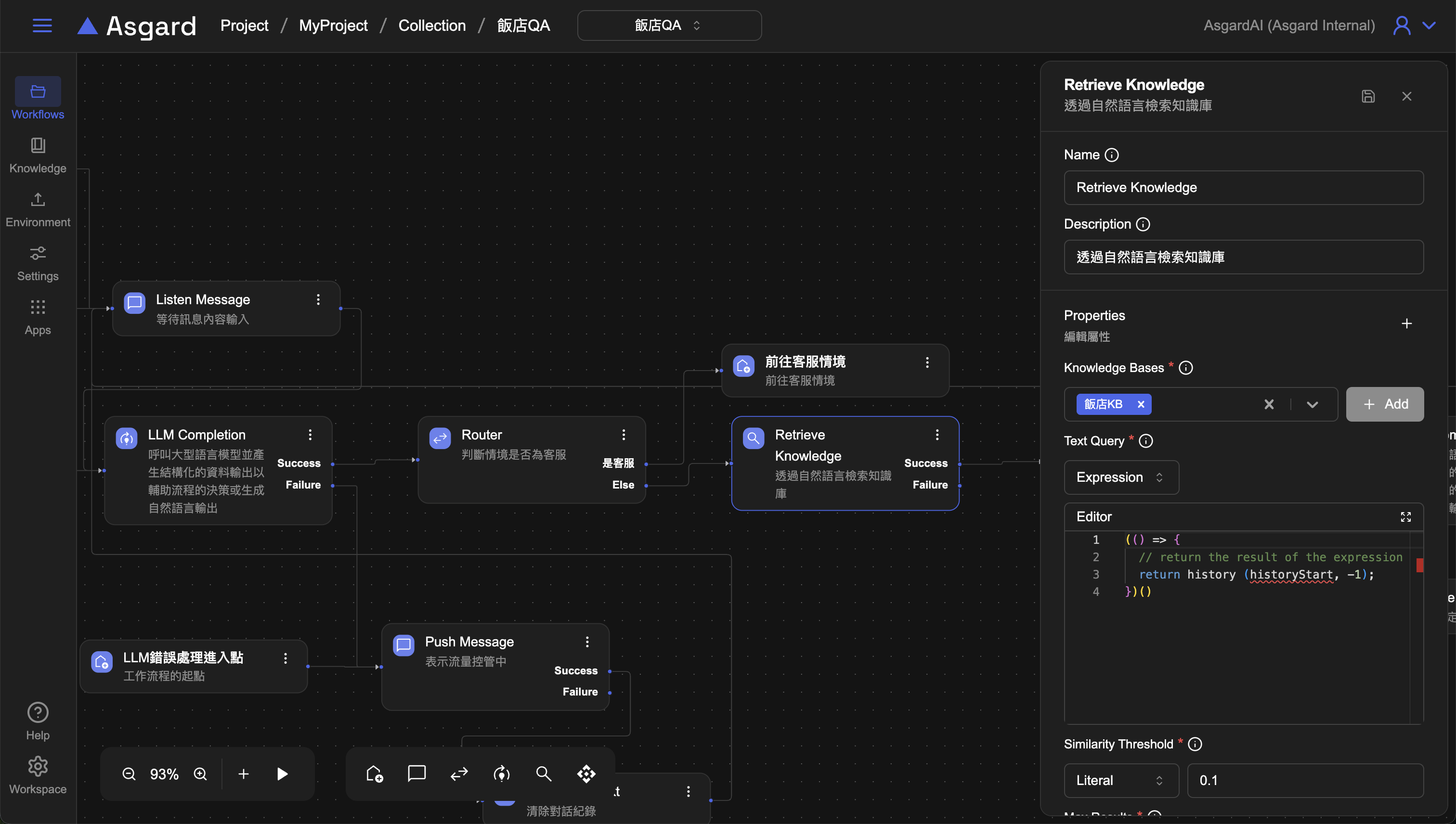 先將原本 Else 接續的 Push Message 刪除,並新增 Retrieve Knowledge 以便將歷史對話紀錄用於檢索知識庫。