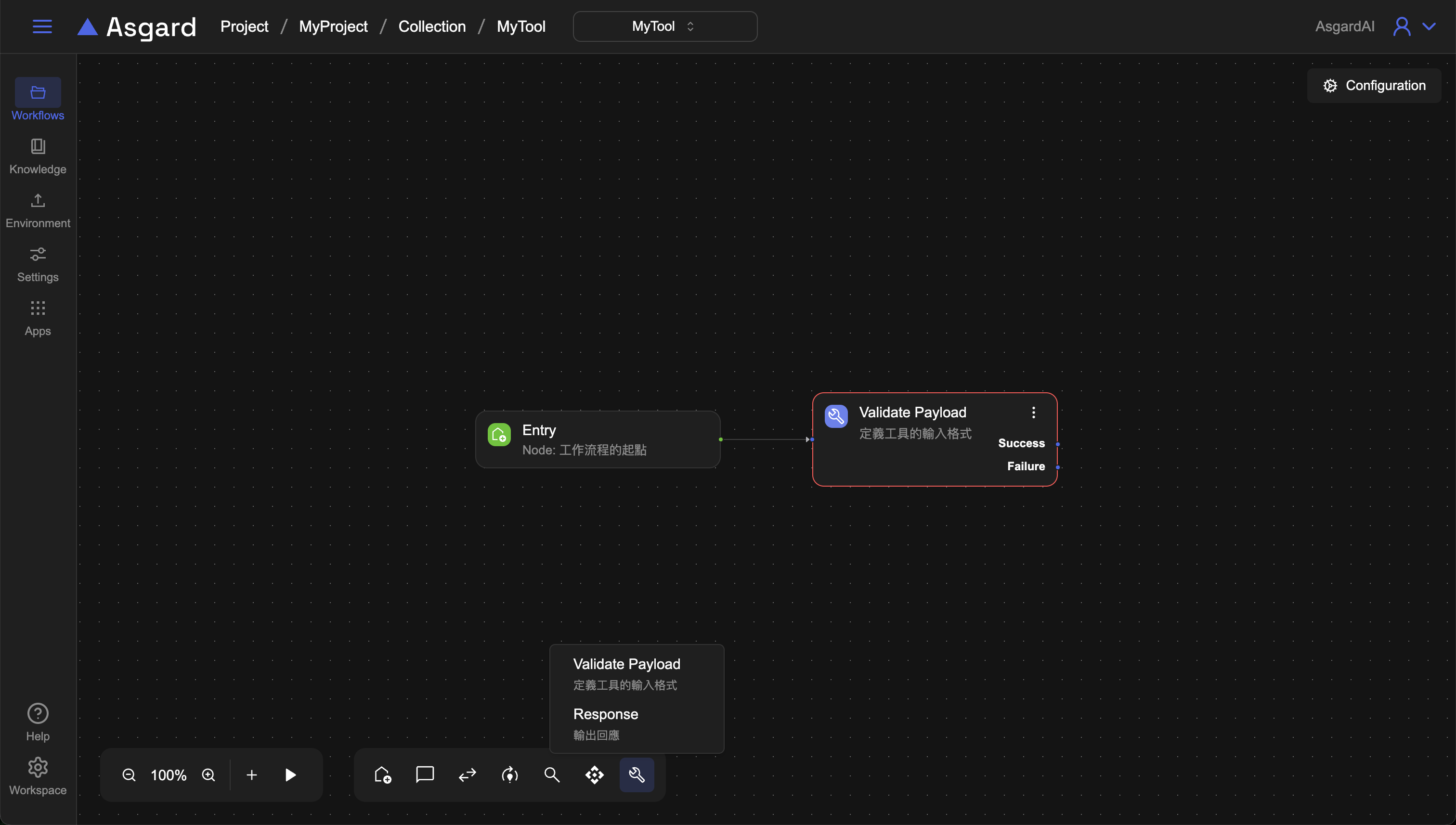 Automation Tool 與 Bot 的區別在於,Automation Tool 多了專屬的 processors: Validate PayloadResponse,讓用戶可以快速拖拉建立 API。新增 Automation Tool 時,Asgard 預設會為您建好初始進入節點與 Validate Payload 節點,節省建立時間。Validate Payload 用於驗證 input,Response 則是用來放 output 的結果。