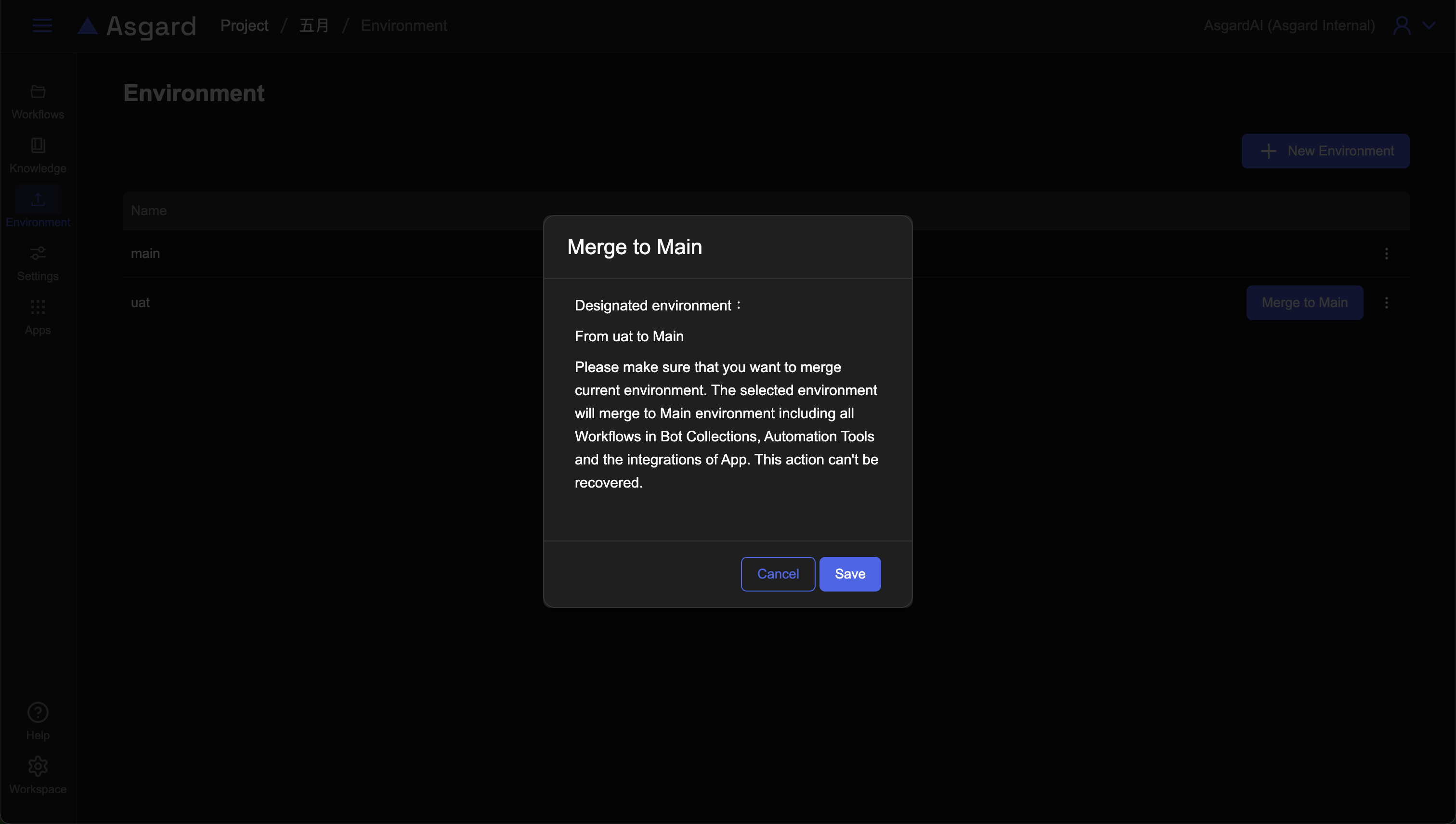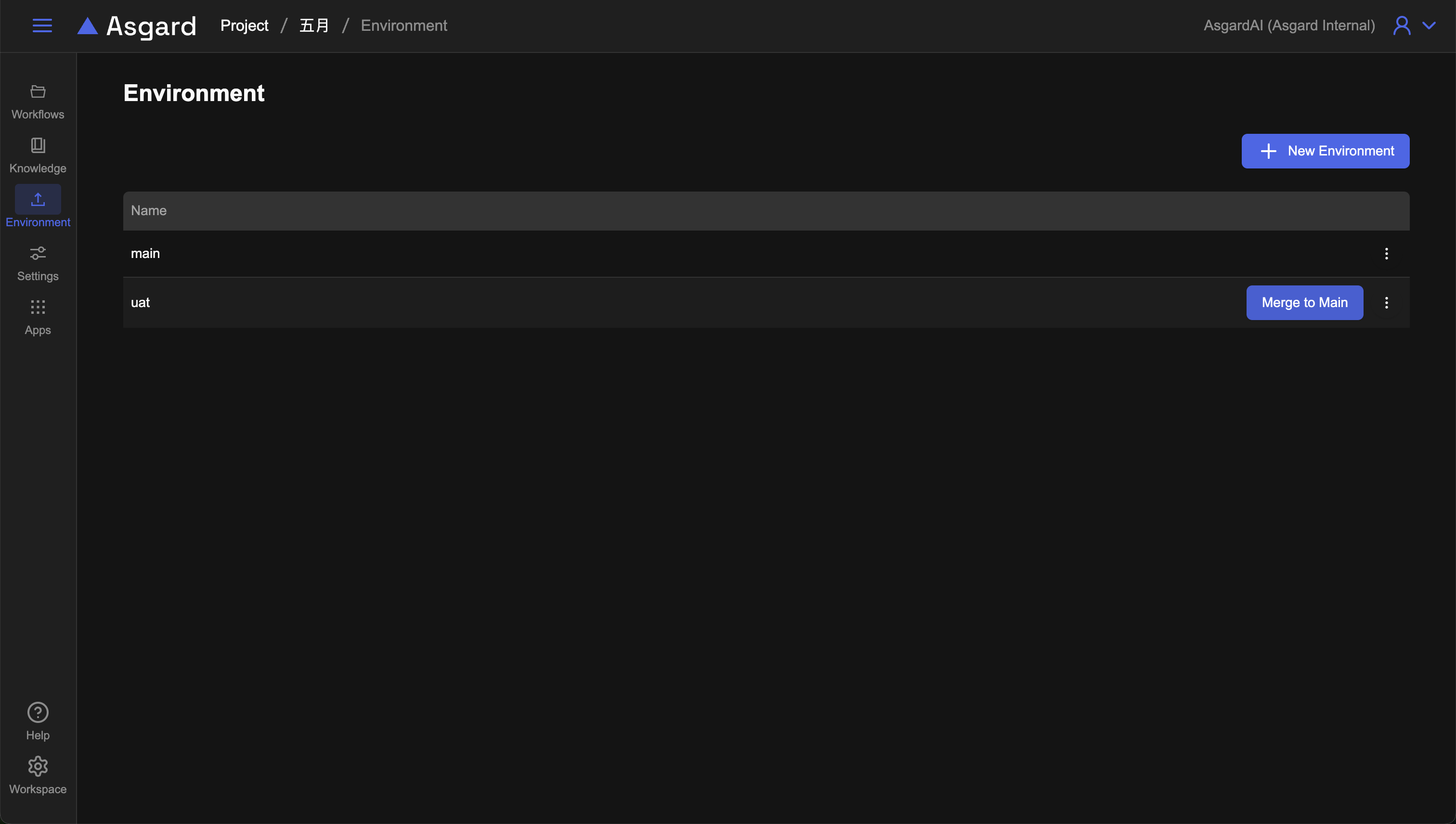 環境切換提供了用戶可以依據專案不同階段的進展或是迭代的需求,切換至不同環境,以進行各種情境測試與發佈,在 Environment 頁面,可以選擇目前的環境例如 uat,點擊「Merge to Main」即可將目前在 uat 環境的 Collections 與裡面的 Workflow 合併至主環境。