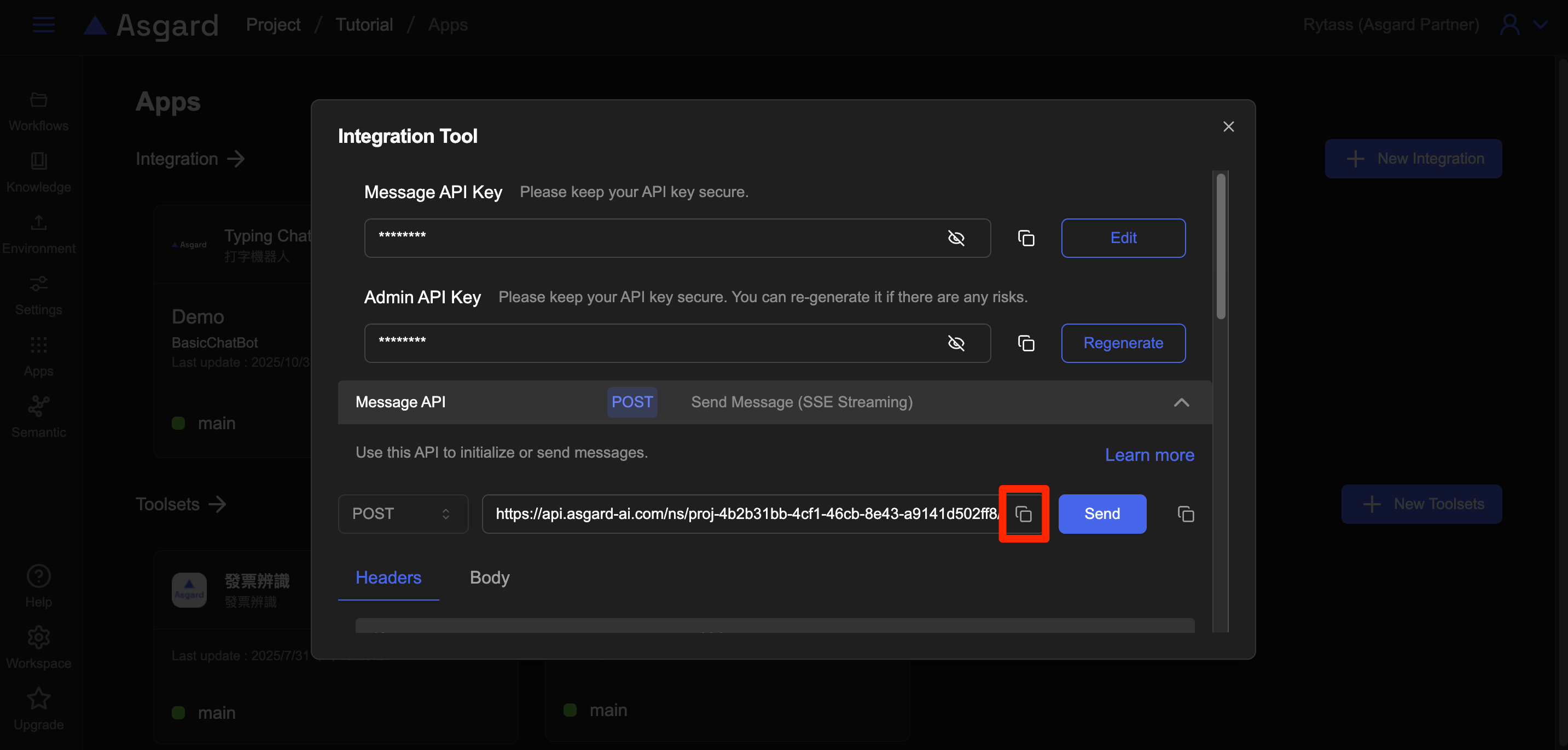 1. 選擇 Integrate,在彈出視窗中展開 Message APISend Message (SSE Streaming) 下拉選單,點擊網址右側的 Copy 按鈕複製 API 網址