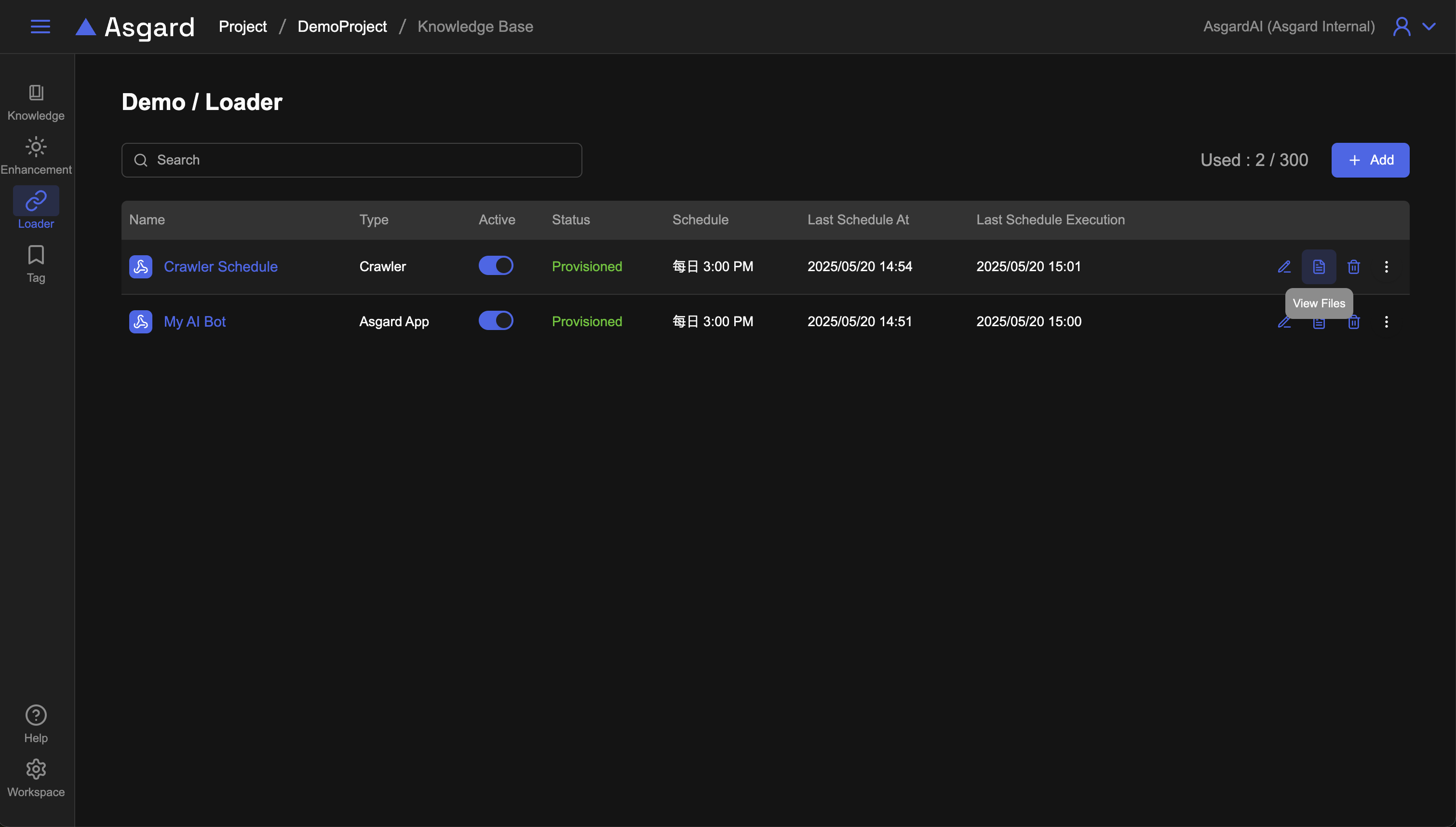 由設定好的 Loader 點擊「View Files」或是直接在知識庫列表的 Auto Load 分頁皆可以查看檔案。您也可以下載或是刪除該檔案,請注意 Loader 排程若啟用的狀態下,在下一次排程執行後,該檔案會再重新被載入,若不需要該檔案,可以停用或刪除該 Loader。