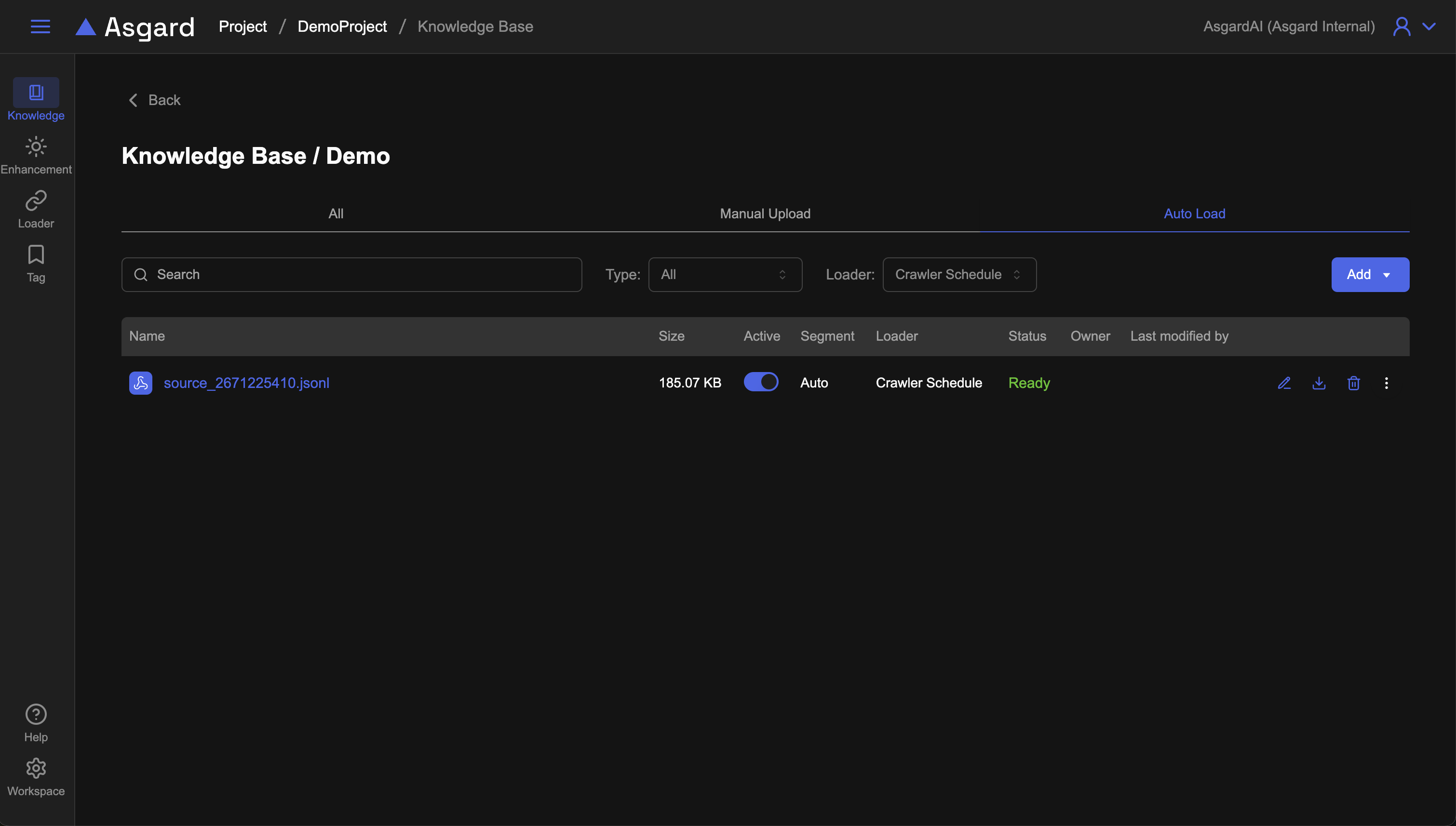 可以在知識庫列表的「Add」按鈕點擊後選擇「Auto Load」或是直接進到左側 Loader 功能列表後,點擊「Add」新增。