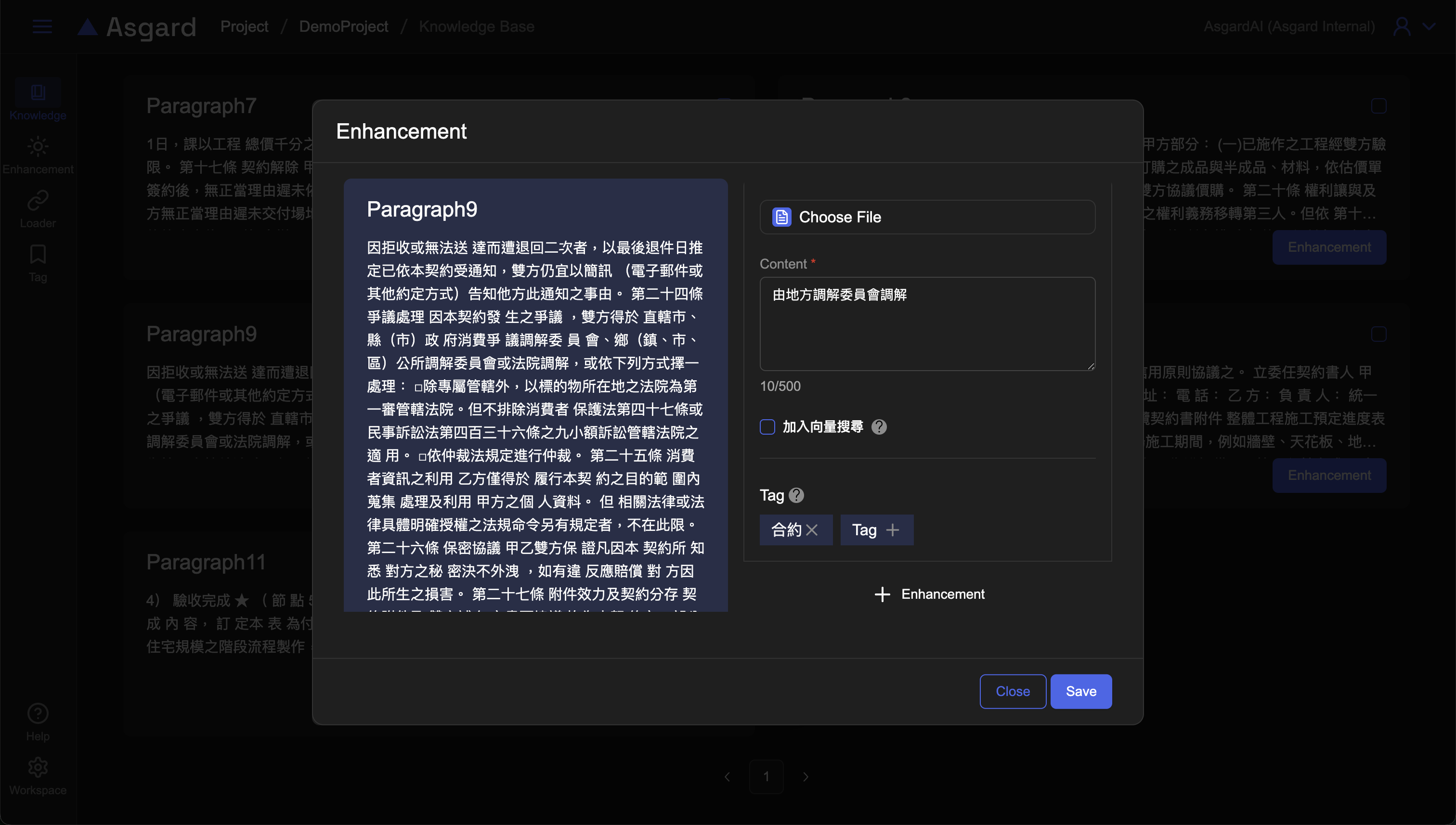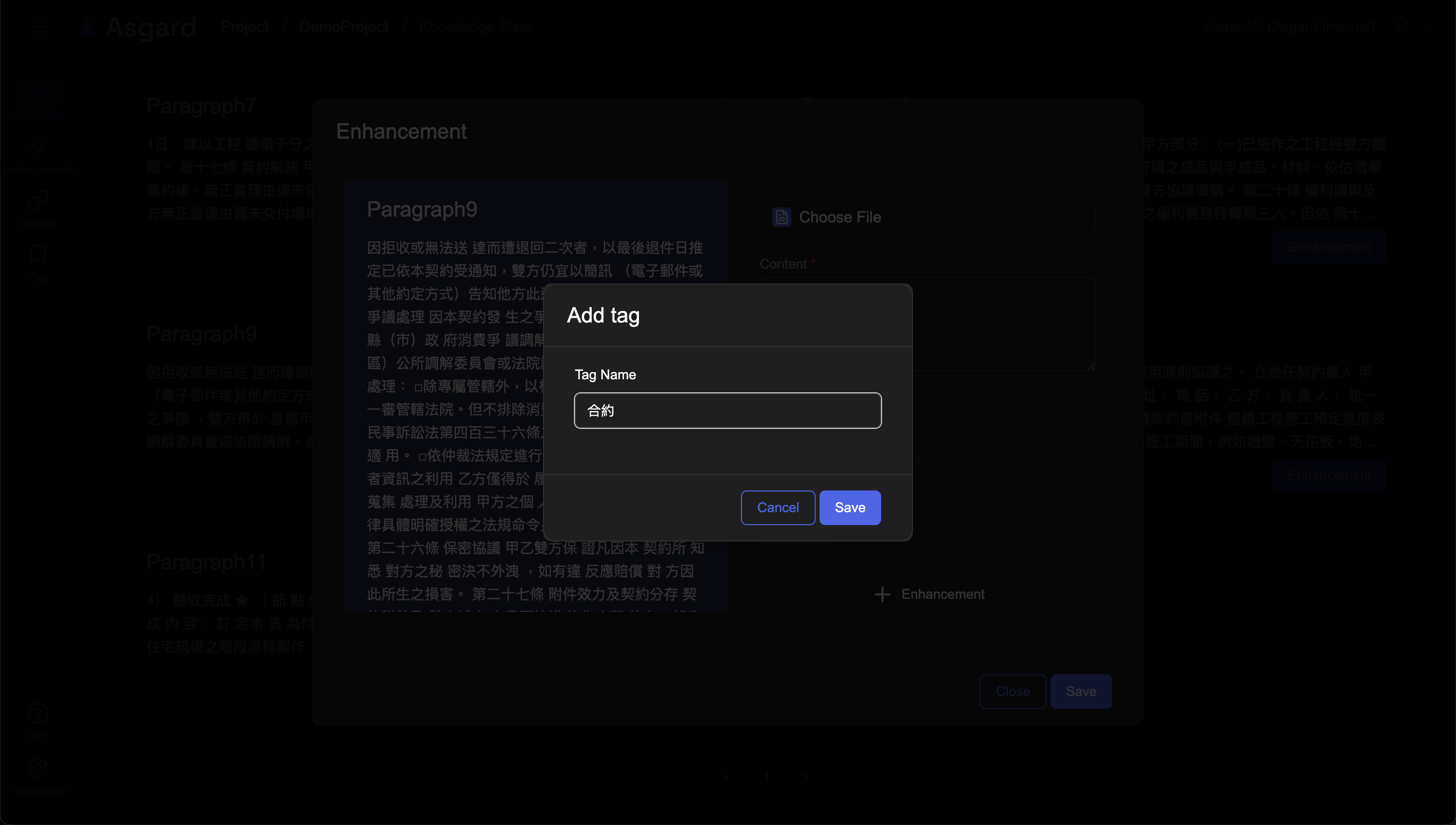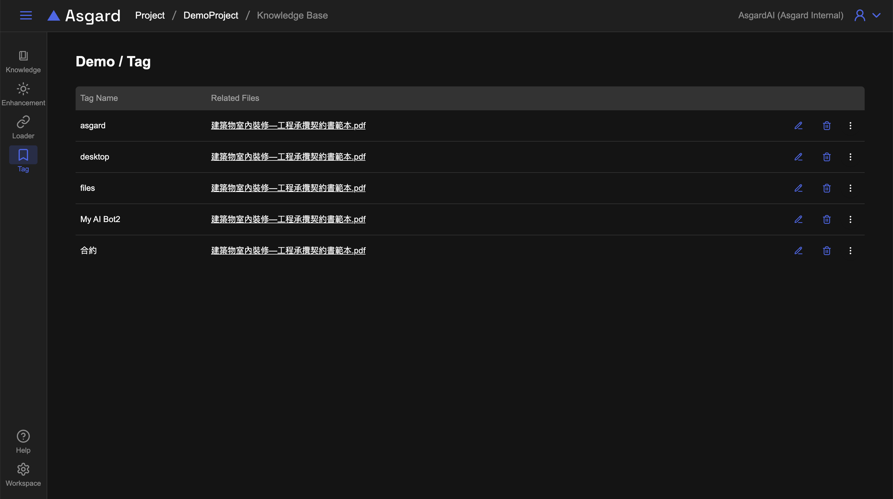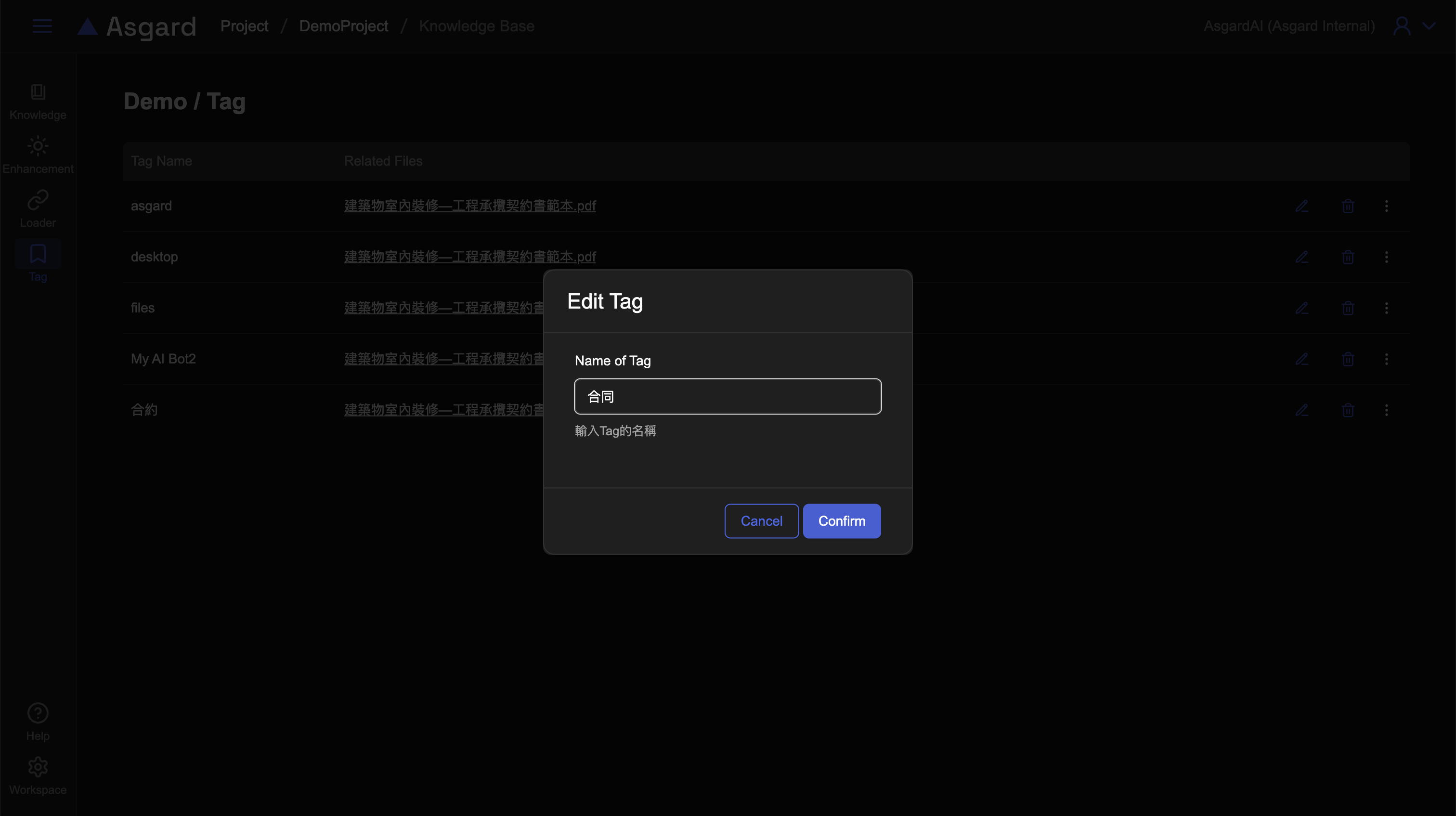 在知識庫內的左側功能列,點擊 Tag 可以檢視當前知識庫(例如 Demo)的所有標籤。您可以編輯或是刪除該標籤。