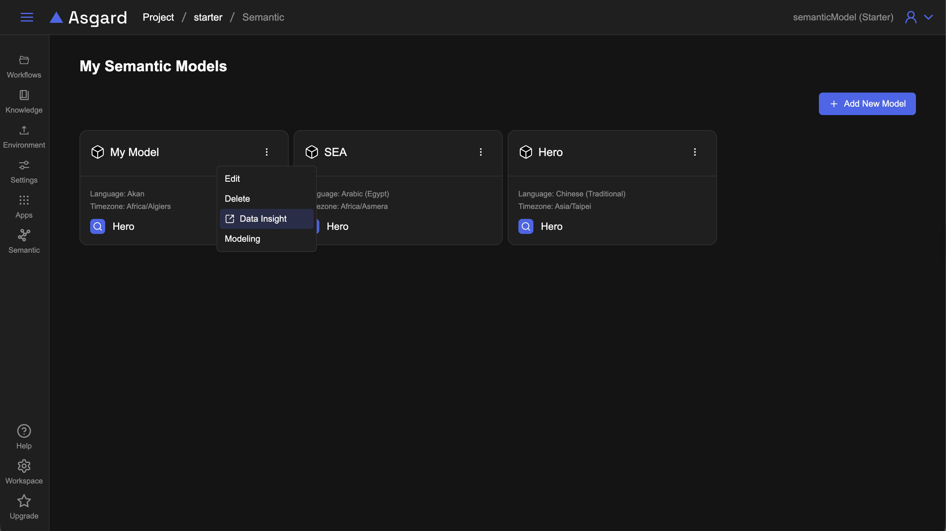 產品手冊Odin | Asgard Studio開始使用Semantic Model使用模型建立圖表或儀表板本頁導覽使用模型建立圖表或儀表板可以使用建立好的模型,透過 AI 對話產生資料洞察圖表。 從 Semantic Model 進到 Data Insight 分析 可以透過列表頁或是詳細頁進入,更多詳細功能請參考 Data Insight Dashboard 管理。