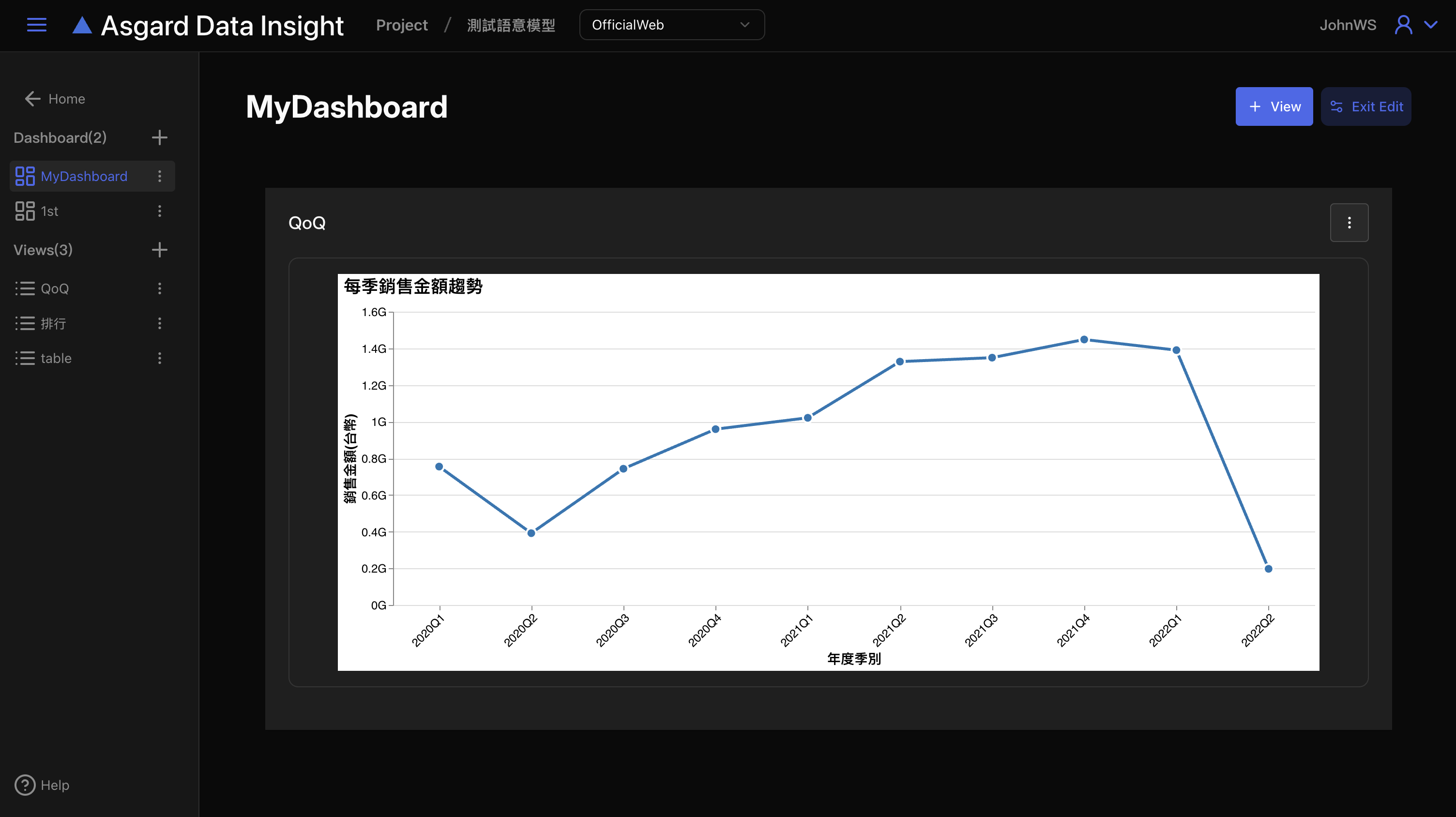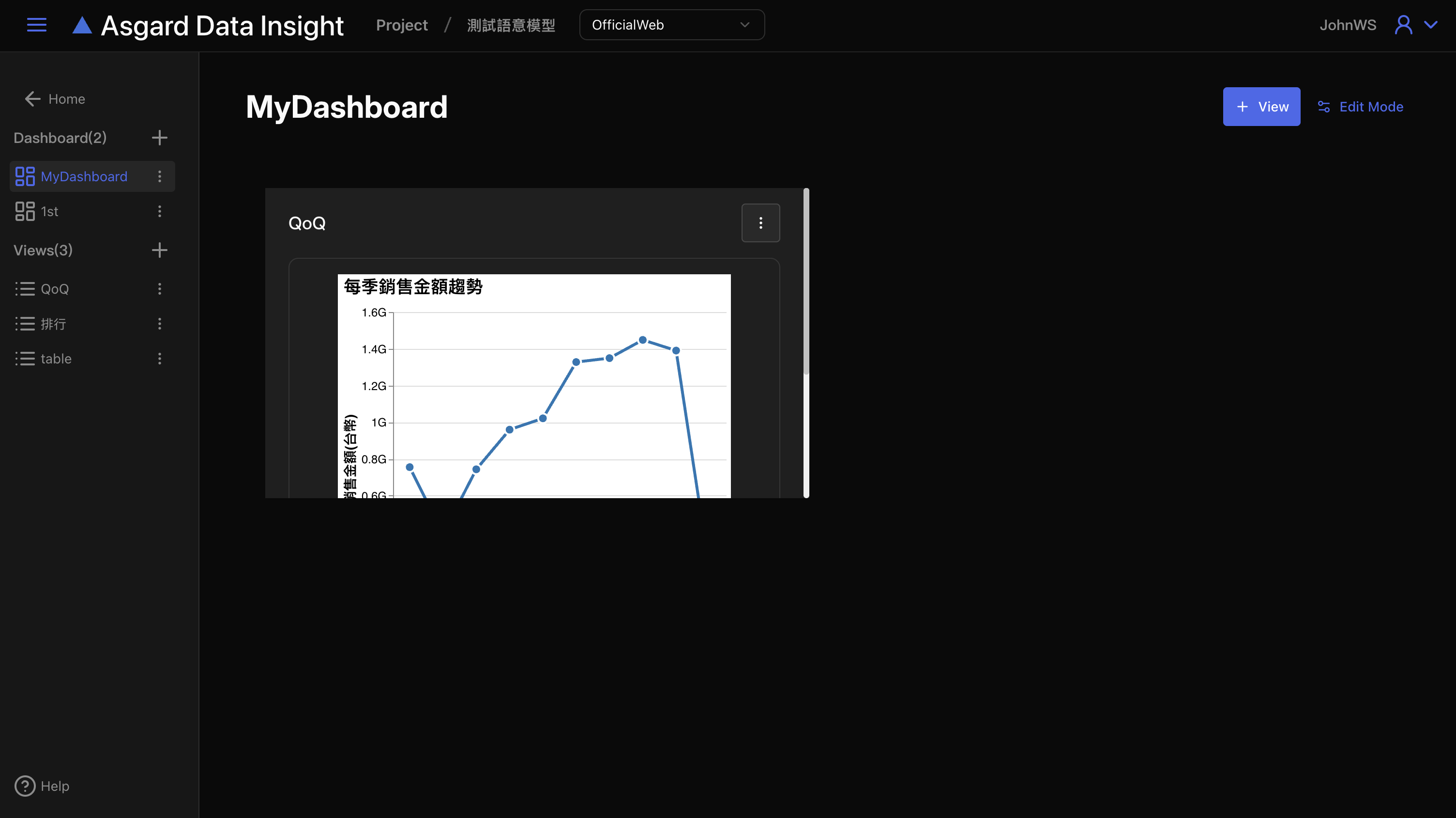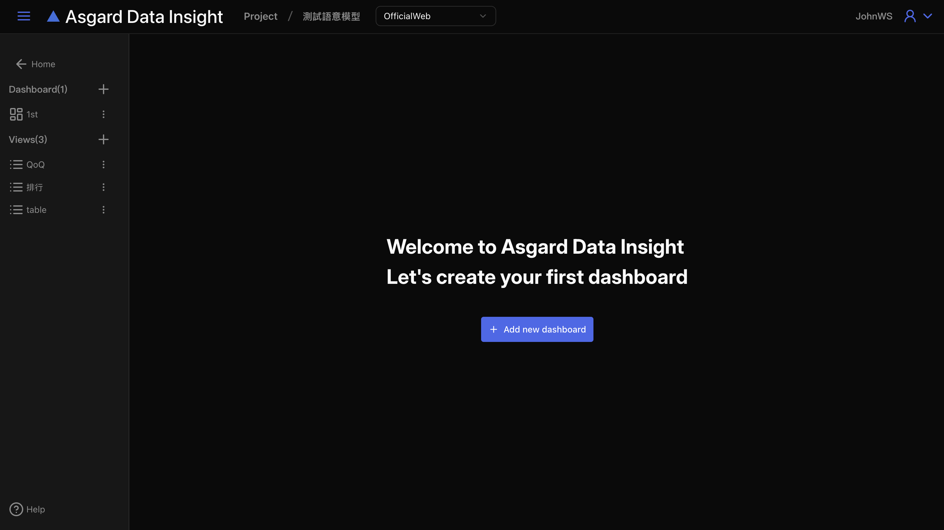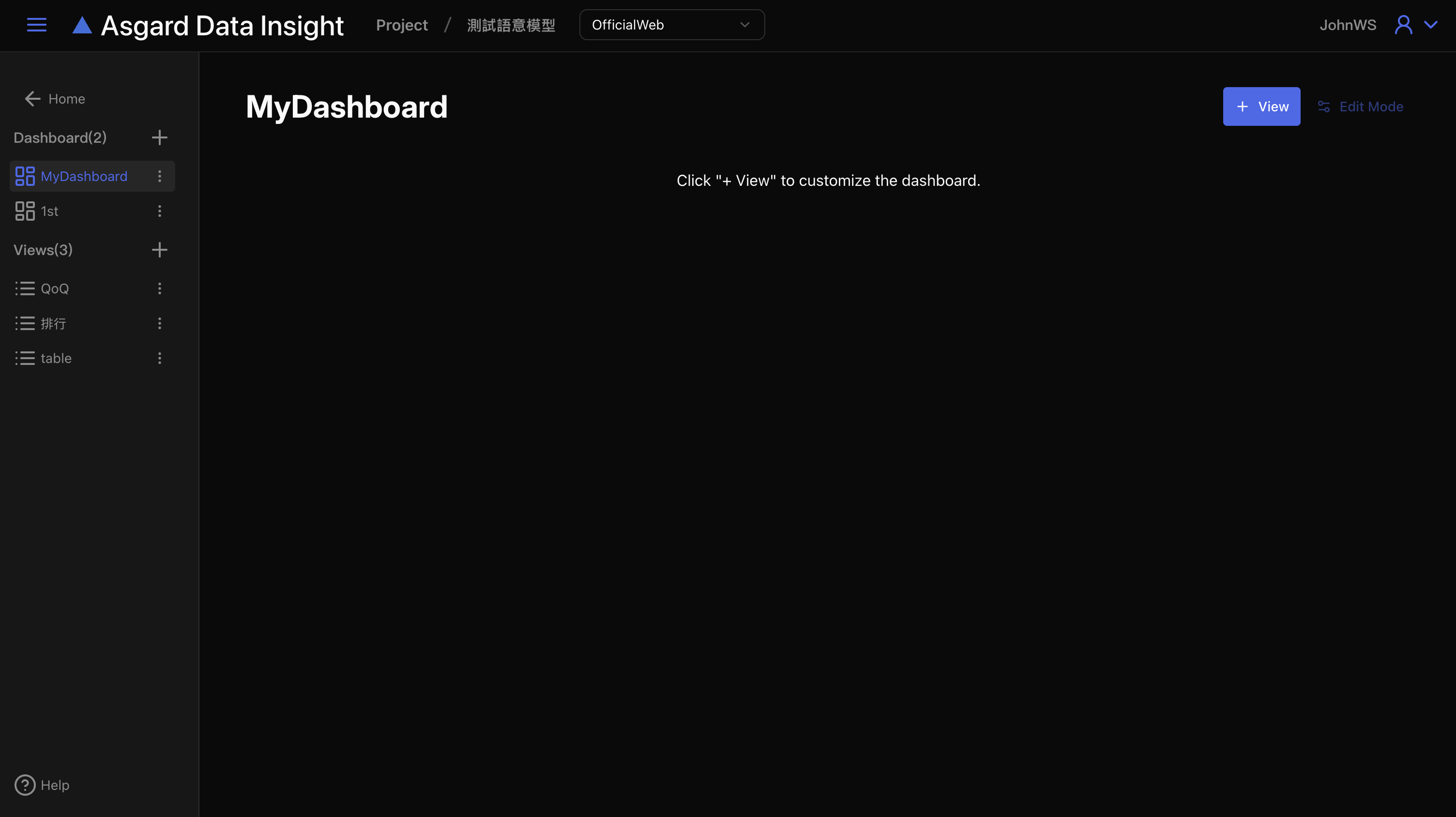 首次進入 Dashboard 功能,請先新增一個空白的儀表板來編排所需要的圖表 View。左側清單可以看到 Dashboard 與 View 兩個區塊,點擊最上方 Home 可以回到 Data Insight 首頁。