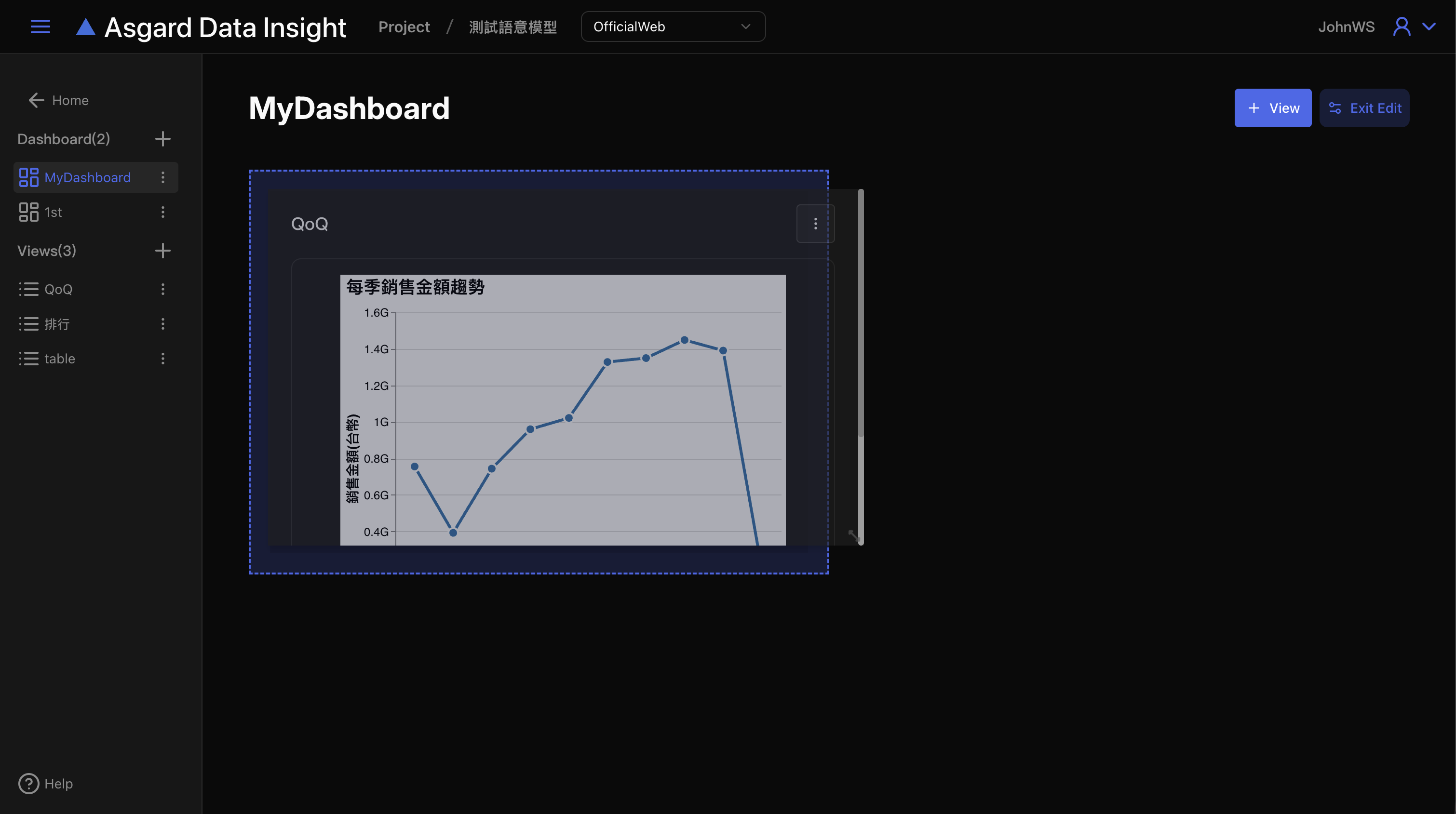 點擊右上角的Edit Mode來進入Dashboard的佈局編輯模式,點擊後按鈕顯示會變成「Exit Edit」,此時滑鼠靠近View的右下角時會出現箭頭,能進行放大或縮小。若需要調整位置,請按住該View並拖曳到需要的位置即可,拖曳時會出現淡藍色預覽效果。