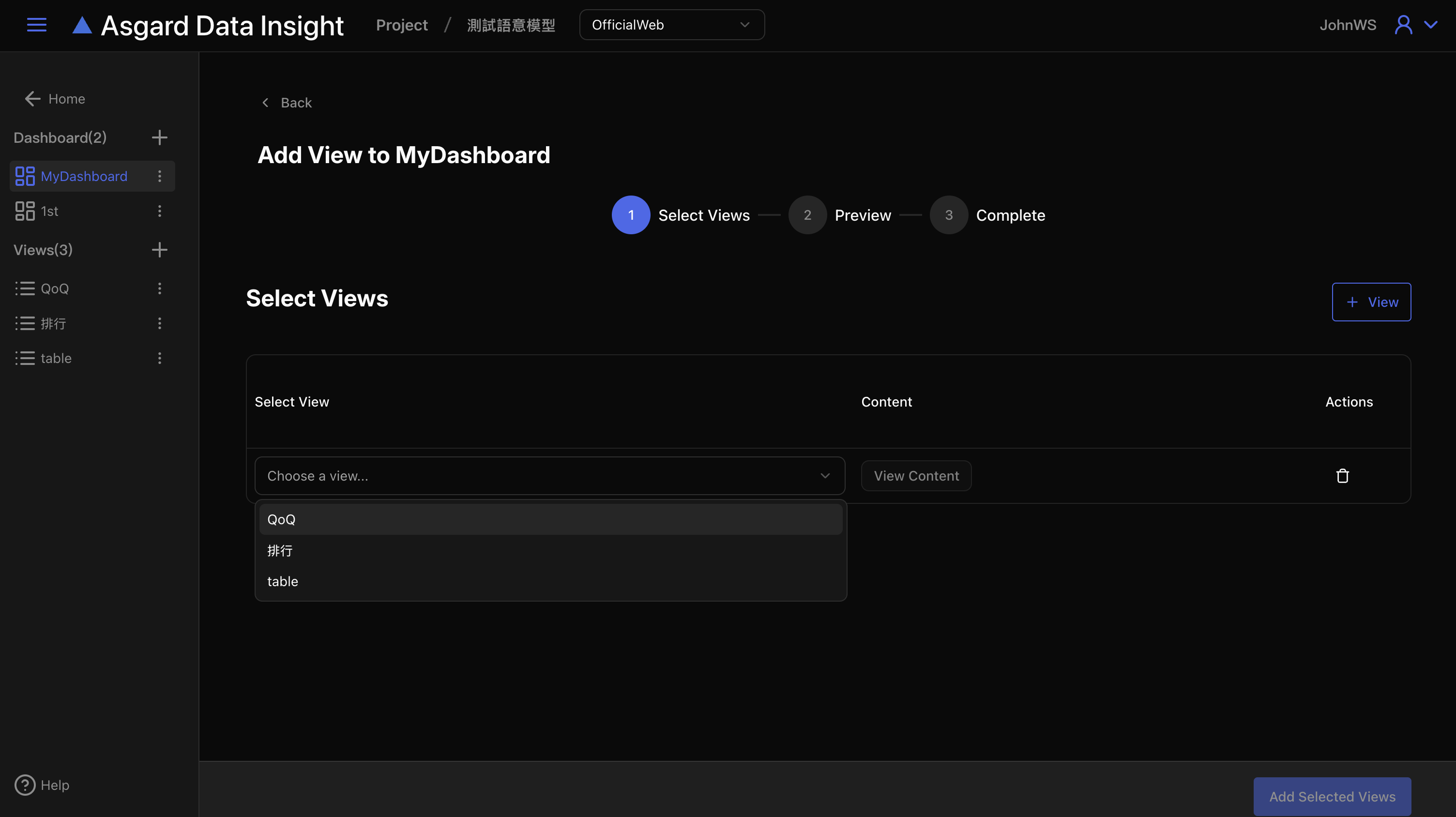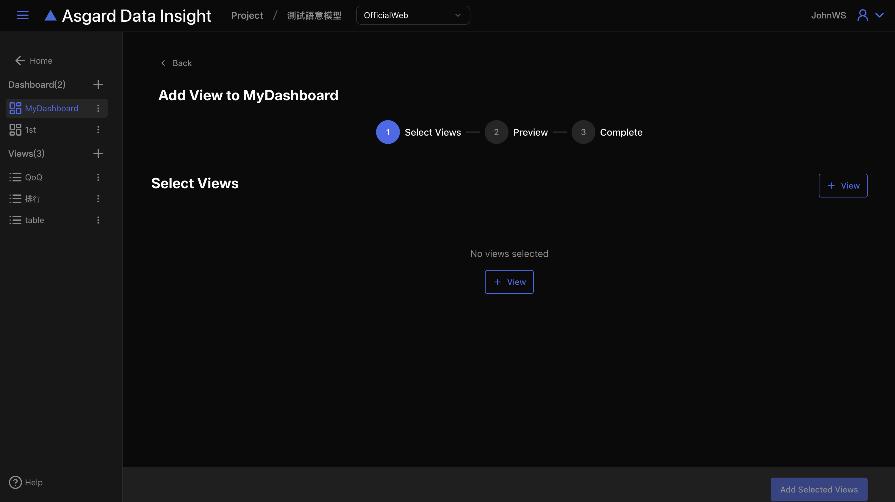 由 Dashboard 加入 Views 提供批次新增的功能,您也可以僅加入一個View。點擊「+View」來新增一筆記錄。