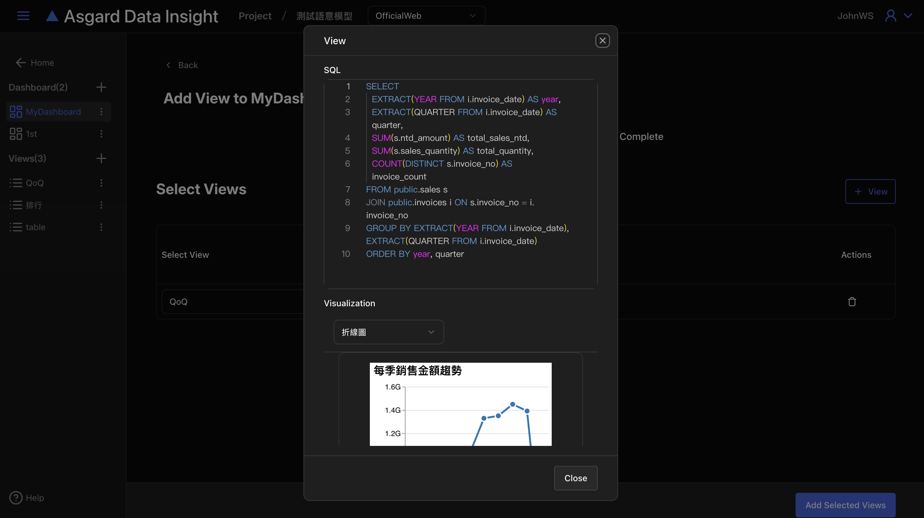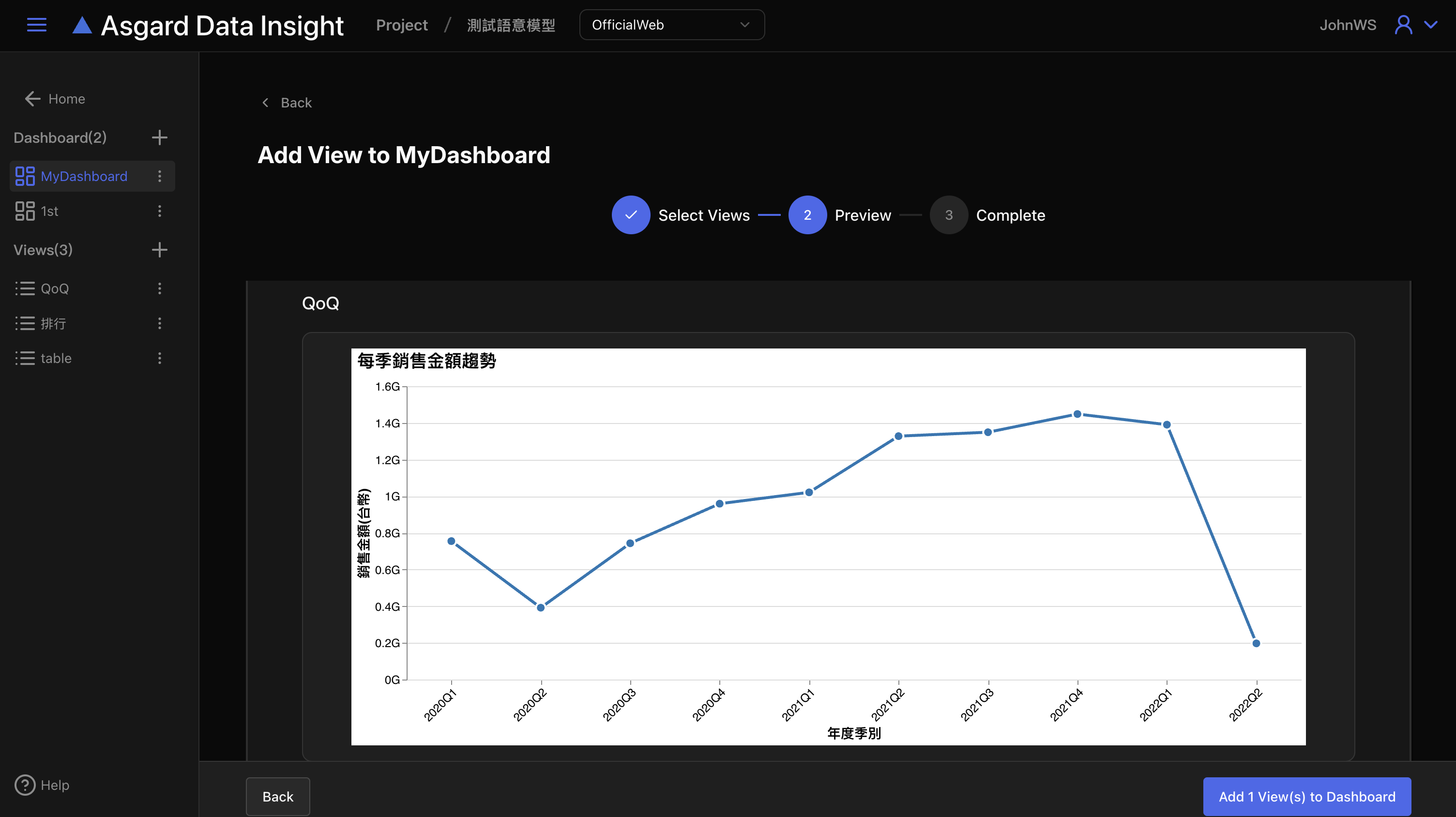確認後點擊「Add View to Dashboard」即可。此處會列出已加入的圖表名稱與描述。