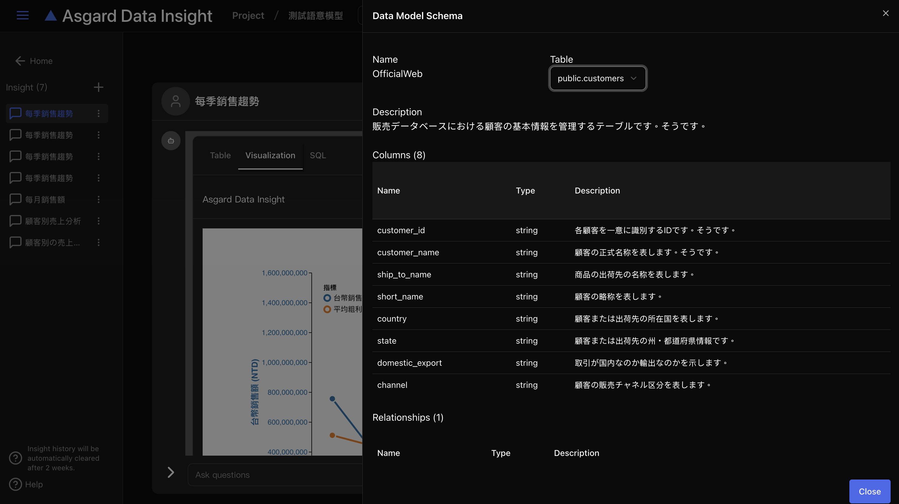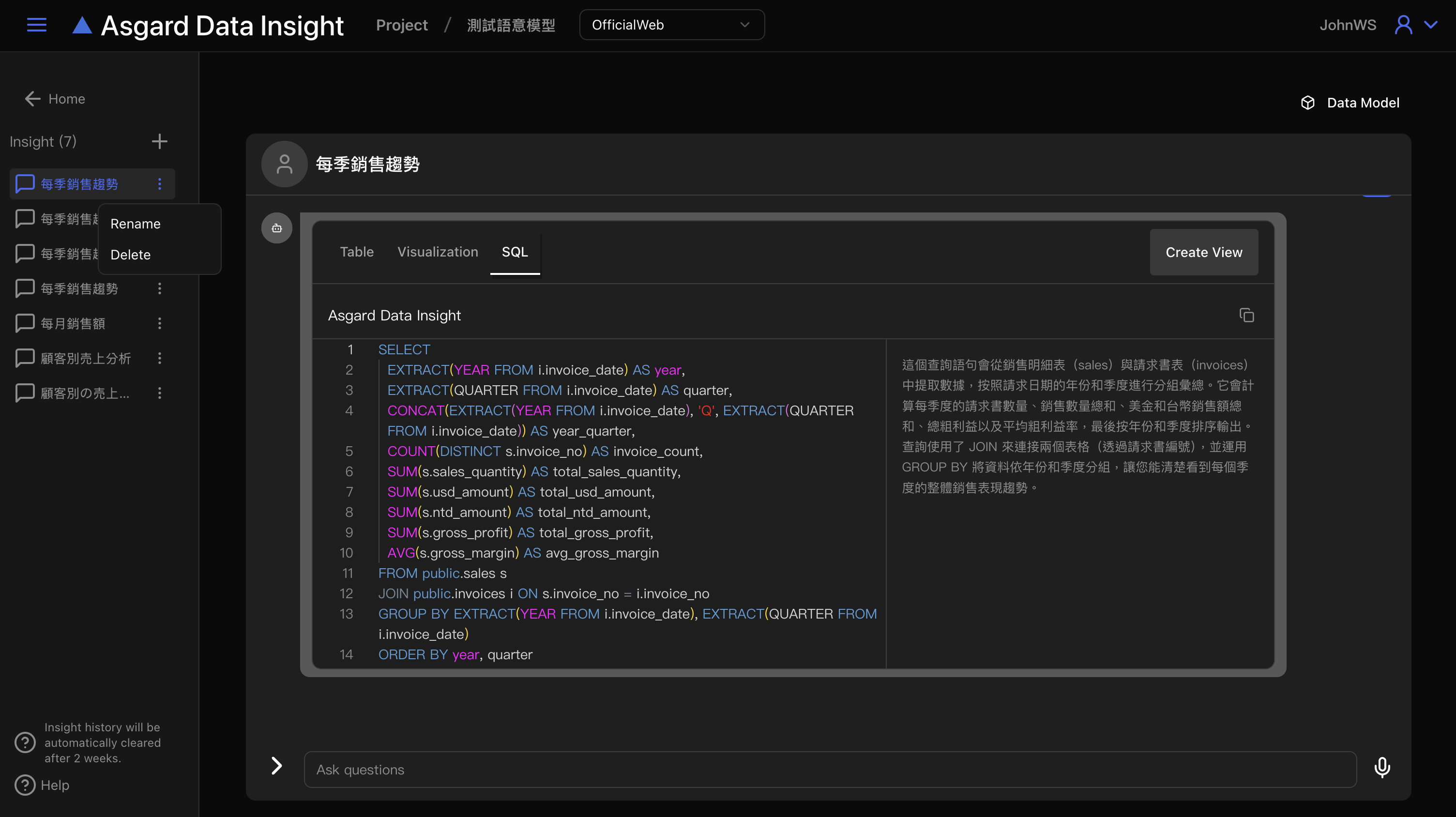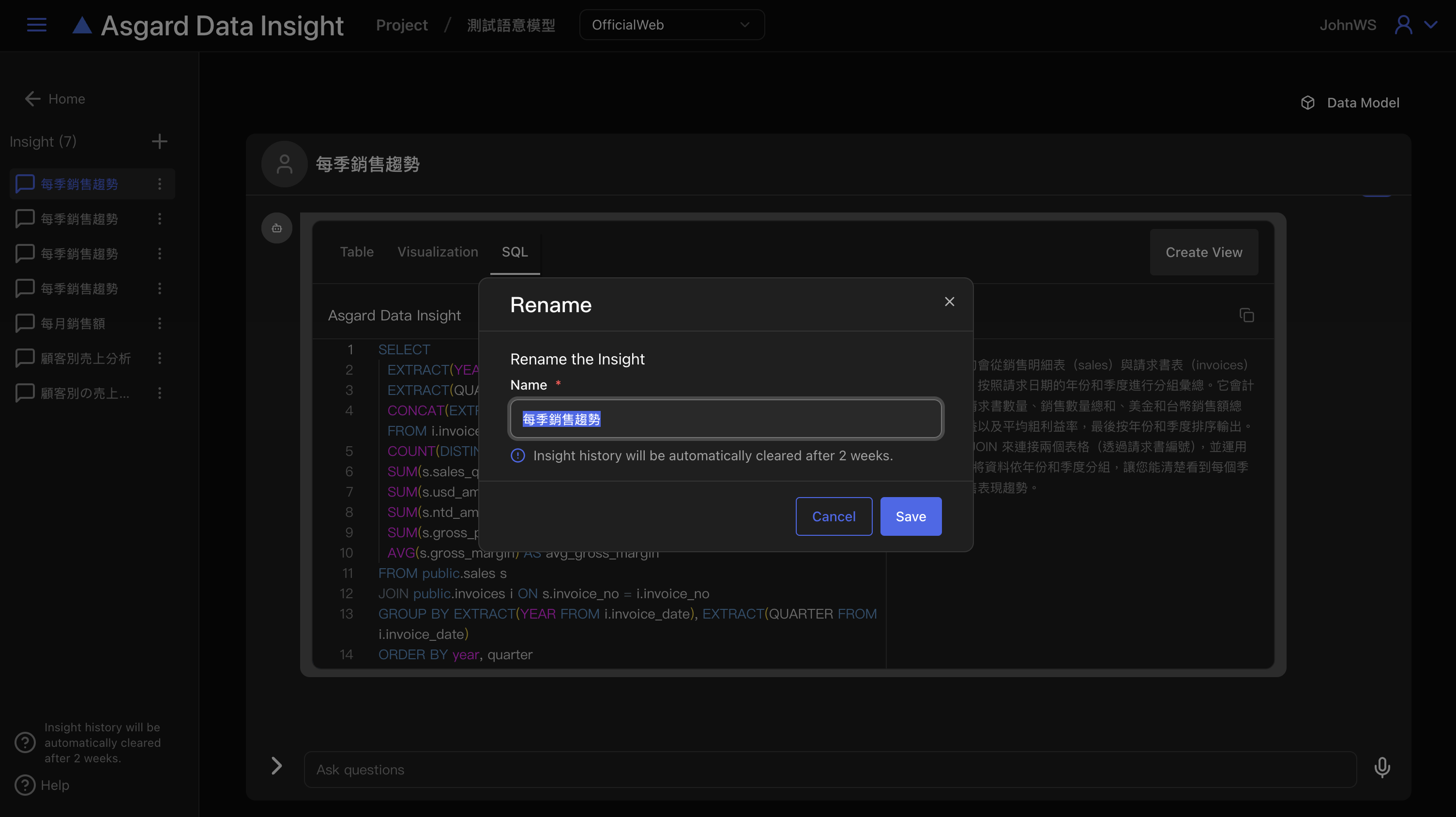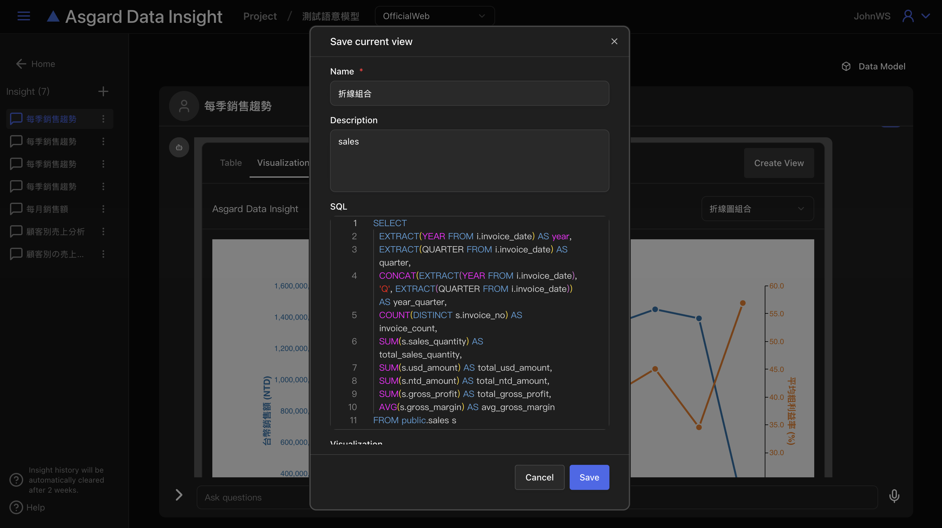 注意,Insight 僅會儲存兩週,超過兩週的 Insight 將會被系統自動清除,請務必將需要的 SQL 與 Visualization 儲存成圖表(Create View)。