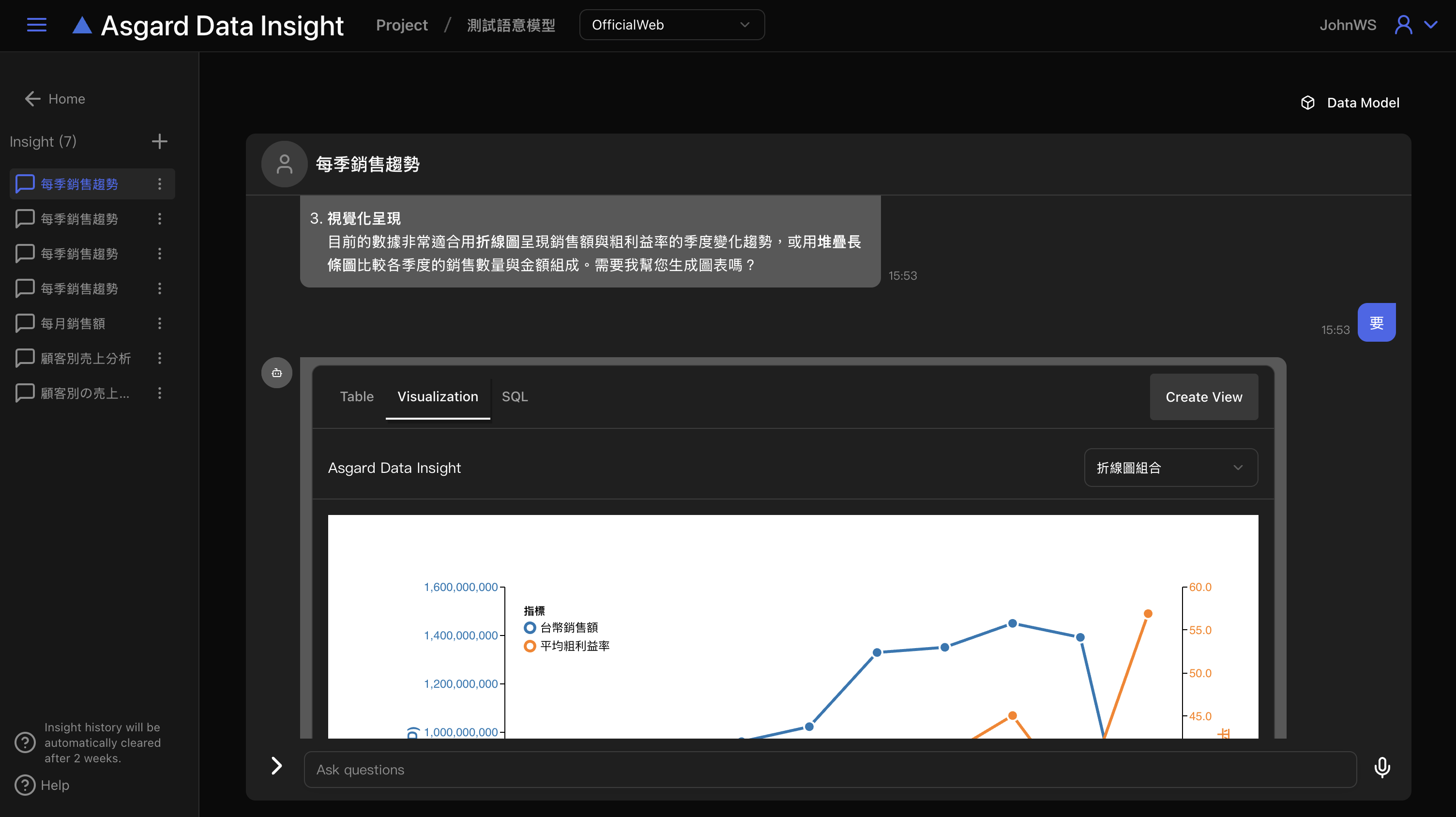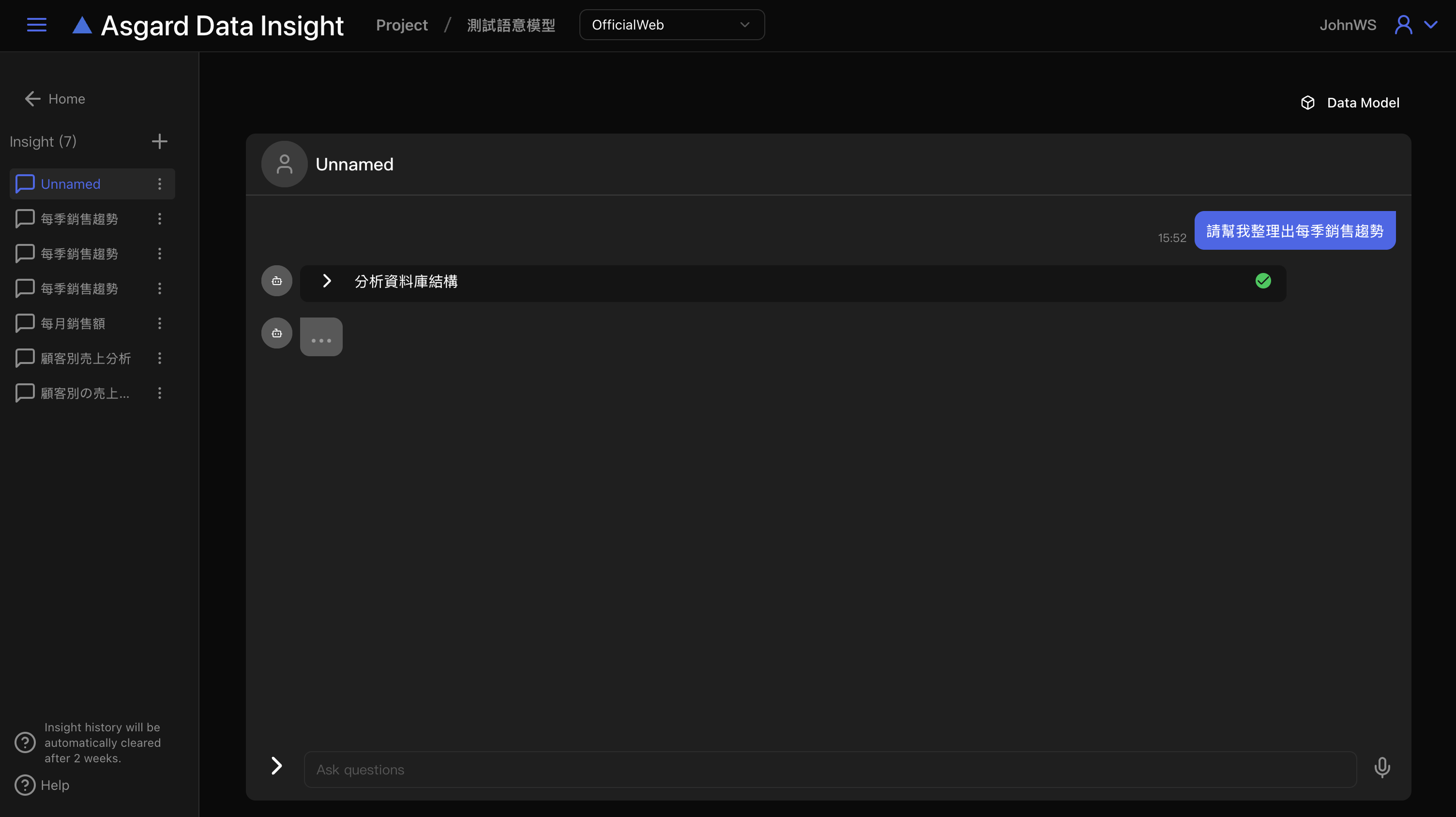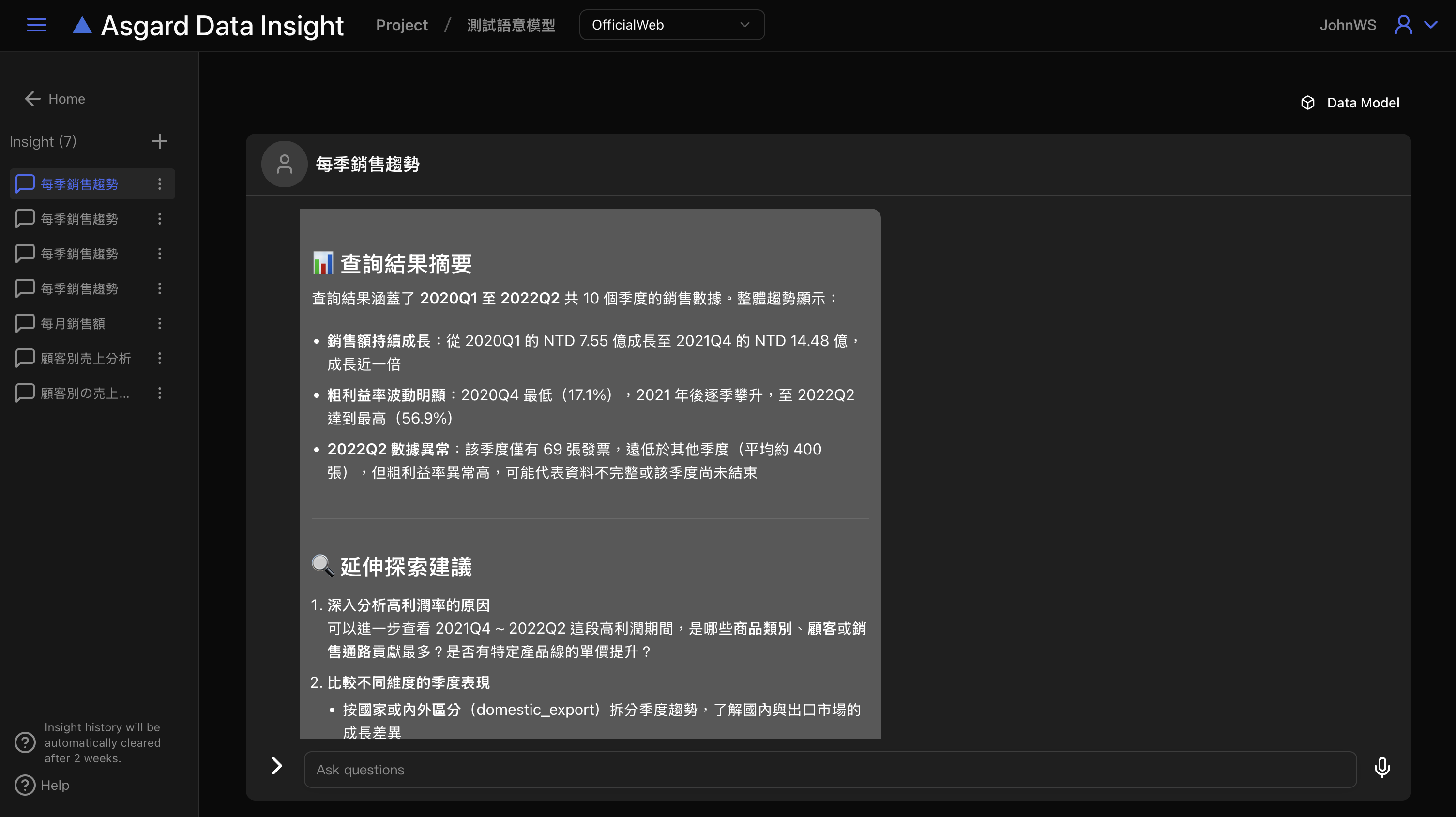 Asgard Data Insight 會自動開啟新的對話,請在底下對話框內輸入問題並送出。