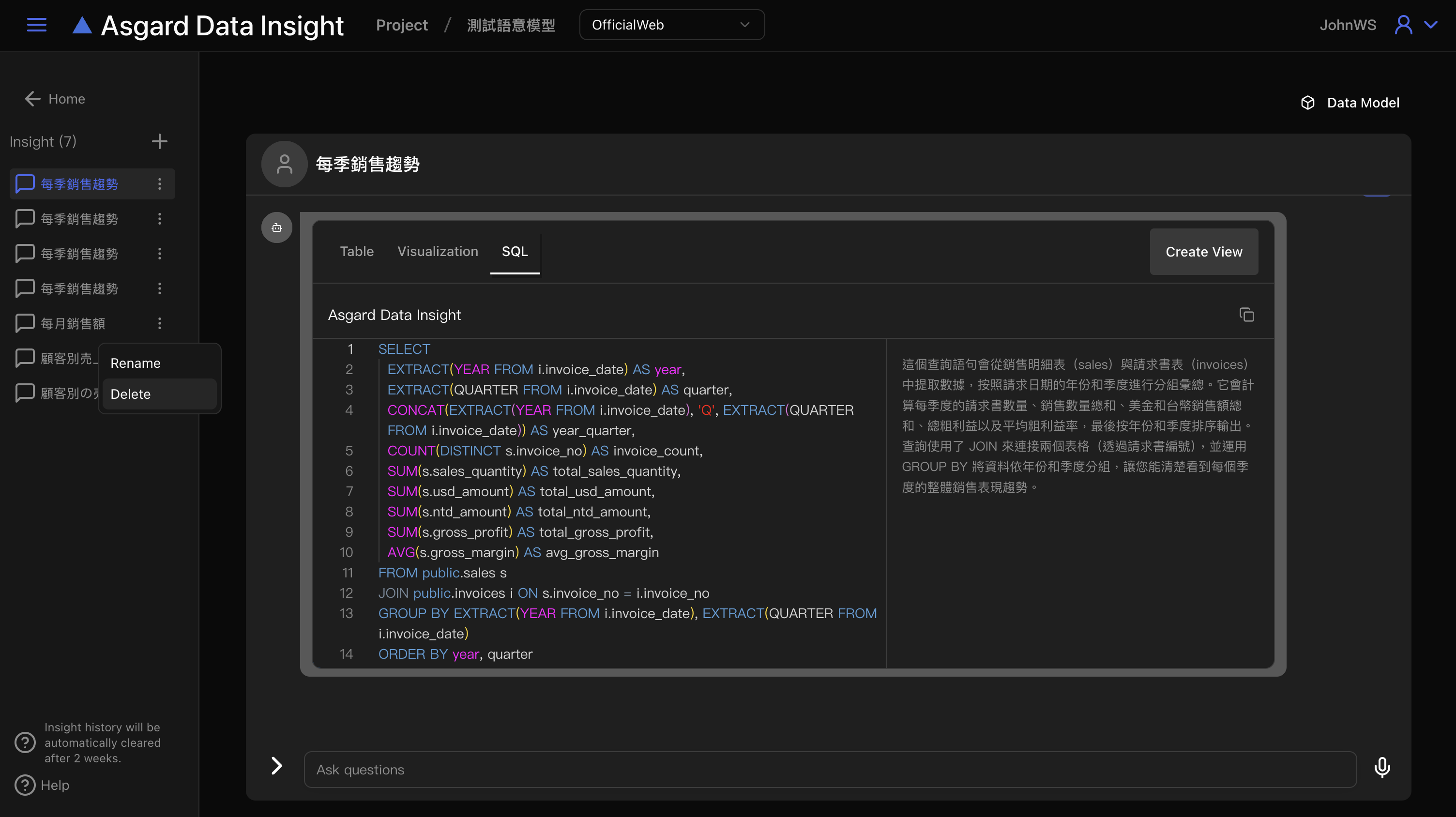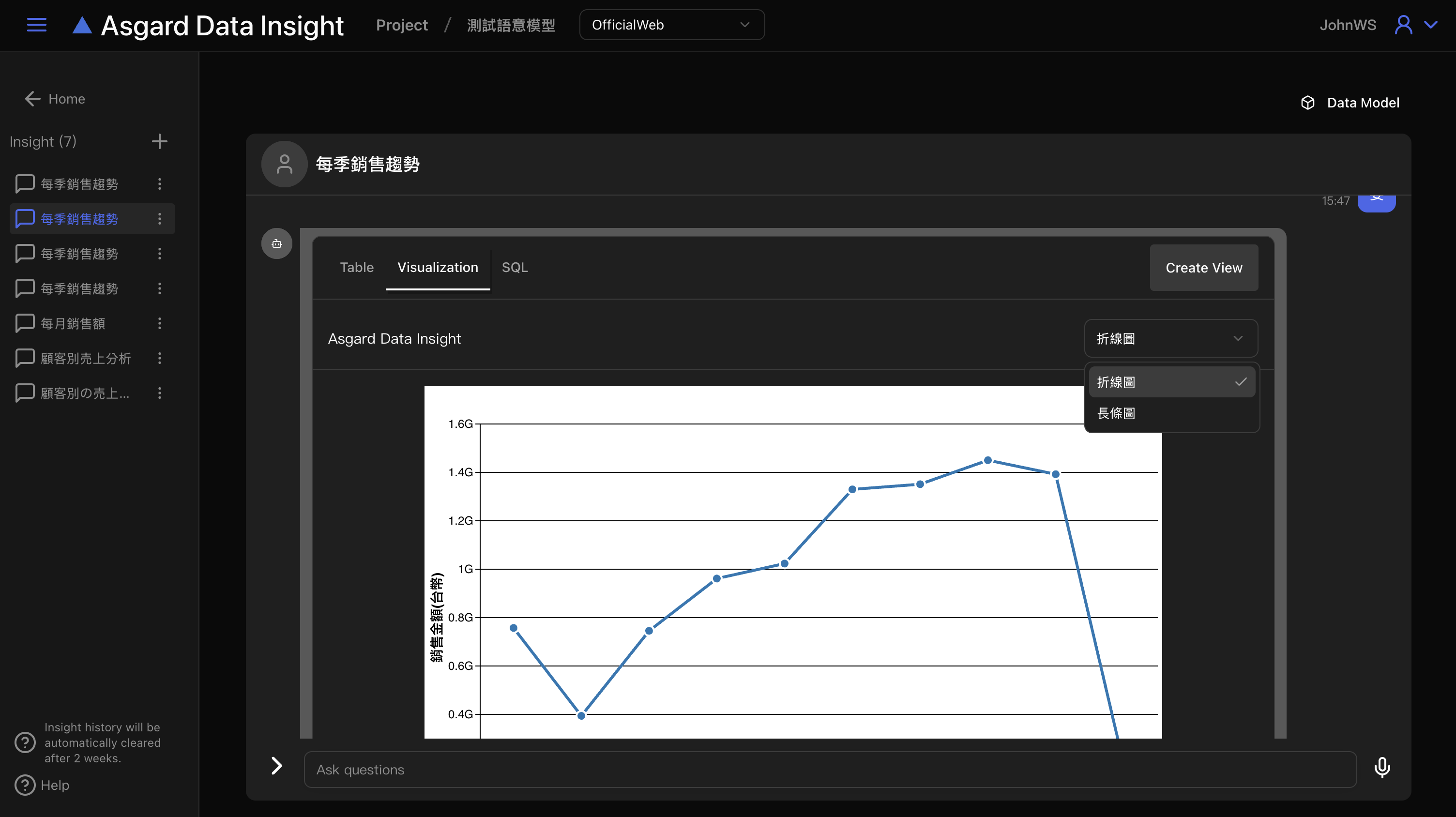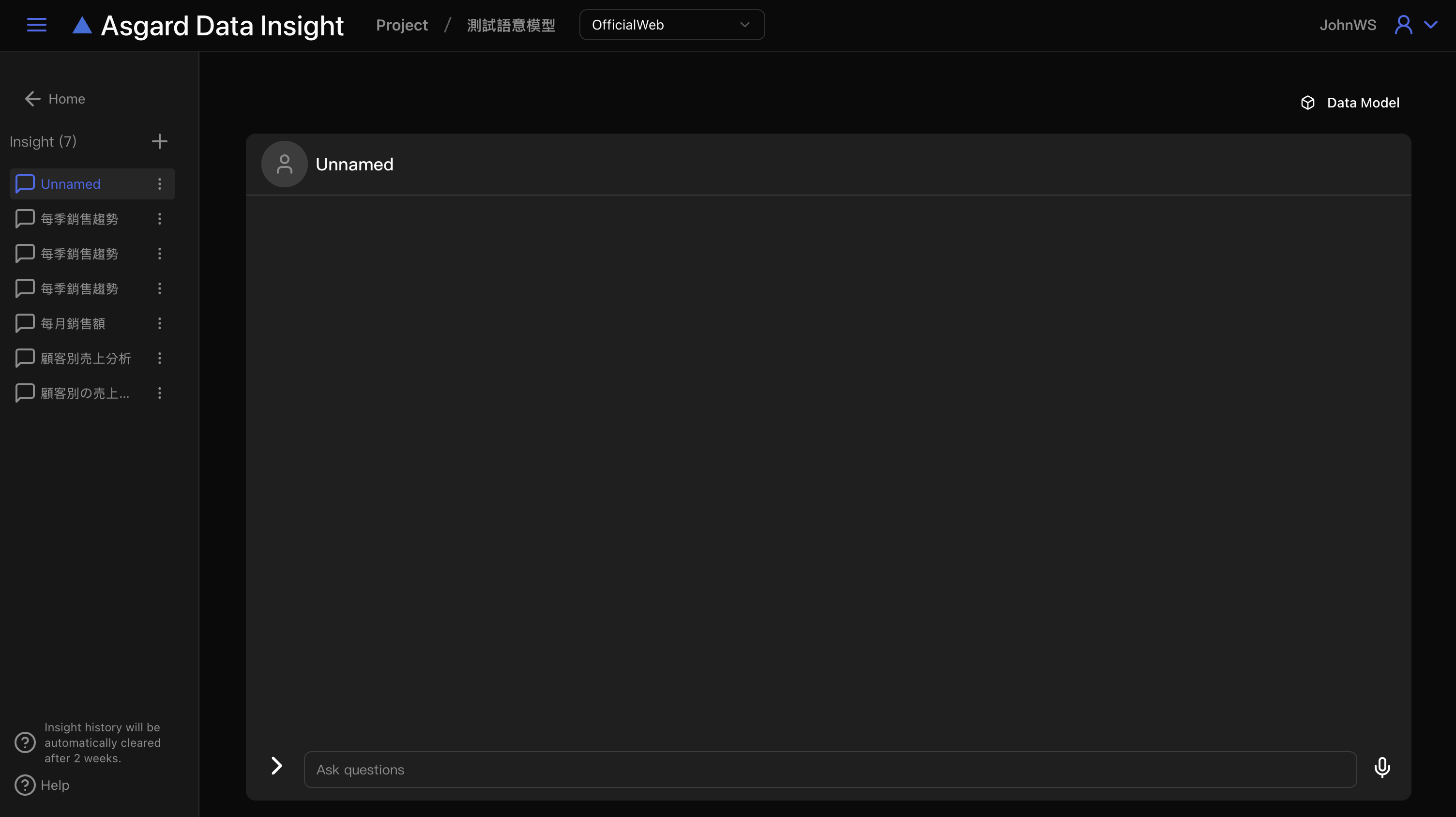 Asgard Data Insight 會自動開啟新的對話,請在底下對話框內輸入問題並送出。