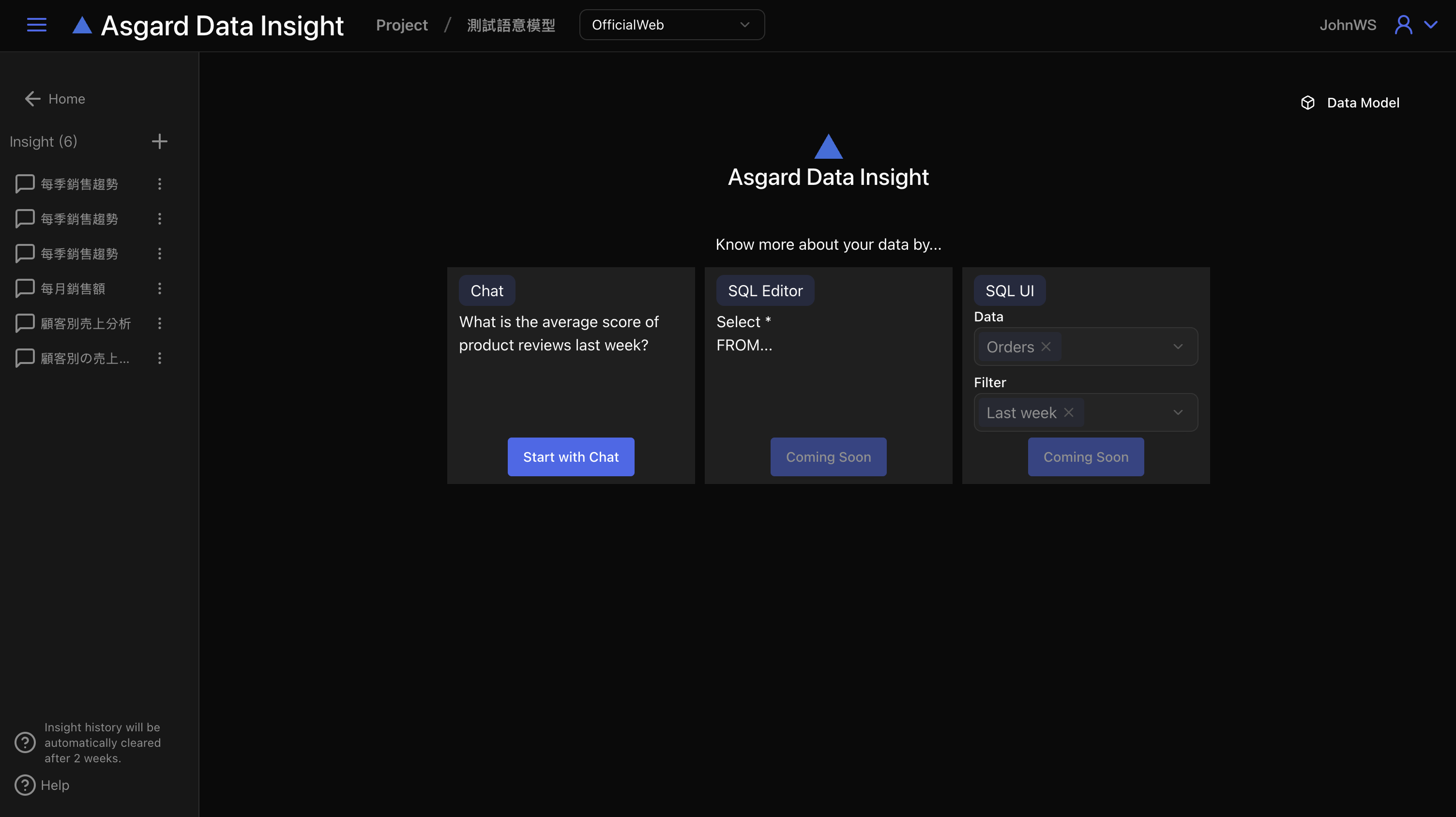 進入 Mimir | Asgard Data Insight 的預設首頁會在新增一個新的 Insight (洞察),您可以直接點擊「Start new Insight」以進入。若專案有多個資料模型,可以在頂端列的模型名稱下拉選單點擊並切換不同的資料模型以繼續。
