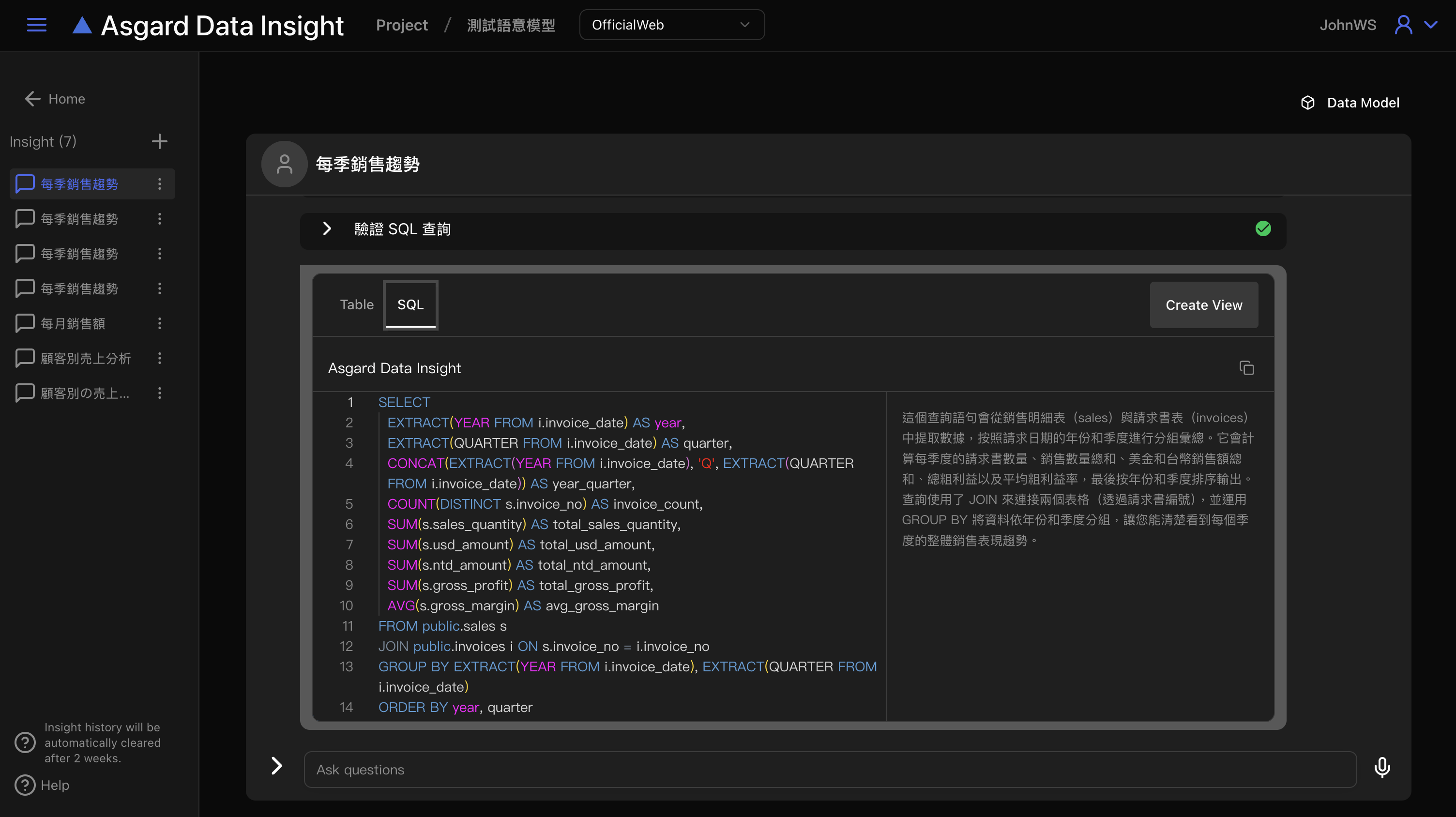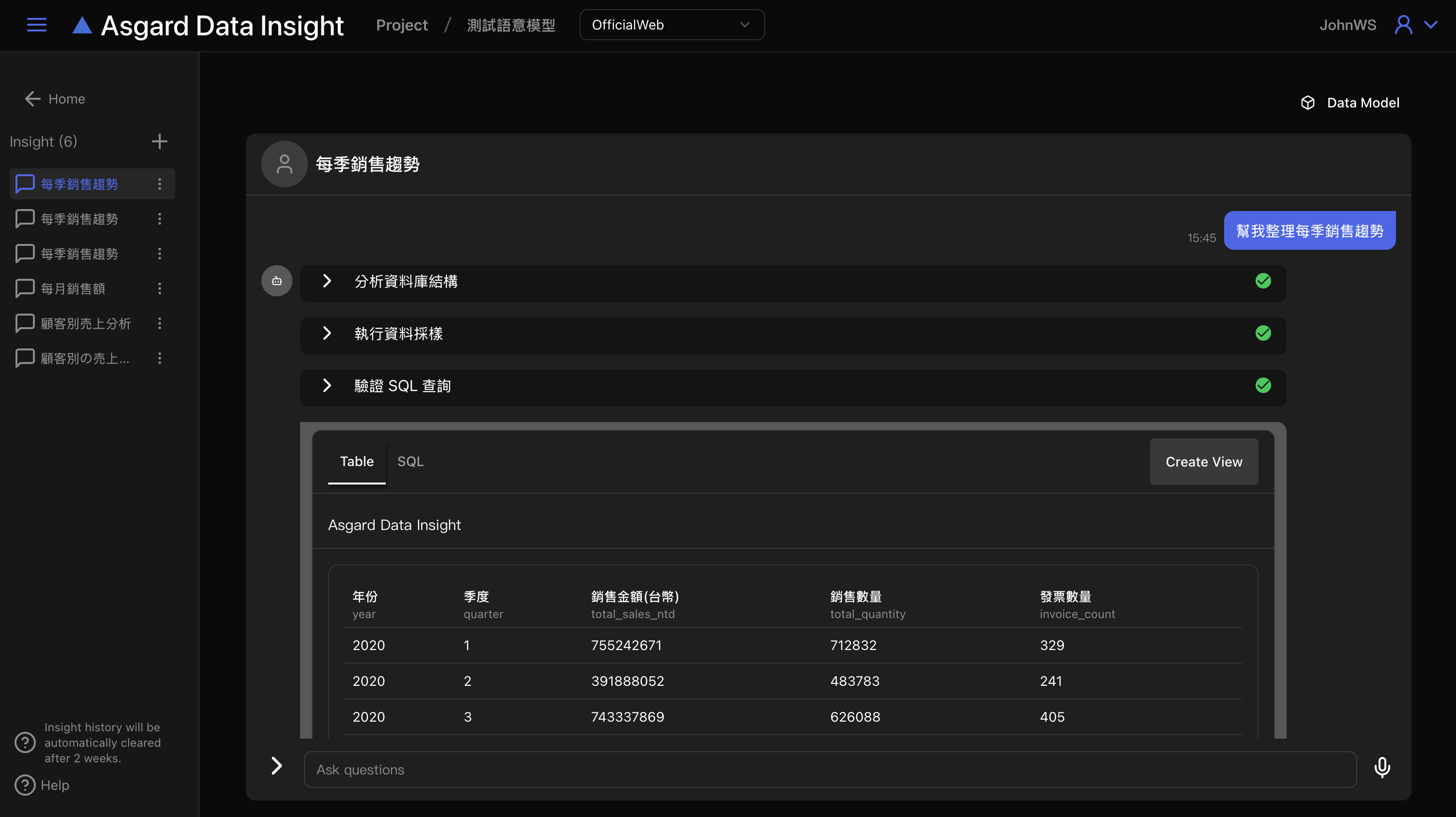 點擊送出後,Data Insight 即會開始進行分析資料庫結構並驗證 SQL 查詢,為問題生成最佳的SQL查詢並顯示查詢資料。