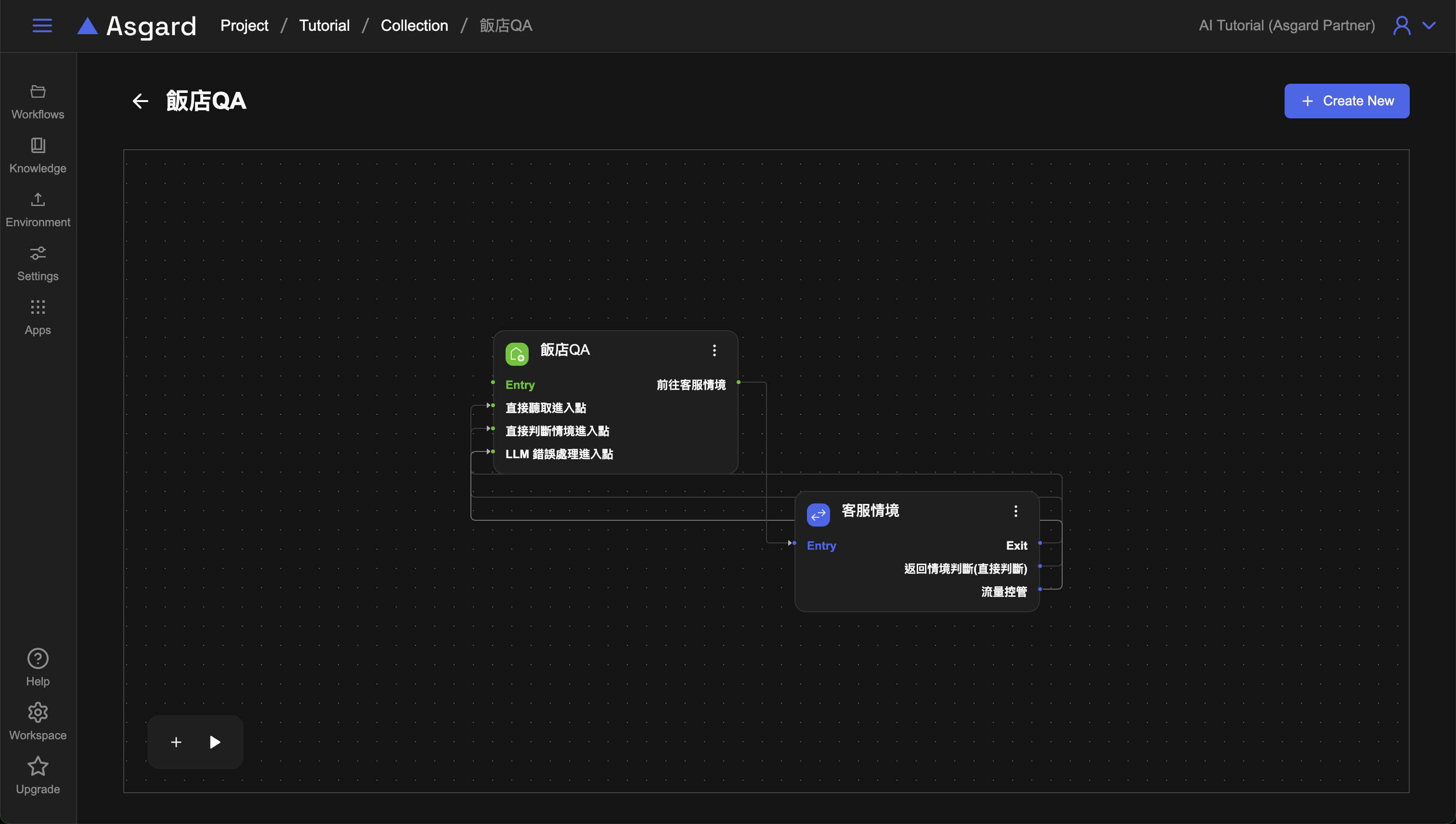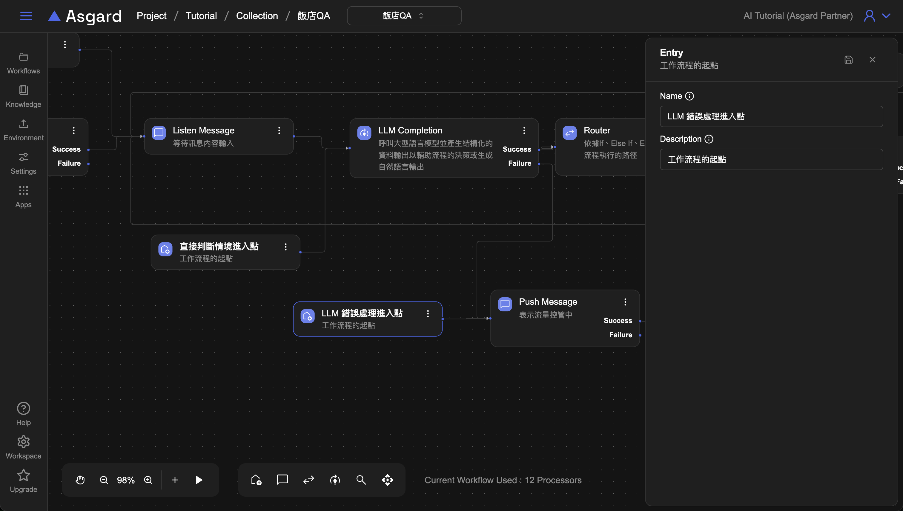 回到飯店 QA 的 Workflow 並新增一個進入點,可直接點擊上方的飯店 QA 回到 Workflow Sets 選取或是使用頂端列的選單切換,新增後修改名稱與描述為「LLM 錯誤處理進入點」,並將該節點連接到原先設定的 Push Message 節點。