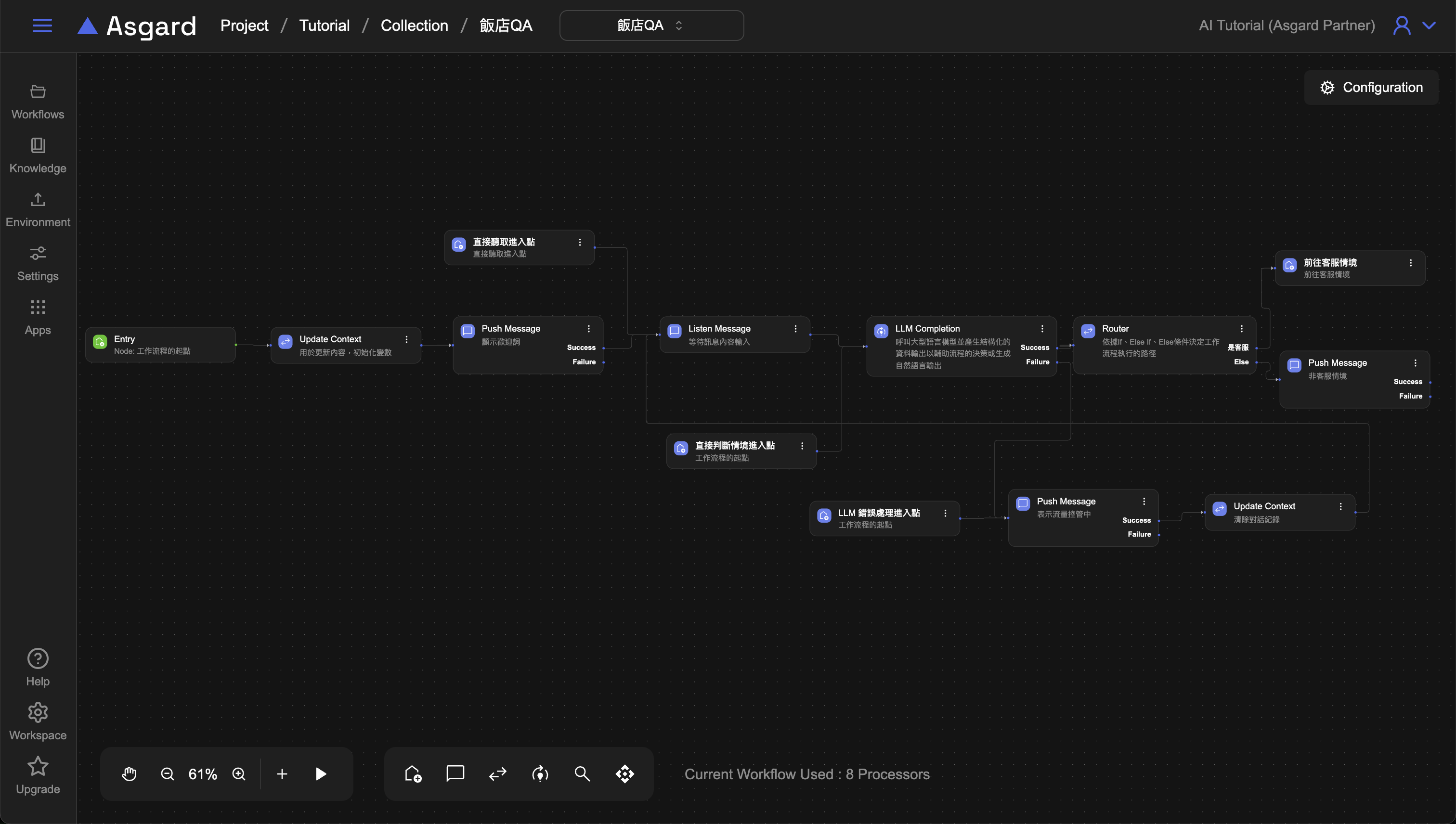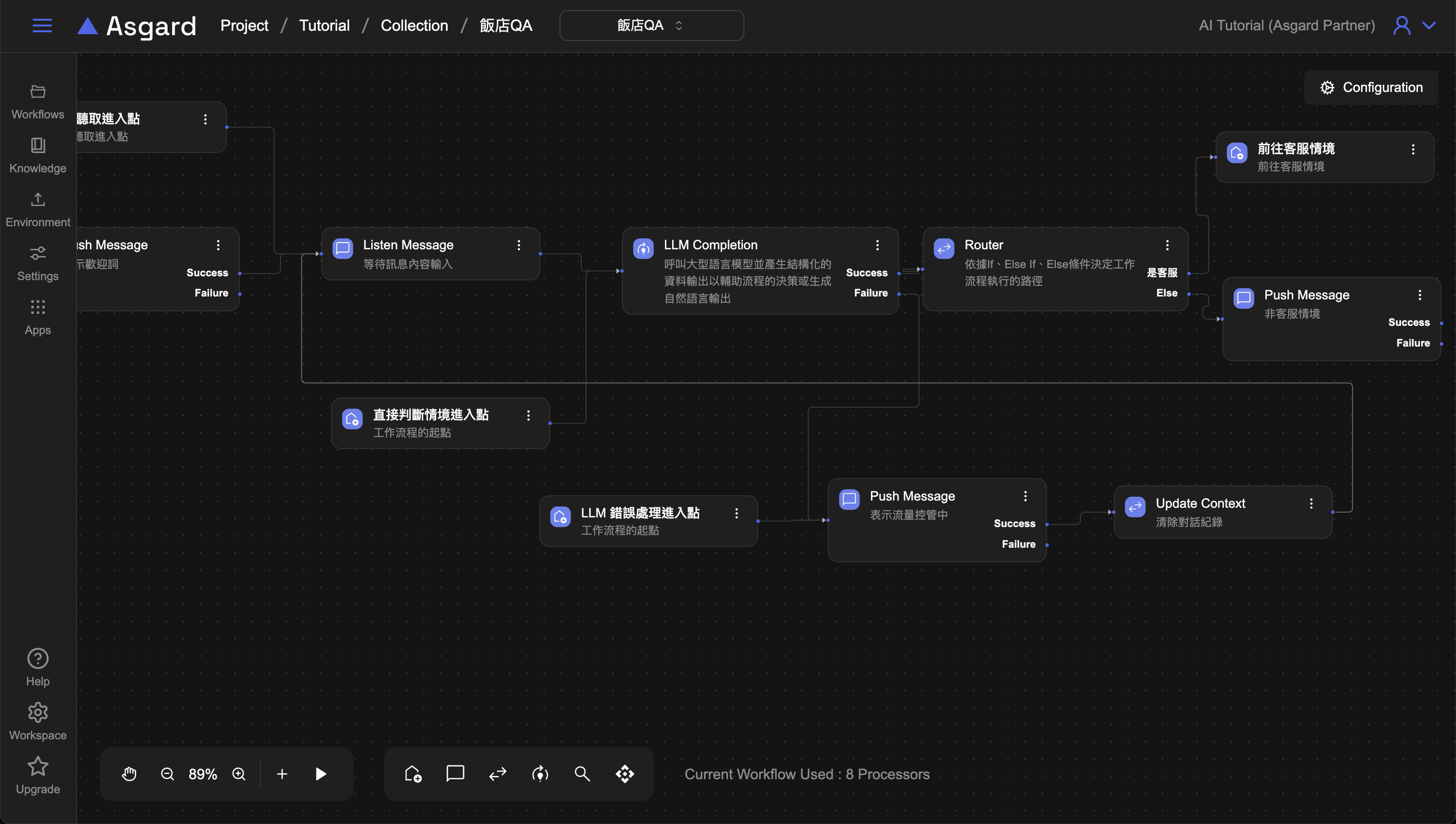 將 Exit(流量控管)與 Entry(LLM 錯誤處理進入點)連接便完成了 LLM 的錯誤流程處理,並能將用戶導向到先前設計的 Push Message 去提示用戶目前流量控管中。