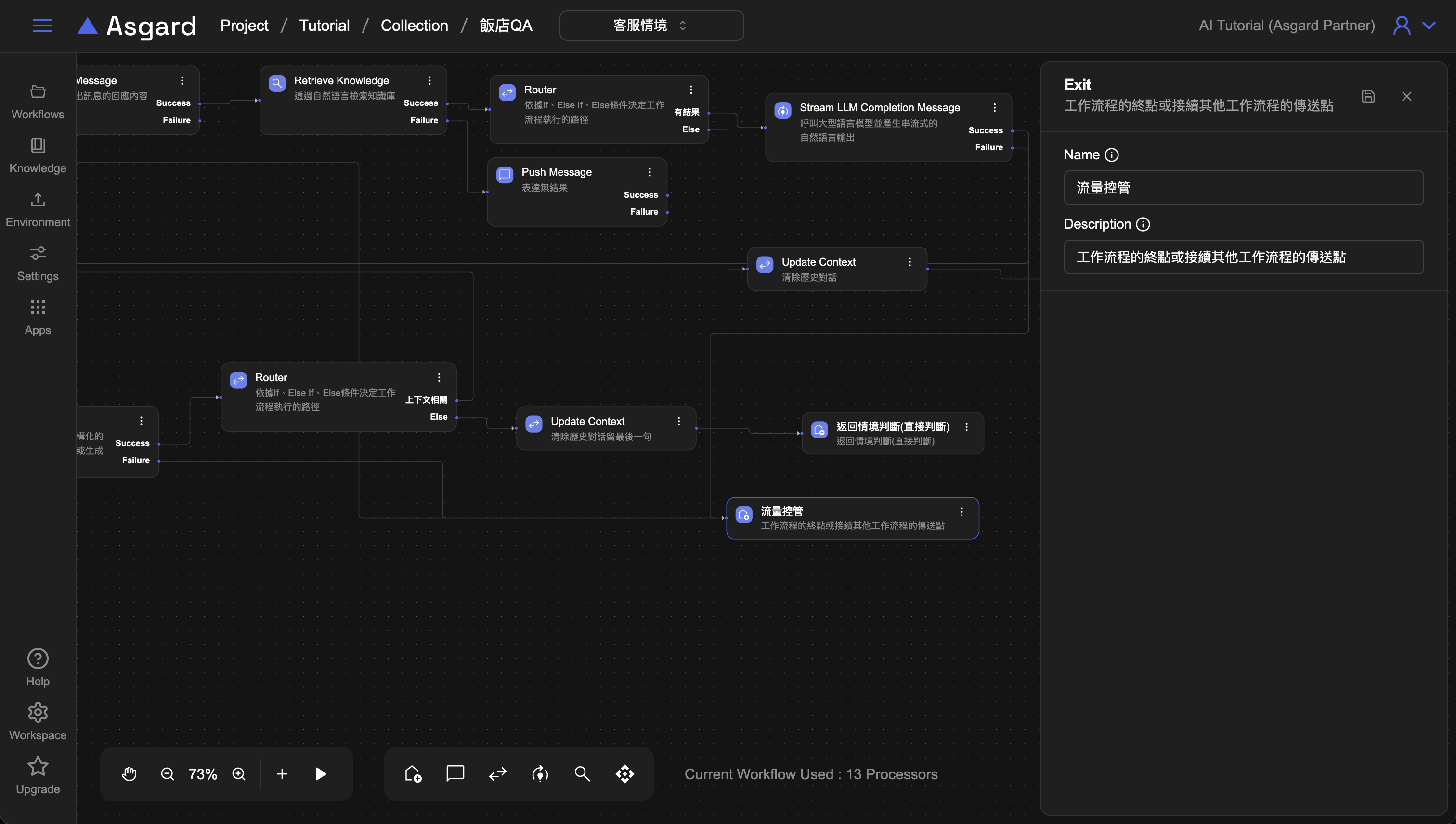 在「客服情境」裡新增Exit並修改名稱與描述為「流量控管」。此時的 Exit 會作為接續其他工作流程的傳送點,統一將有錯誤的 LLM 導向到飯店 QA 的錯誤提示訊息流程。請將客服情境中有關 LLM Completion 處理 Failure 的節點連接到「流量控管」的傳送點。
