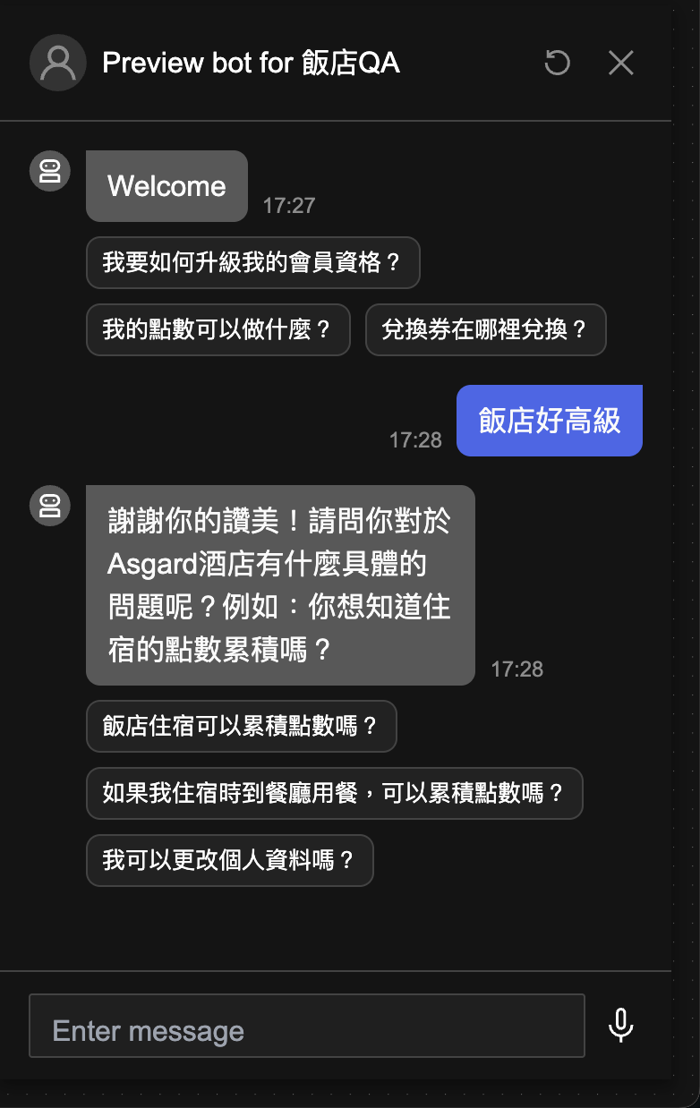 點擊 Preview 來預覽,測試用戶輸入與飯店服務不相關的問題時,客服 AI 可以順著用戶的問題回覆,並生成相關追問選項讓用戶可以點擊相似問題並繼續使用。
