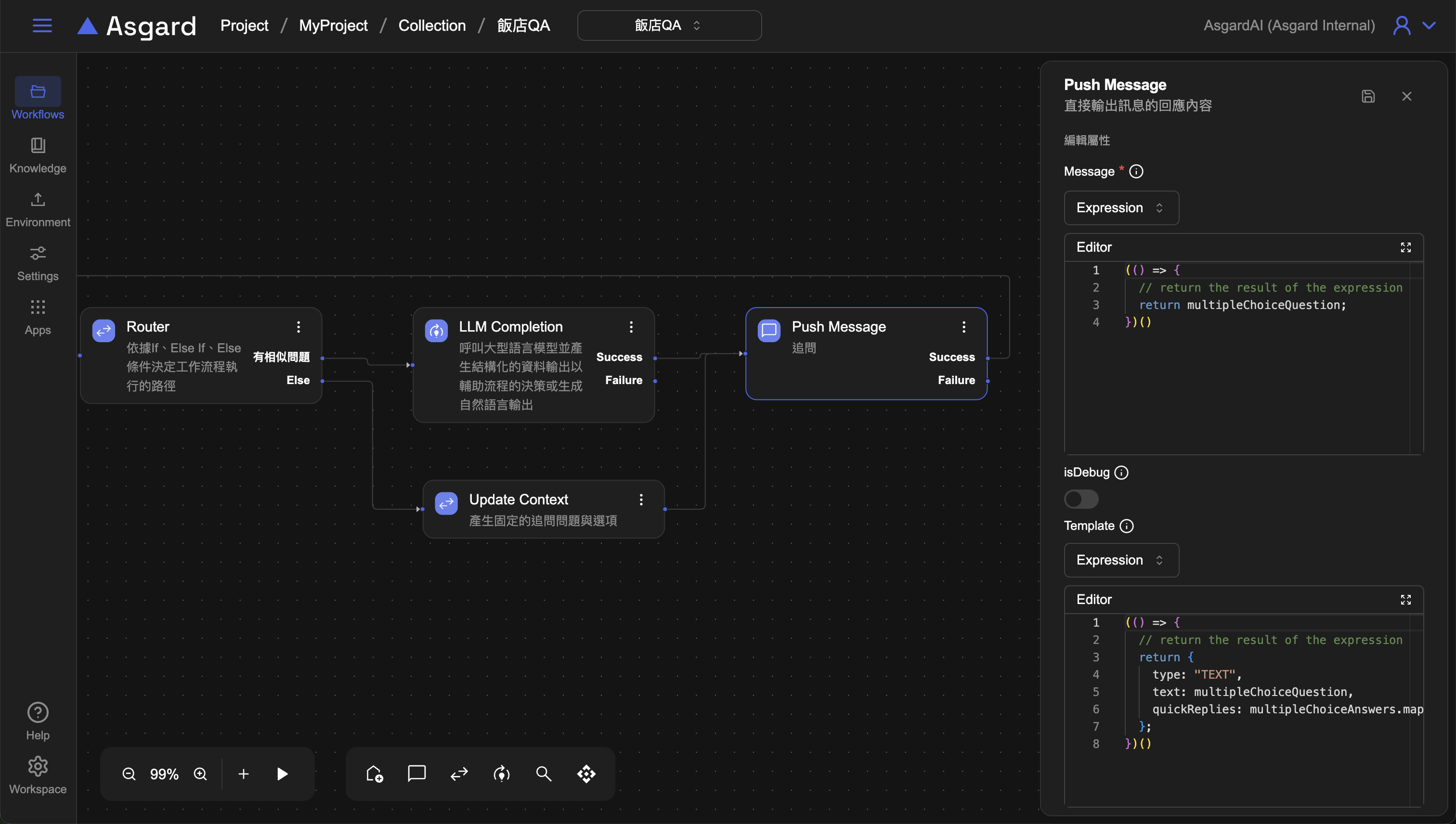 history為 Asgard 內建函數,historyStart 為先前在 Update Context 裡所新增的變數,-1 是指算到上一個對話為止,因此這裡是在告訴 LLM 用戶的歷史對話紀錄是從 historyStart 到上一個對話,也就是上一步的 Listen Message 用戶輸入的問題。toJson是 Asgard 內建函數,由於 relatedFaqs 是陣列,此處使用 toJson 將 relatedFaqs 轉成 JSON。