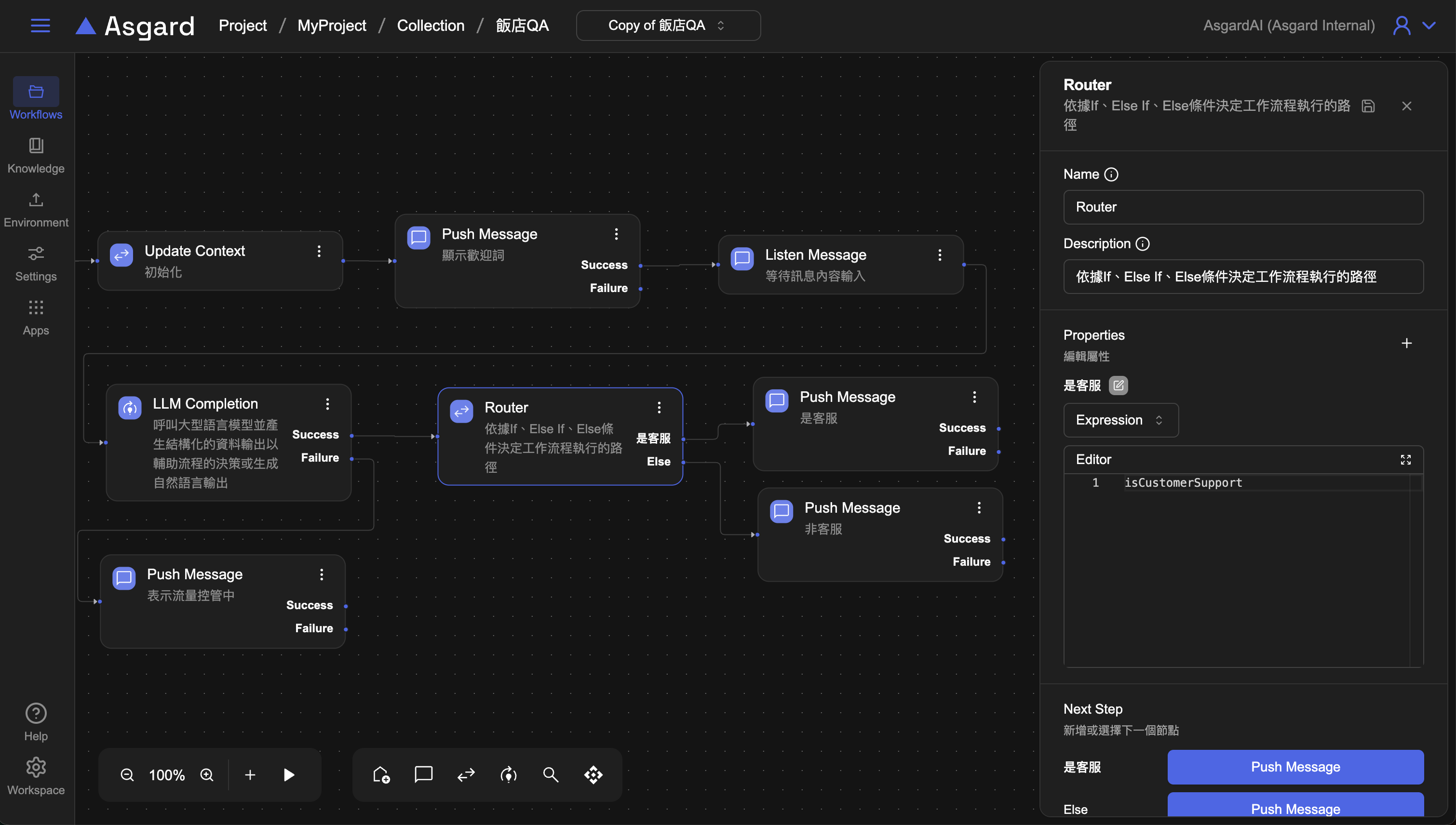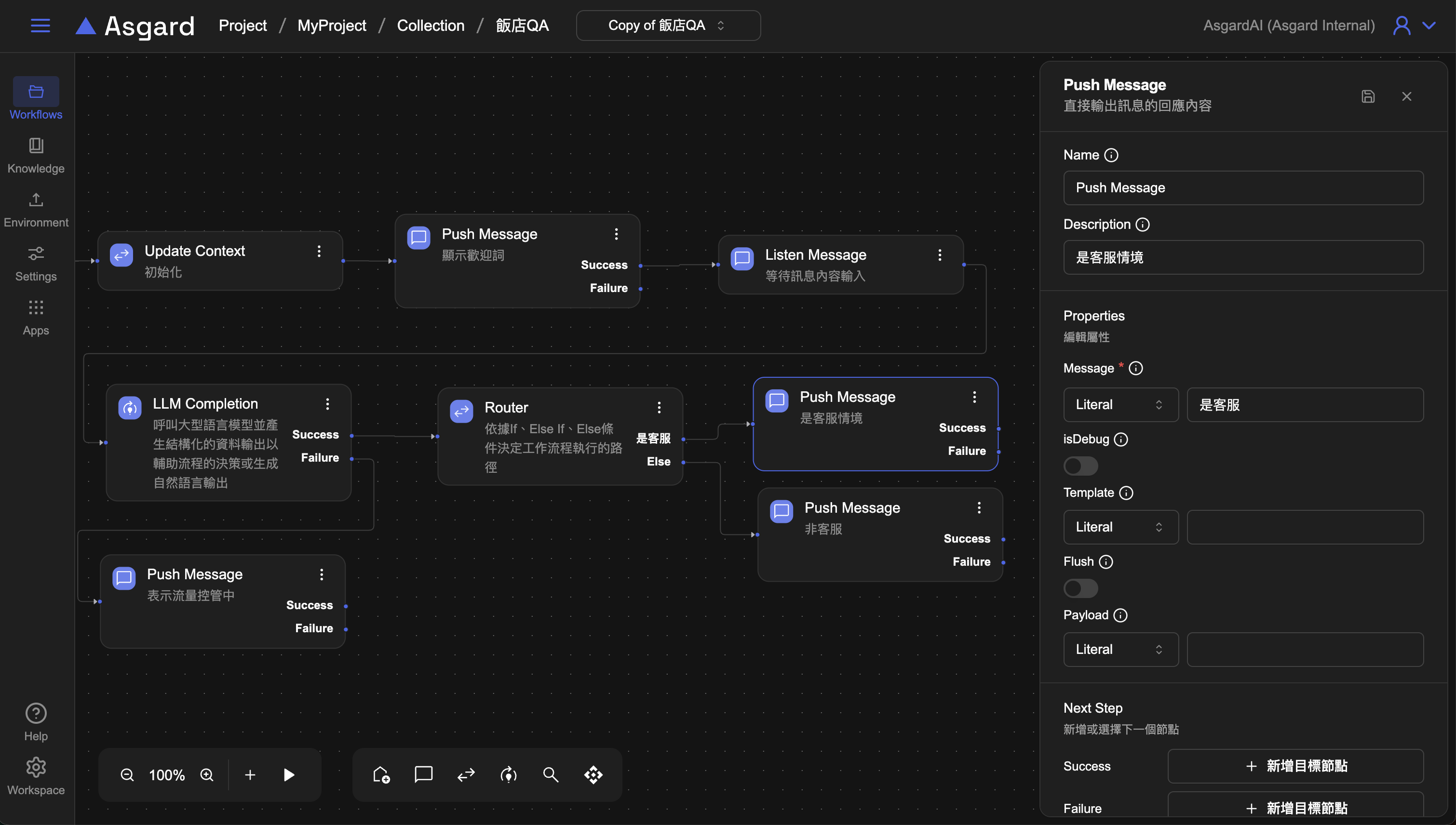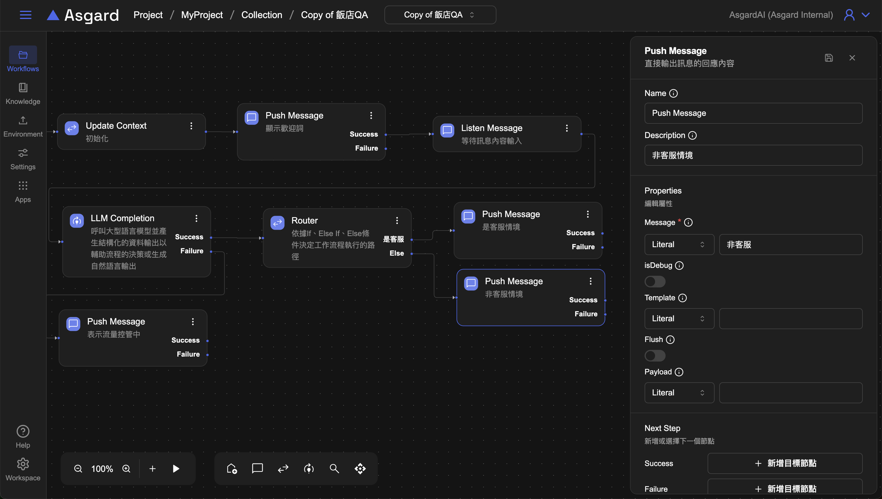 Push Message ,LLM 調用外部 AI model,通常會有調用成功與失敗兩種情況,當 Success 成立,就接到下一步的 Router 處理,當 Fail 時,可以加上 Push Message 來提示用戶。
