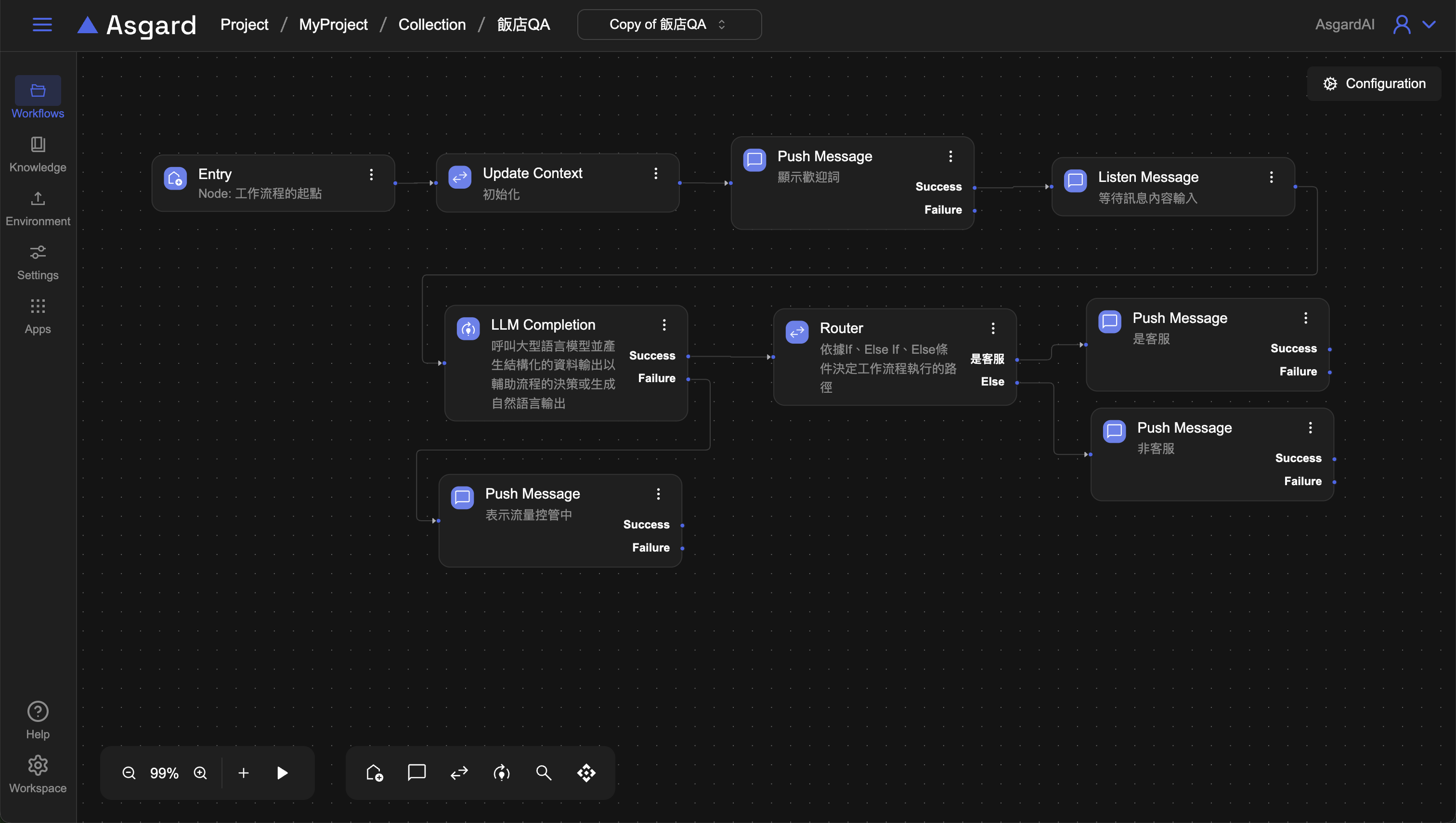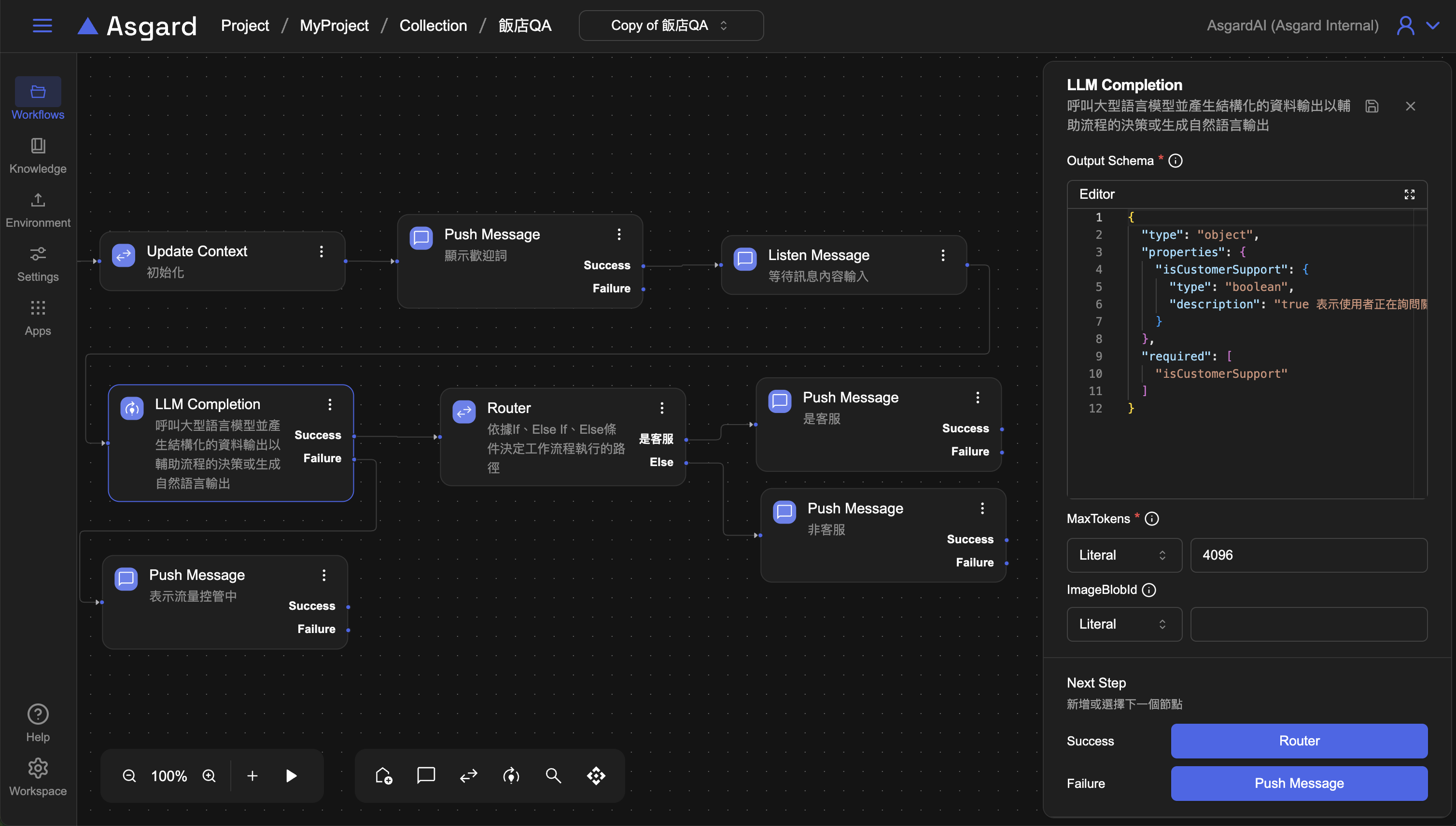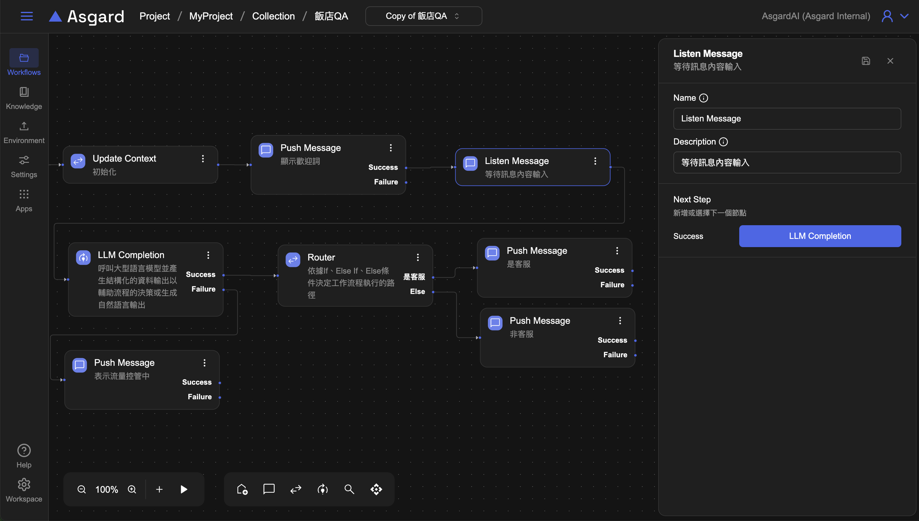 Push Message ,LLM 調用外部 AI model,通常會有調用成功與失敗兩種情況,當 Success 成立,就接到下一步的 Router 處理,當 Fail 時,可以加上 Push Message 來提示用戶。
