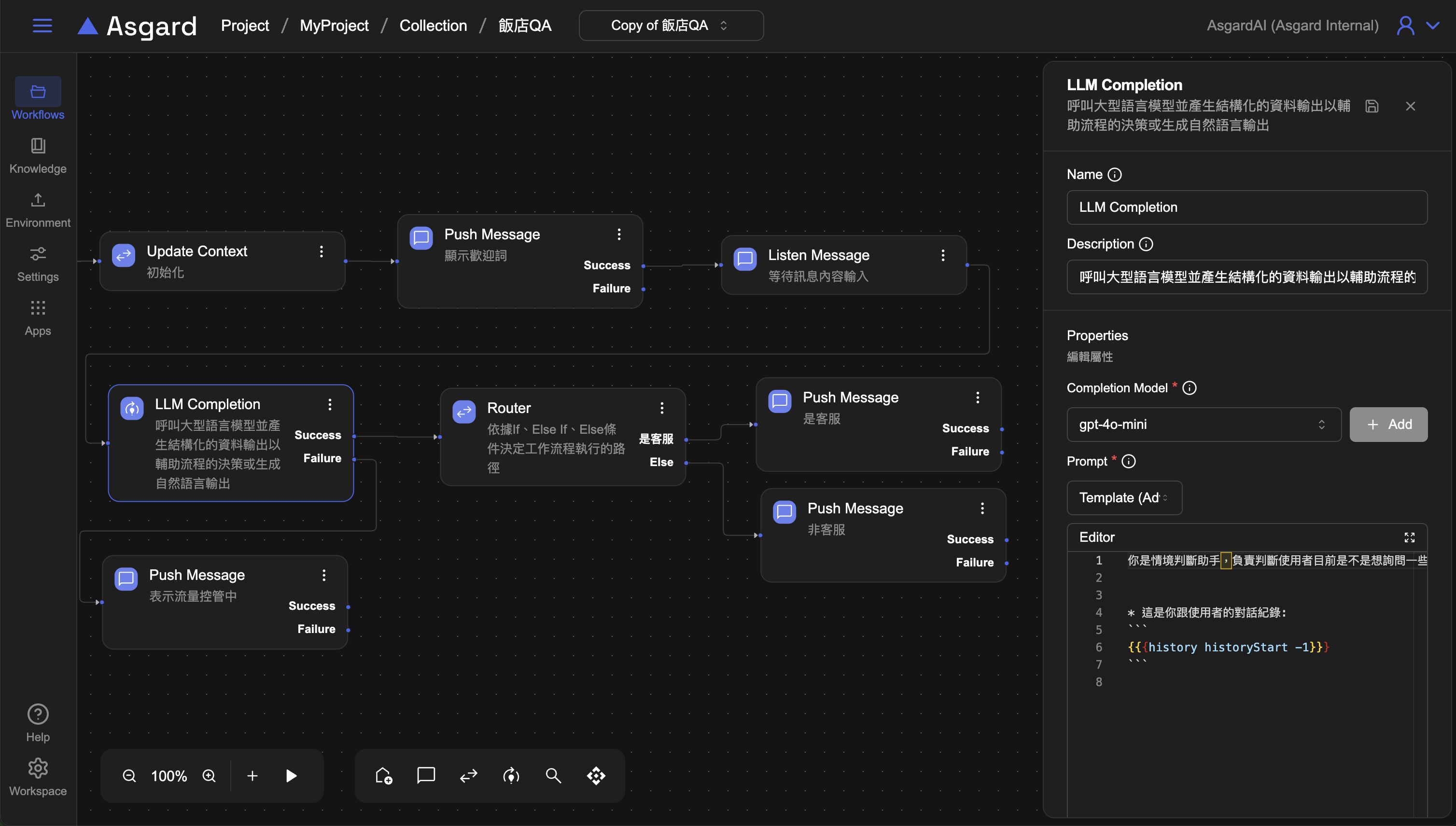 history為 Asgard 內建函數,historyStart 為步驟 2 時在 Update Context 裡所新增的變數,-1 是指算到上一個對話為止,因此這裡是在告訴 LLM 用戶的歷史對話紀錄是從 historyStart 到上一個對話,也就是步驟 4 的 Listen Message 用戶輸入的問題。