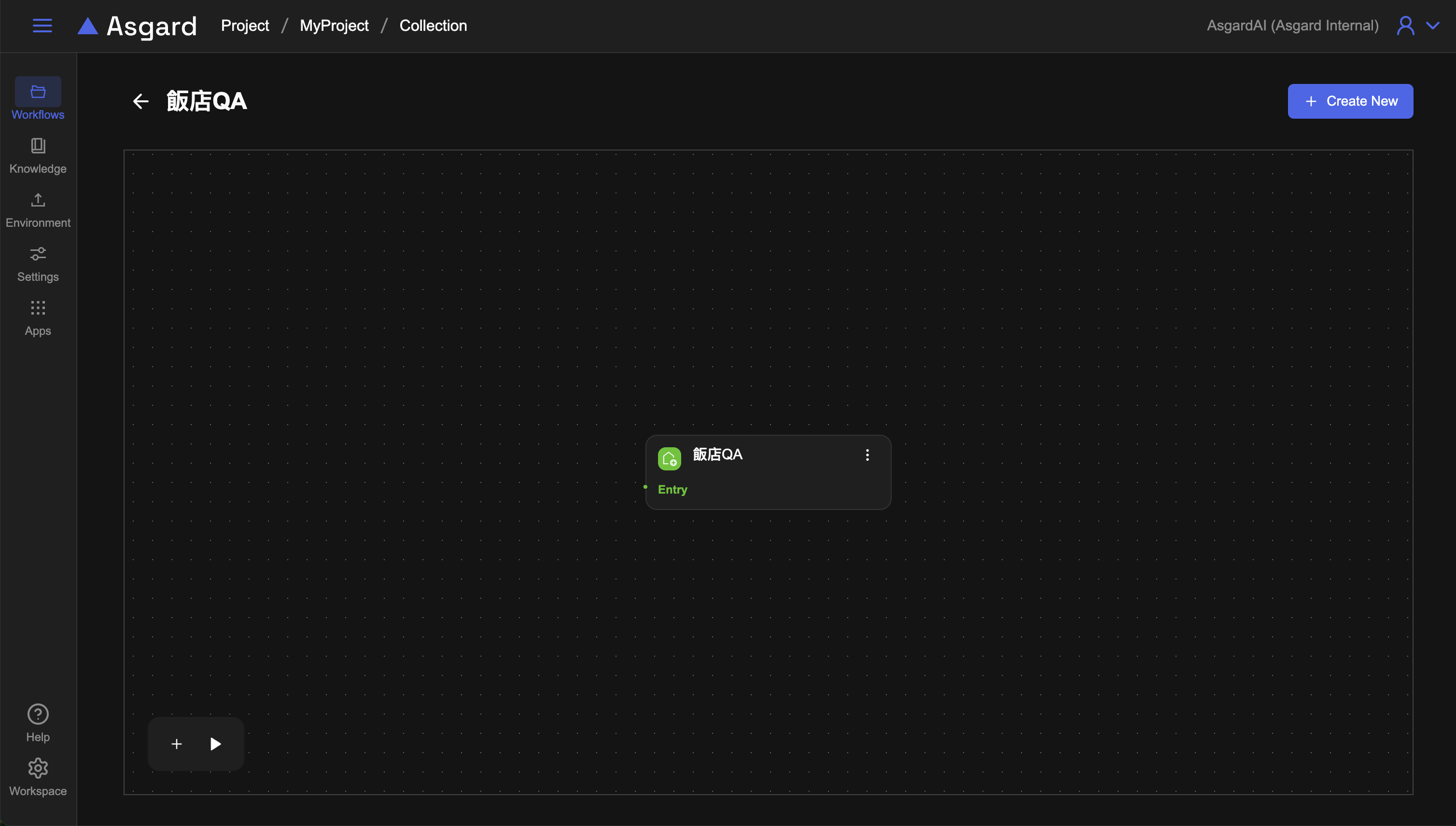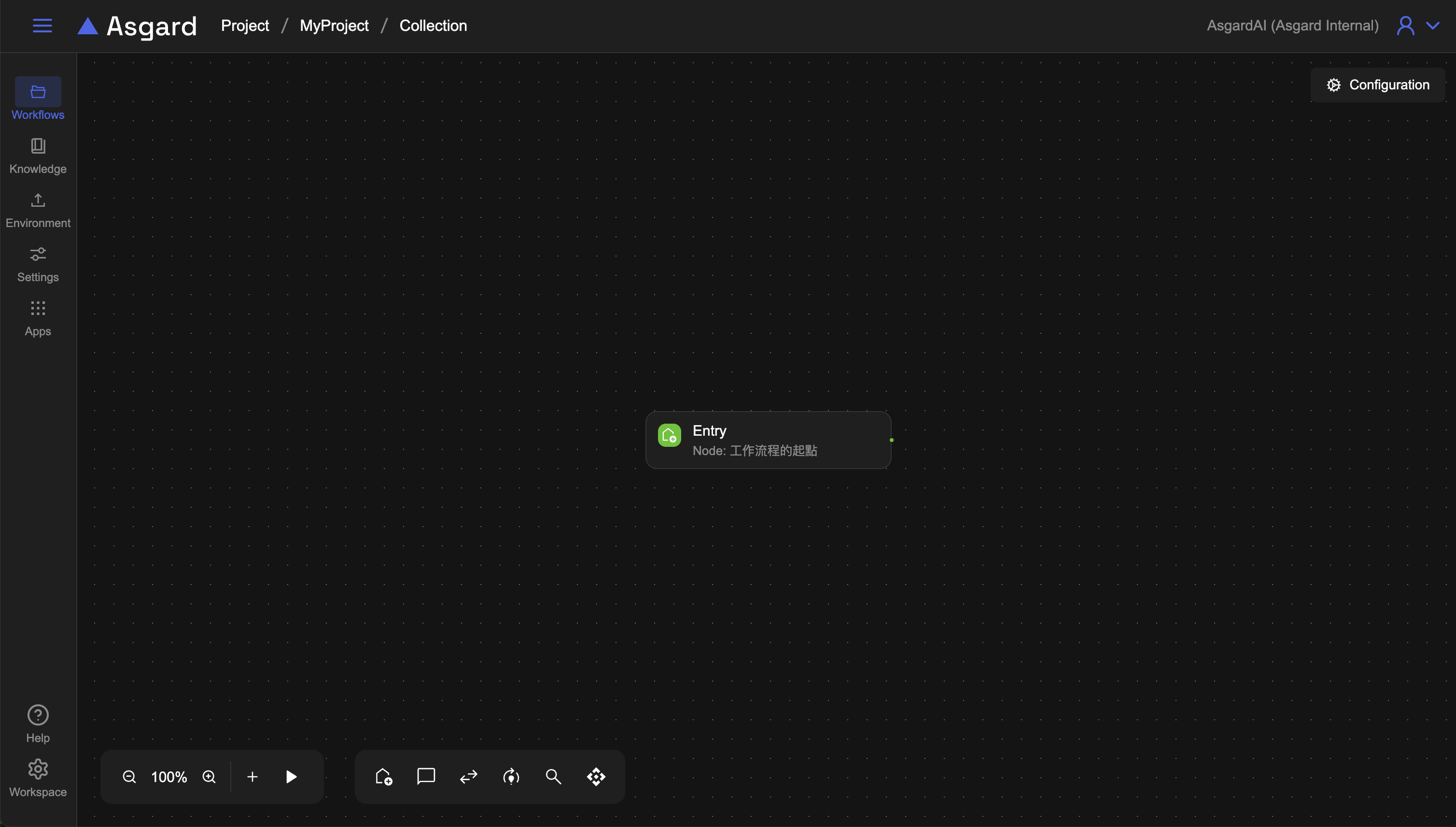 點擊該 workflow 進入 workflow 工作區,此處 Asgard 已經預設幫您建好了初始的工作流程起點。