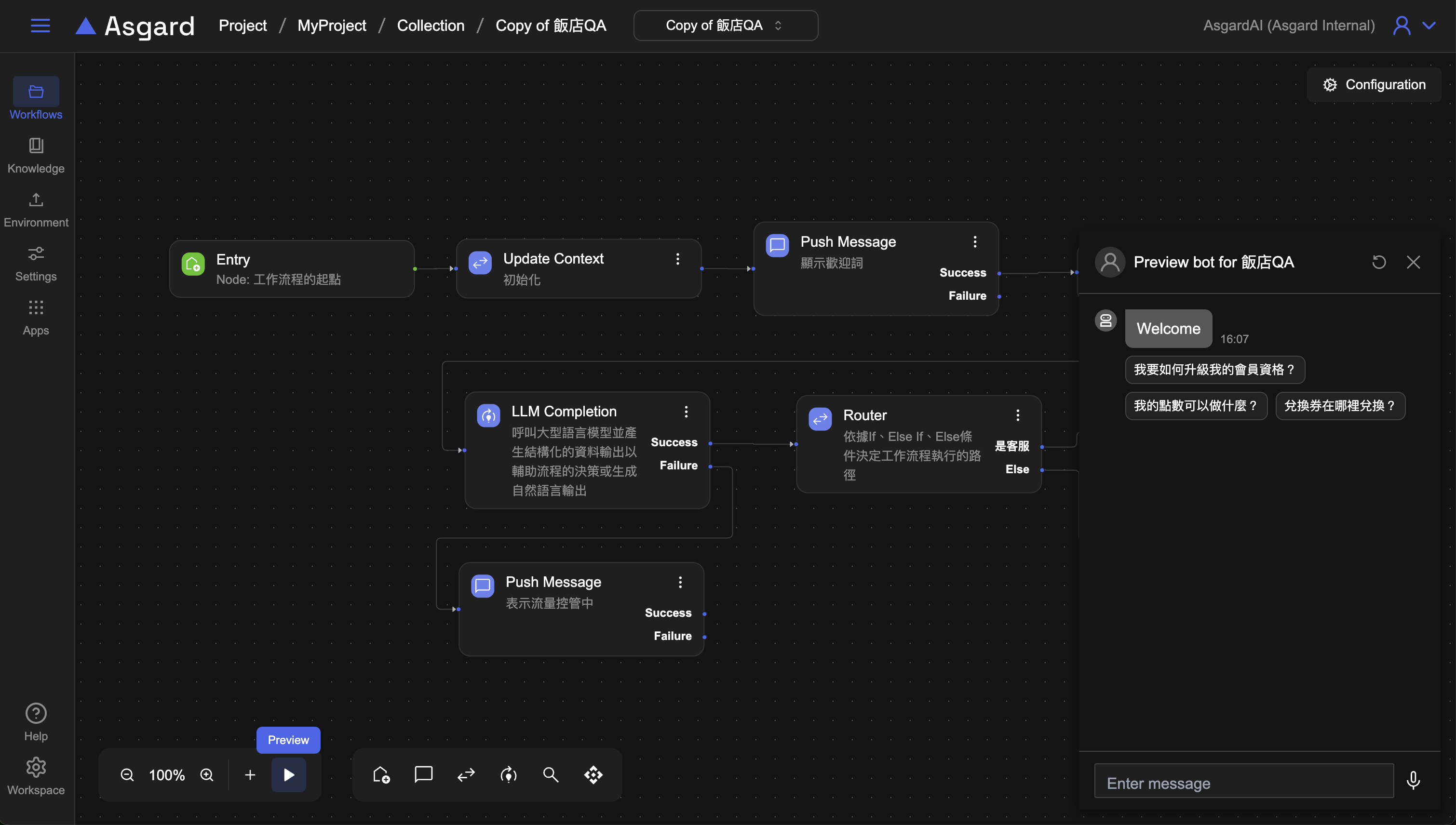 點擊 Preview 來預覽剛剛編排好的工作流程,若執行成功應可順利看到以下飯店 QA 的 Bot。接著就可以測試 AI 是否能正常判斷用戶的問題為客服問題或非客服問題。