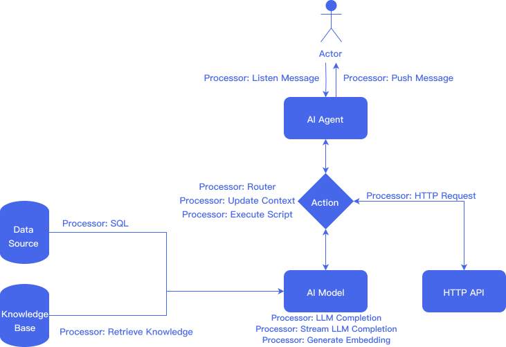 • 需要處理 AI Model 相關的工作時,您可以使用模型類型的 Processor 如大型語言模型(LLM Completion)、串流大型語言模型(Stream LLM Completion)、產生嵌入 Embedding(Generate Embedding)。