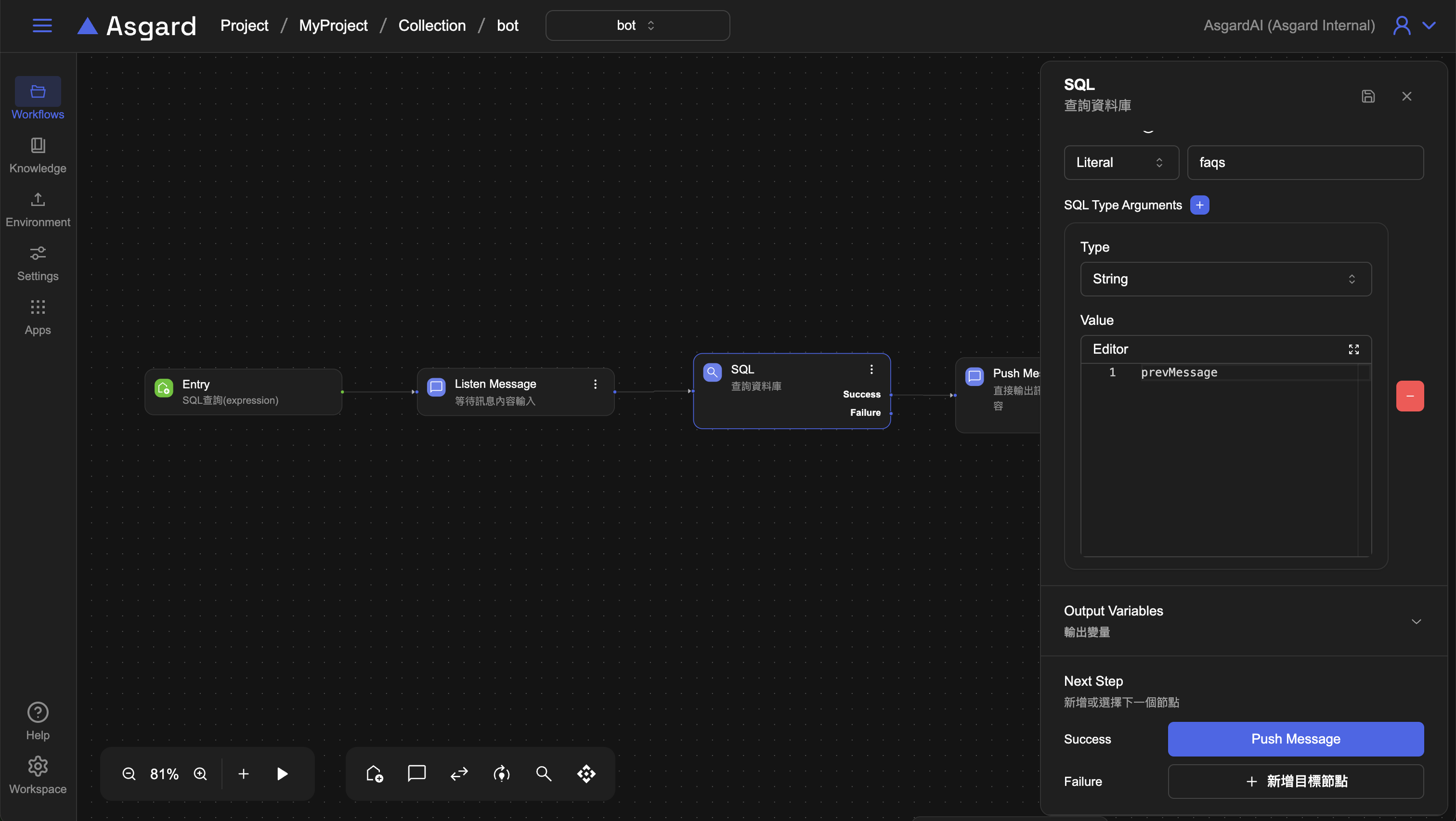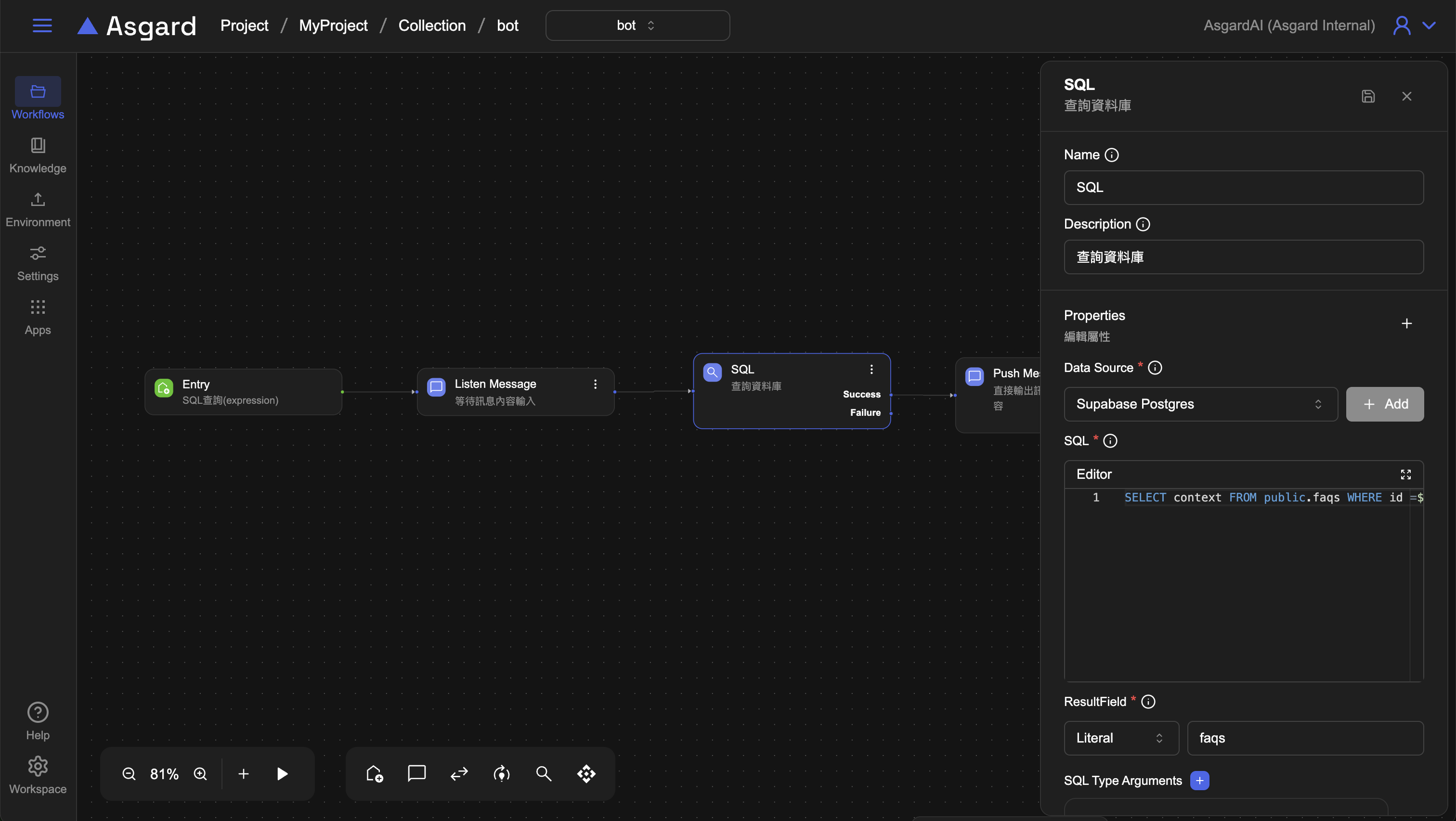 常見的AI應用通常都會與用戶互動去聆聽用戶的訊息或是輸入的資料來進一步操作,Asgard內建的函數可以幫助設計互動性高的工作流程。本章範例示範讓用戶輸入一個訊息並查詢資料庫後印出對應內容。