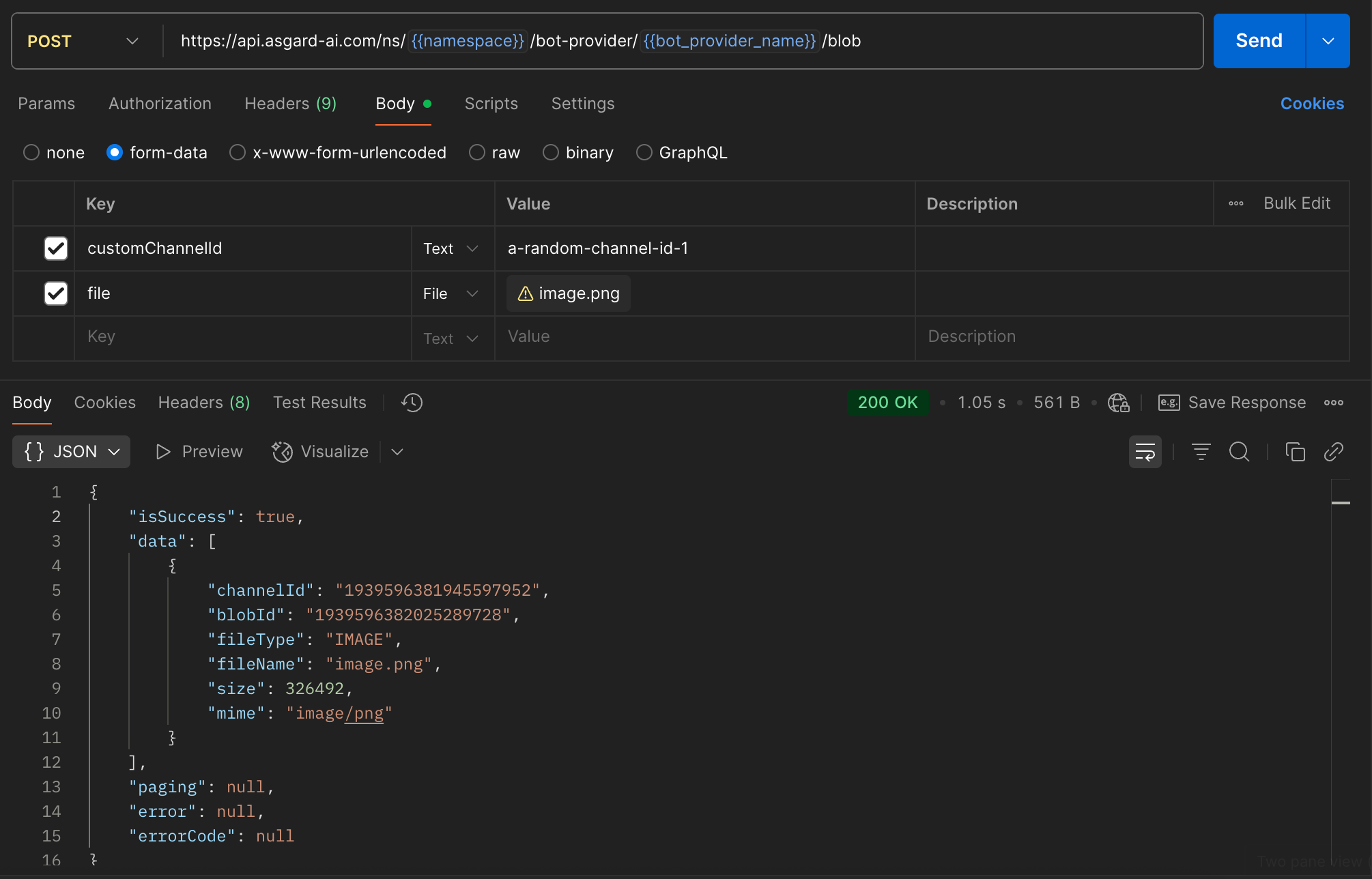 • blobIds:上傳檔案完成時取得的 blobId,可傳入多個檔案 ID,用陣列格式