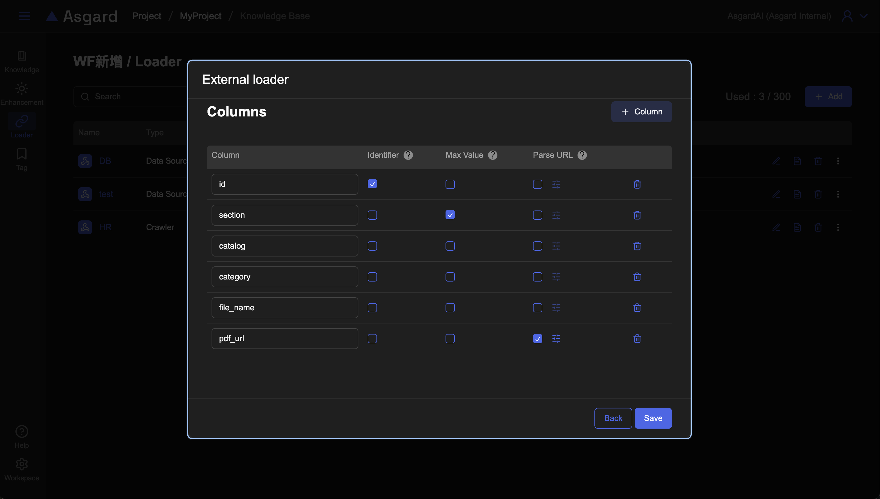 請點擊「+Column」來設定資料來源的對應匯入欄位,並勾選是否作為唯一識別的欄位(可多選)以及勾選用於最大值(Max Value)的欄位(單選),如為特殊的欄位例如檔案的 URL,可以勾選是否需要解析該 URL 欄位。
