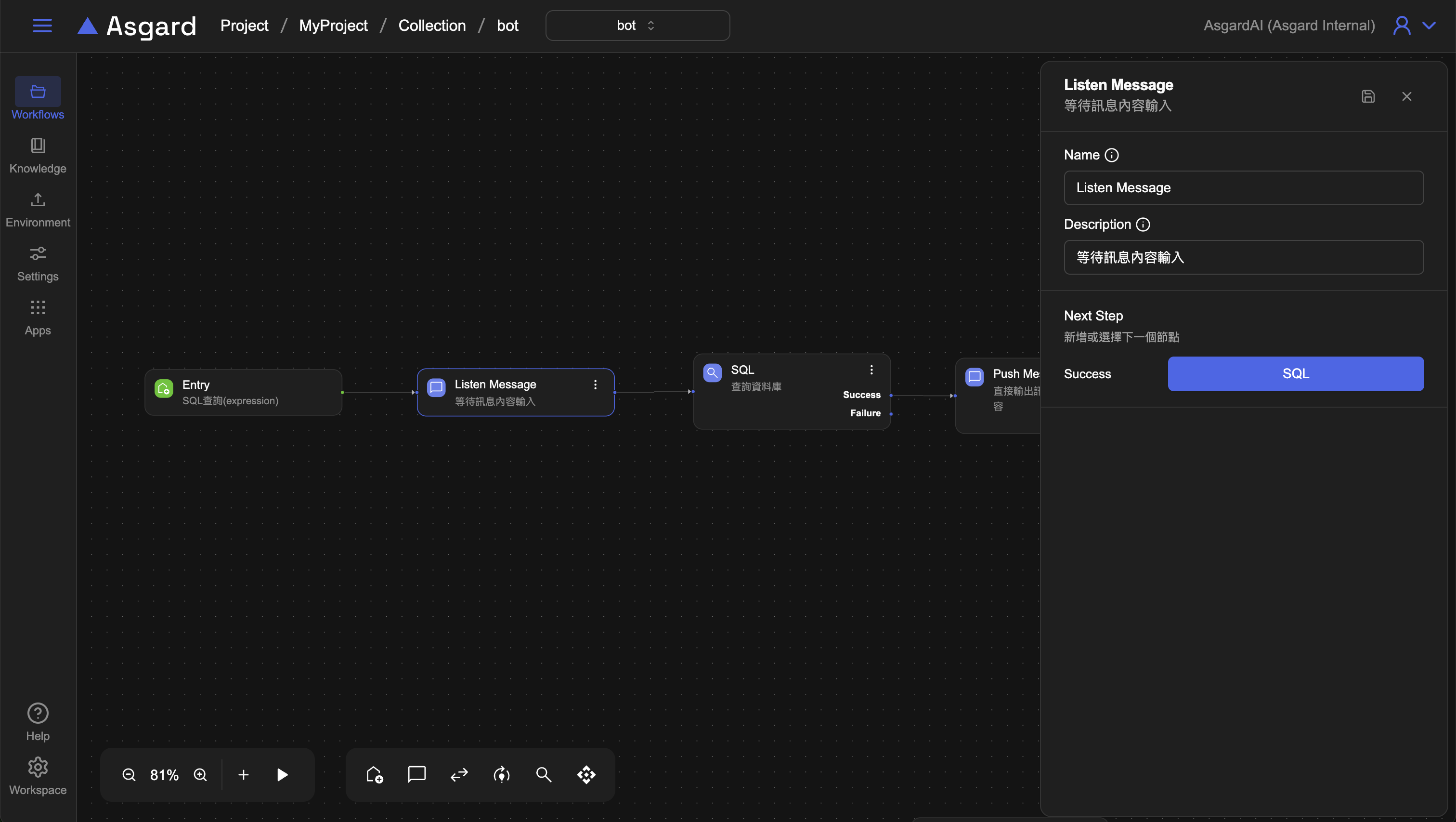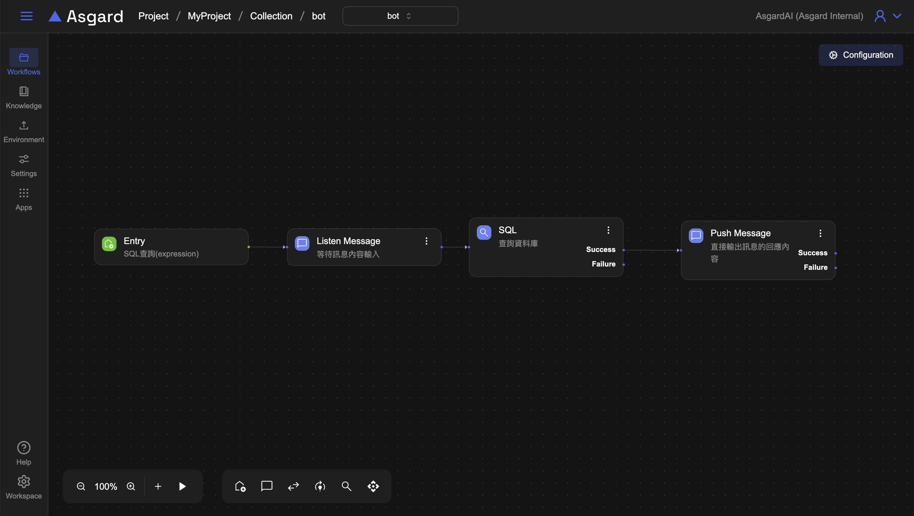 常見的AI應用通常都會與用戶互動去聆聽用戶的訊息或是輸入的資料來進一步操作,Asgard內建的函數可以幫助設計互動性高的工作流程。本章範例示範讓用戶輸入一個訊息並查詢資料庫後印出對應內容。