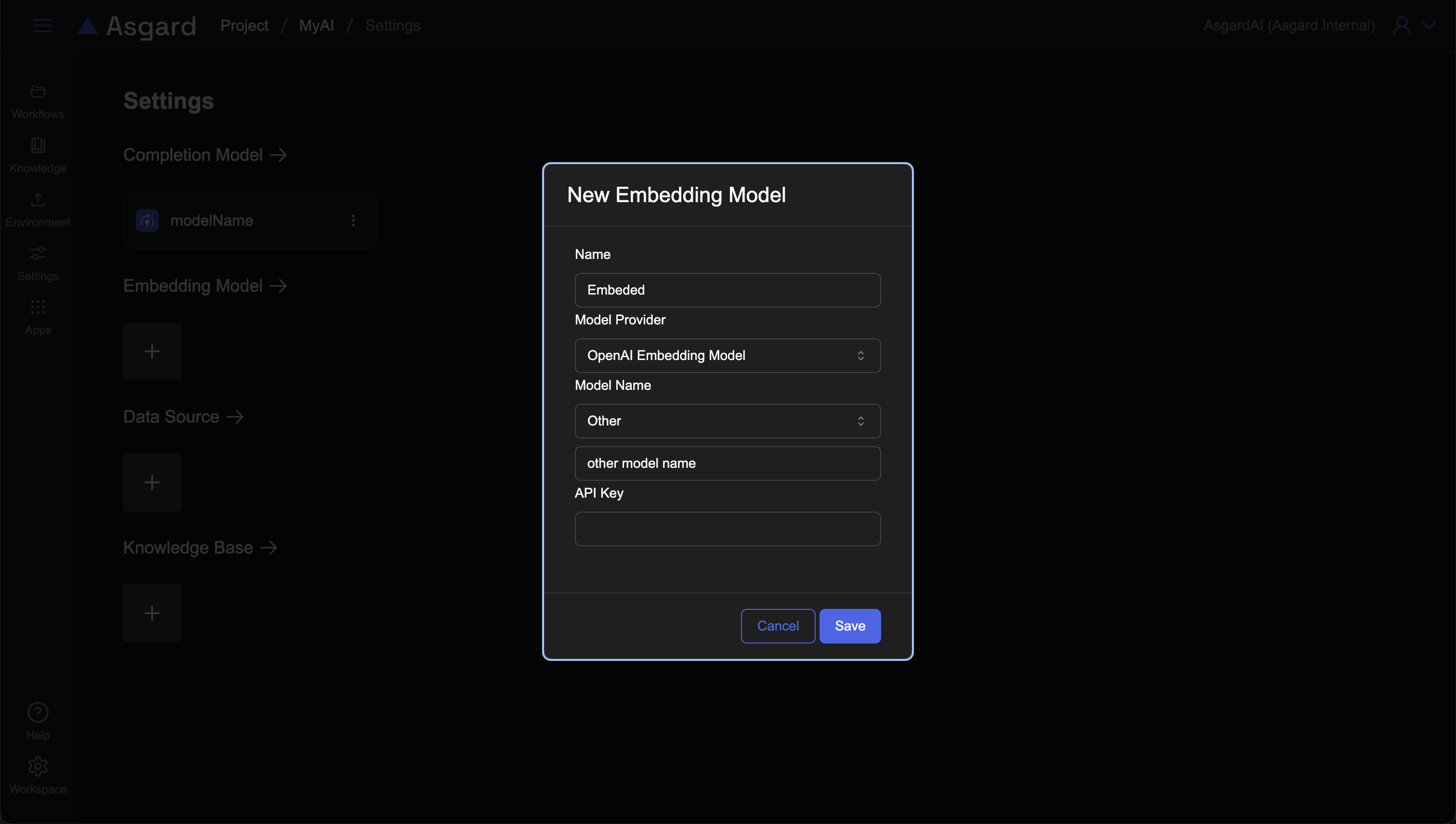 在 Embedding Model 的區塊點擊「+」新增 Embedding Model 並填入所需欄位後儲存。注意不同模型供應商所需填寫的欄位有可能不同,範例使用 OpenAI。