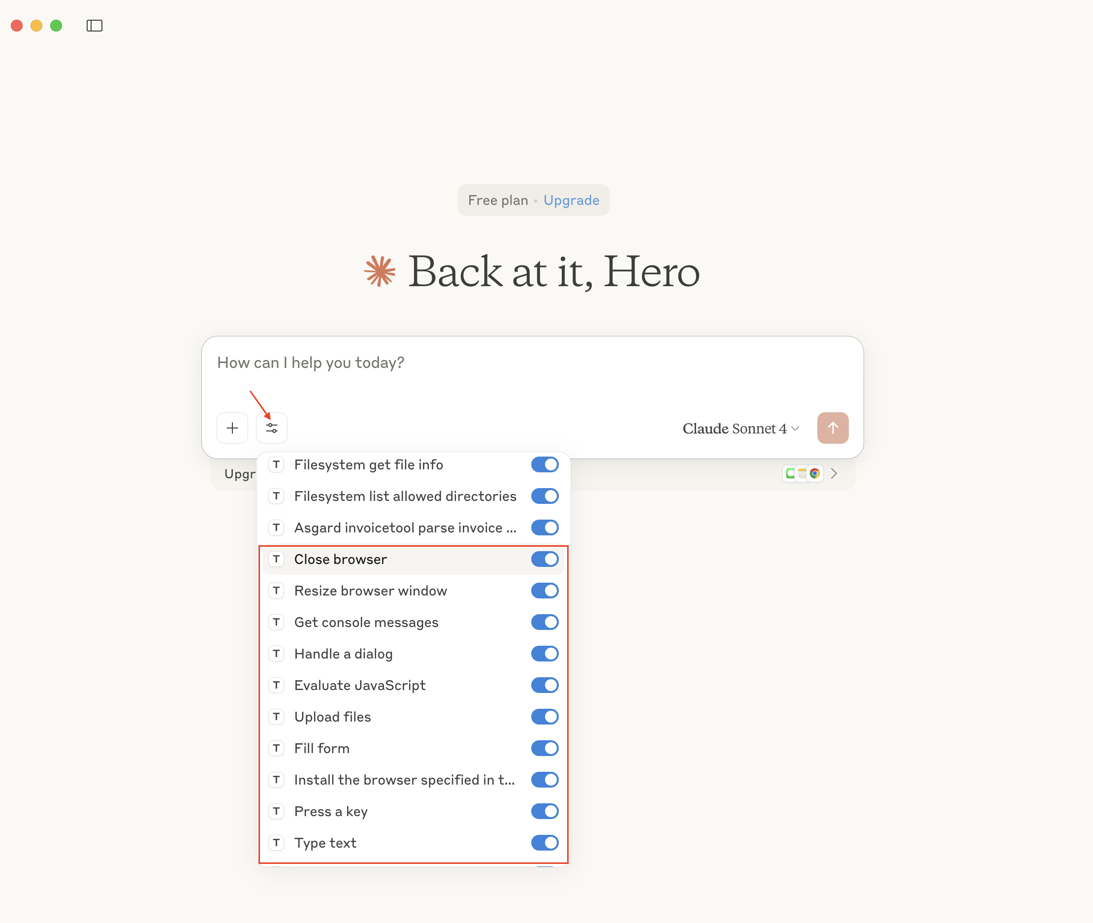 請先確認 MCP Host 能正常連線到新增的 Playwright MCP Server 設定,若沒有顯示相關瀏覽器操作的功能的話,請重啟 MCP Host 或是 Command+R (macOS) 來重新載入。