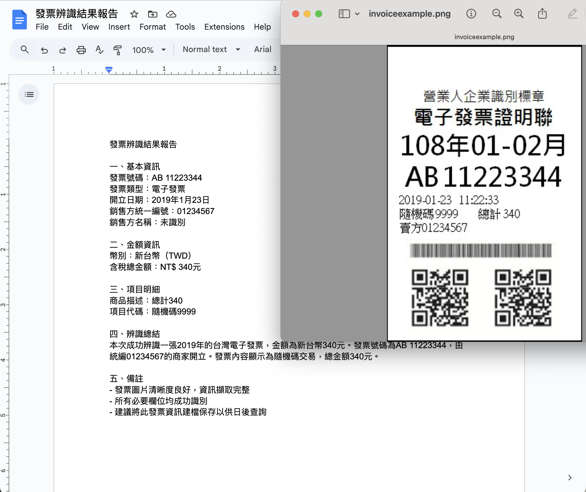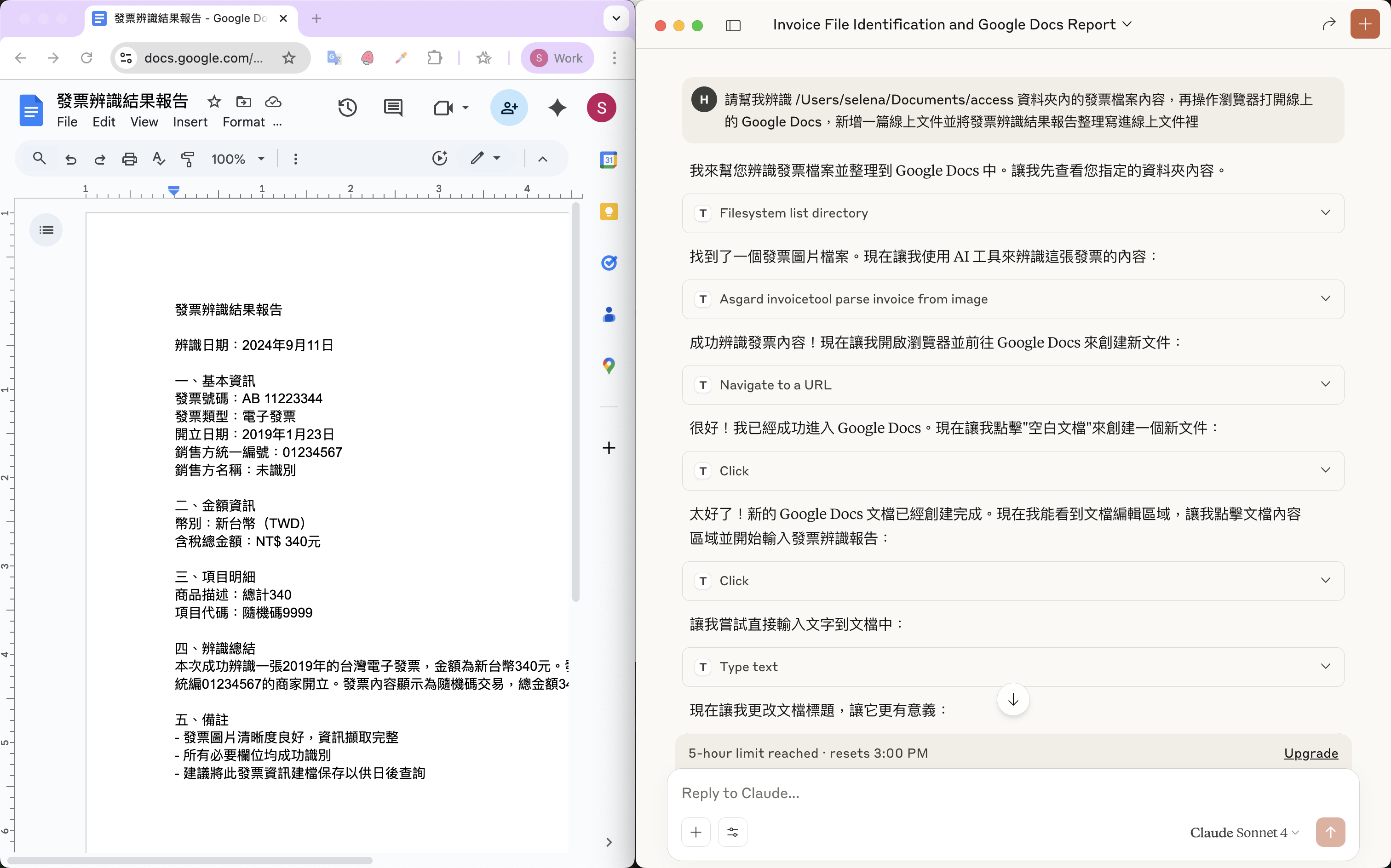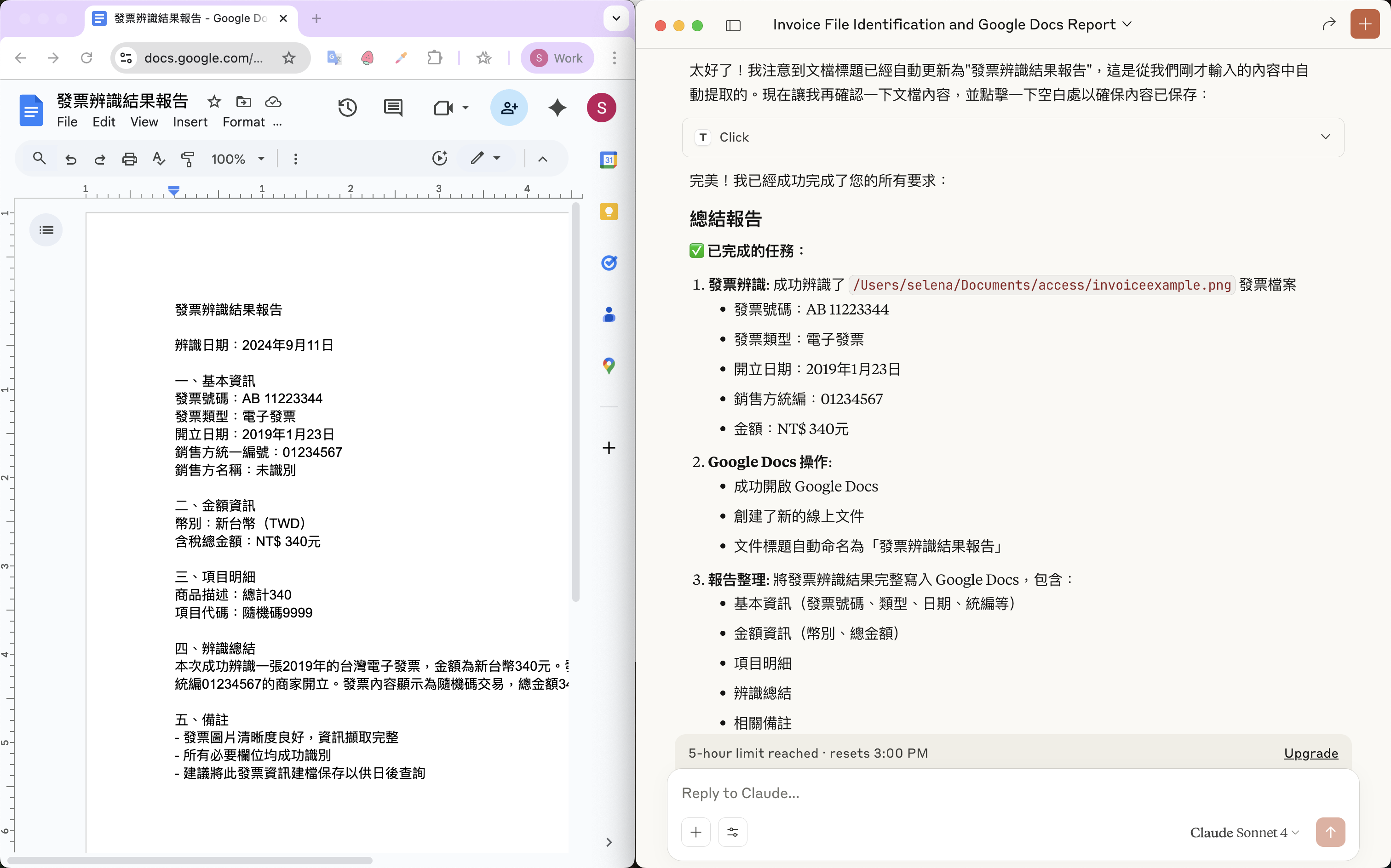 再用 MCP 操作瀏覽器打開線上的 Google Docs,新增一篇線上文件命名為「發票簡報」,將發票辨識結果報告整理寫進線上文件「發票簡報」裡