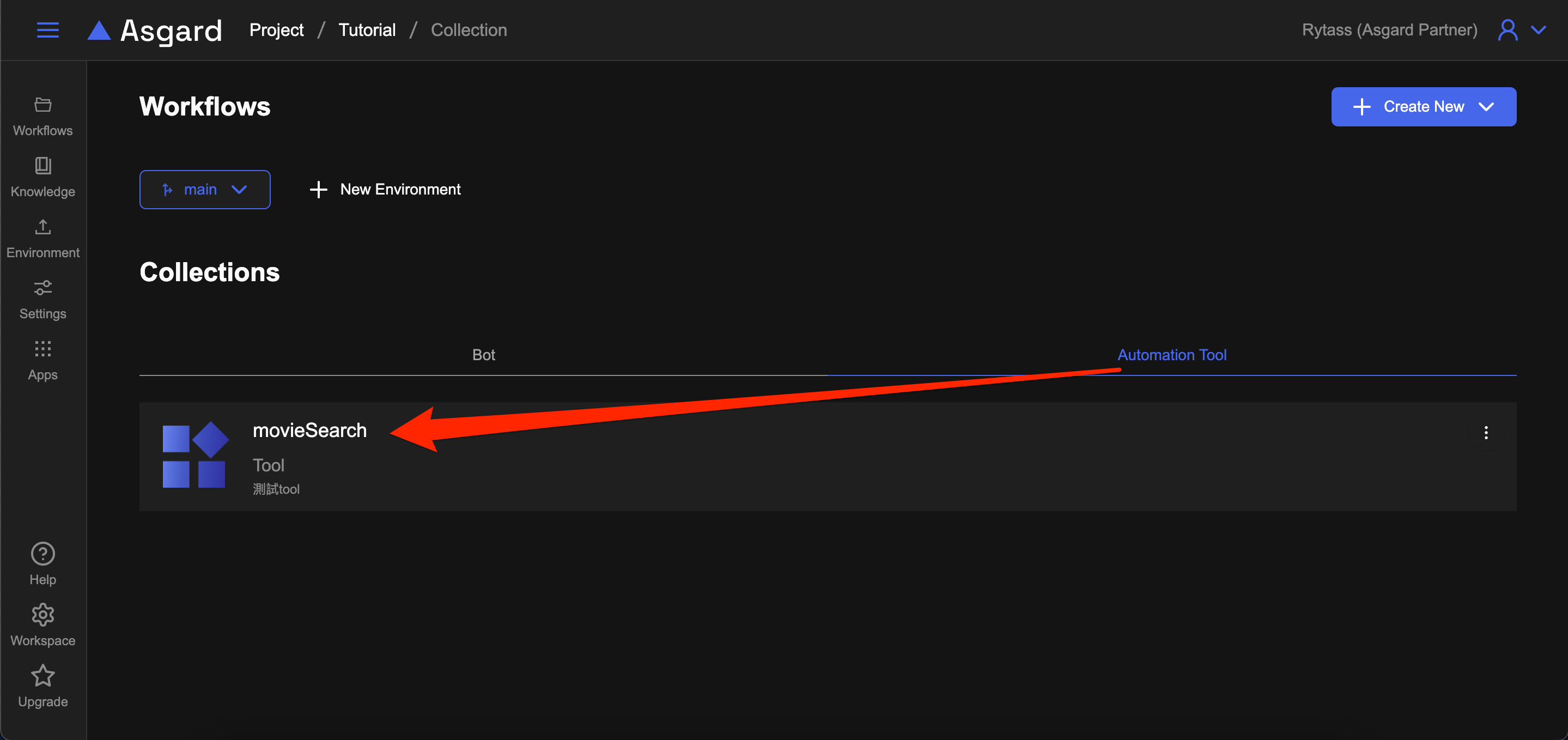 在 Project 左側的功能列選擇「Workflow」進入 Workflow 頁面,從右上方的「Create New」按鈕展開選擇「Automation Tool」。