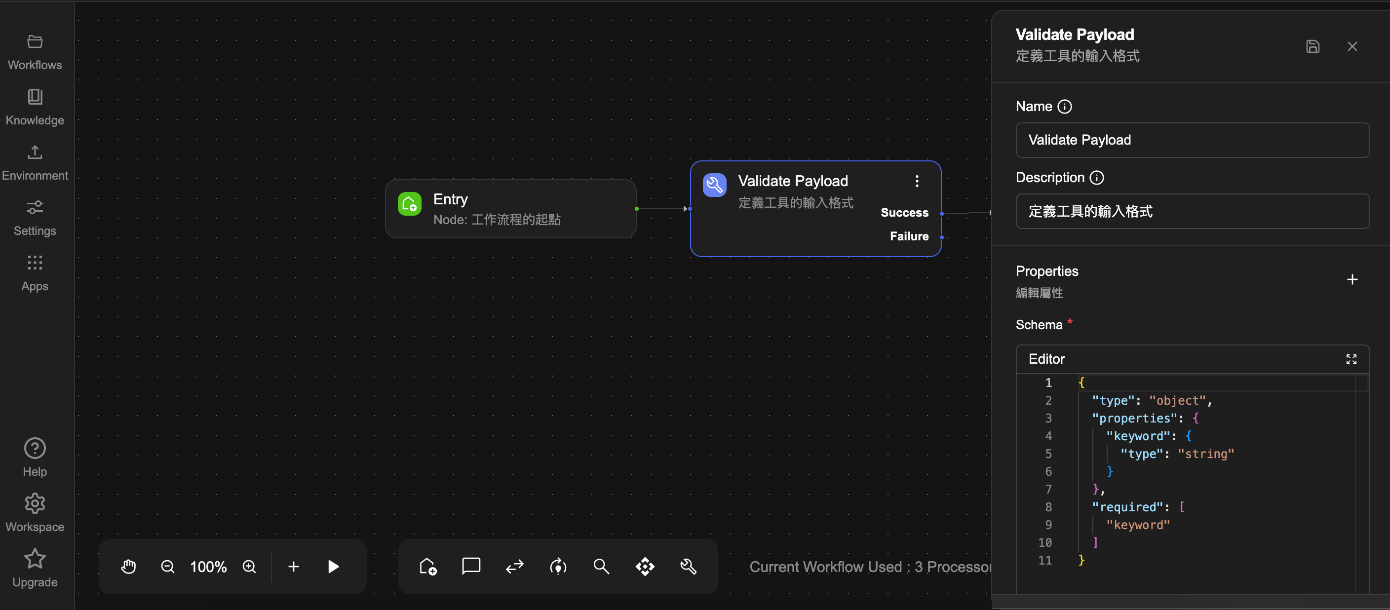進入工具工作流程設定後,系統會自動建立 Entry 和 Validate Payload 兩個 Processor。