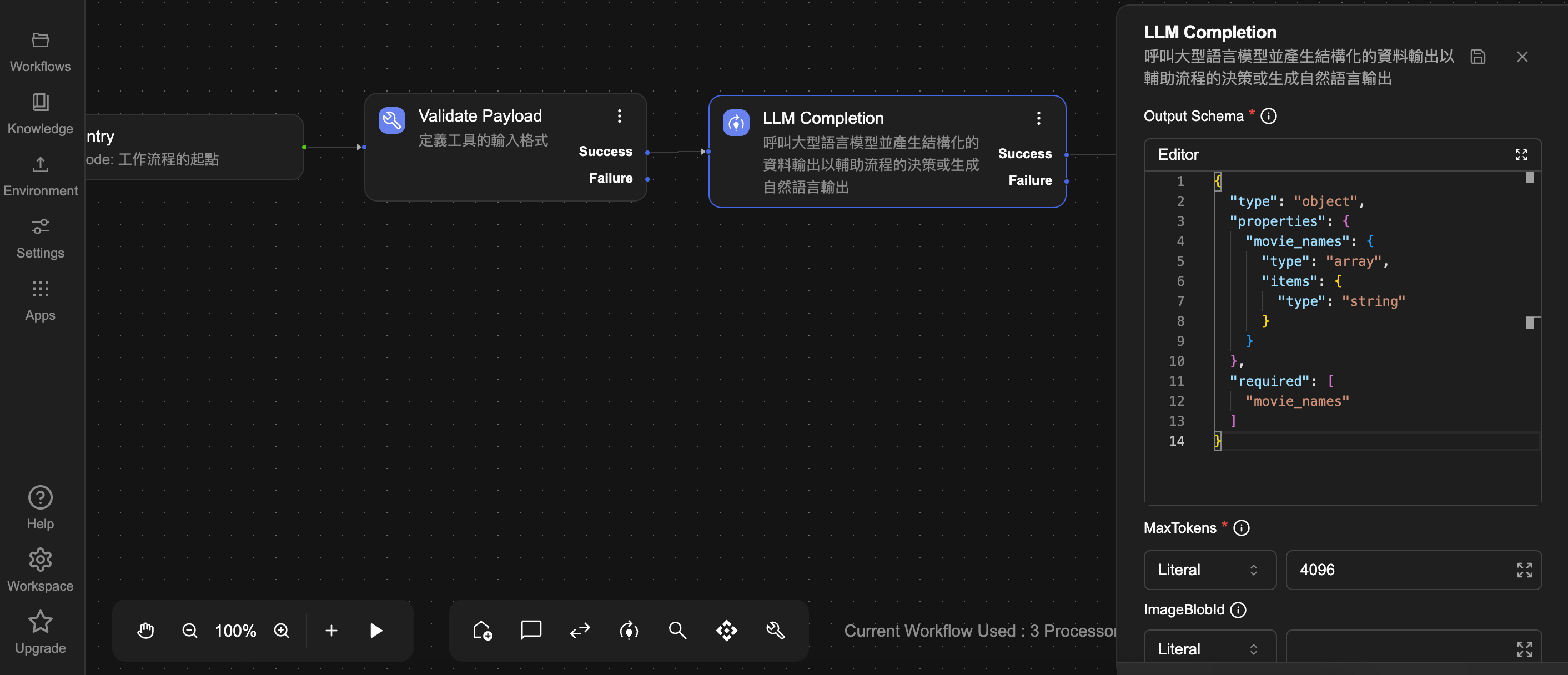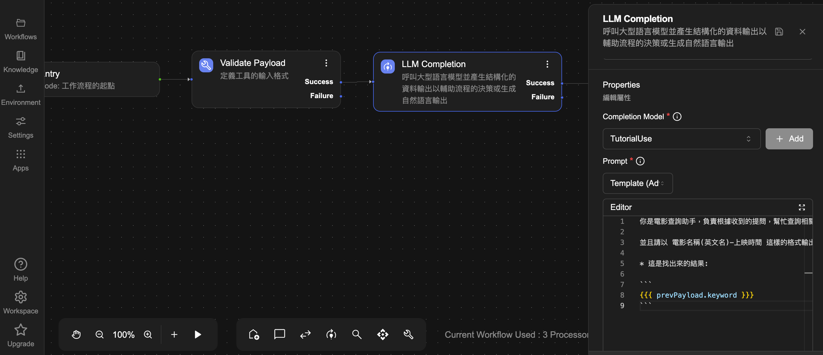 接下來的步驟會依序建立下方列出的 Processors,讓 AI 協助我們根據送進來的關鍵字,先判斷最接近哪一部電影,然後將電影名稱的中英文名稱與上映時間,以文字陣列格式回傳。