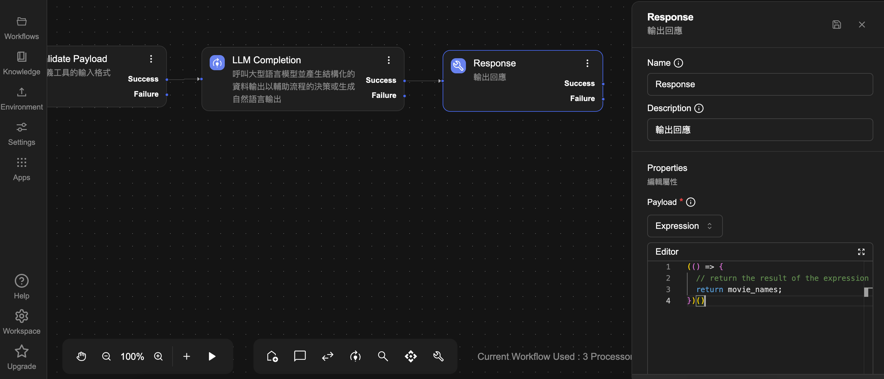 - 點擊 LLM Completion 的 Success 點擊新增 Processor,選擇「Response」processor,需要將剛才的結果輸出,因此在 Response 的 Properties Payload 中,選擇 Expression 並輸入程式碼: