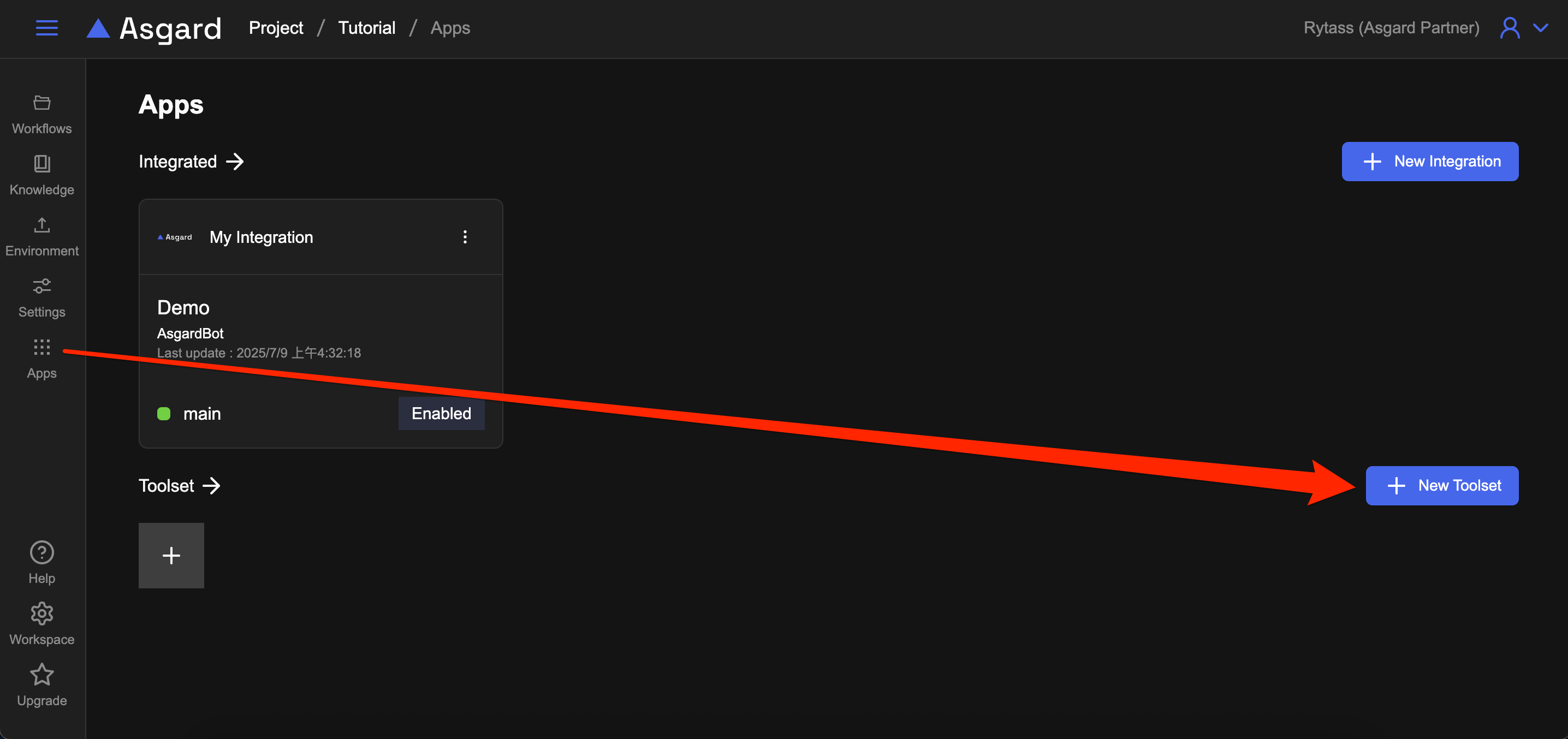 在 Project 左側的功能列選擇「Apps」進入 Apps 應用頁面,點擊右方的「New Toolsets」按鈕。