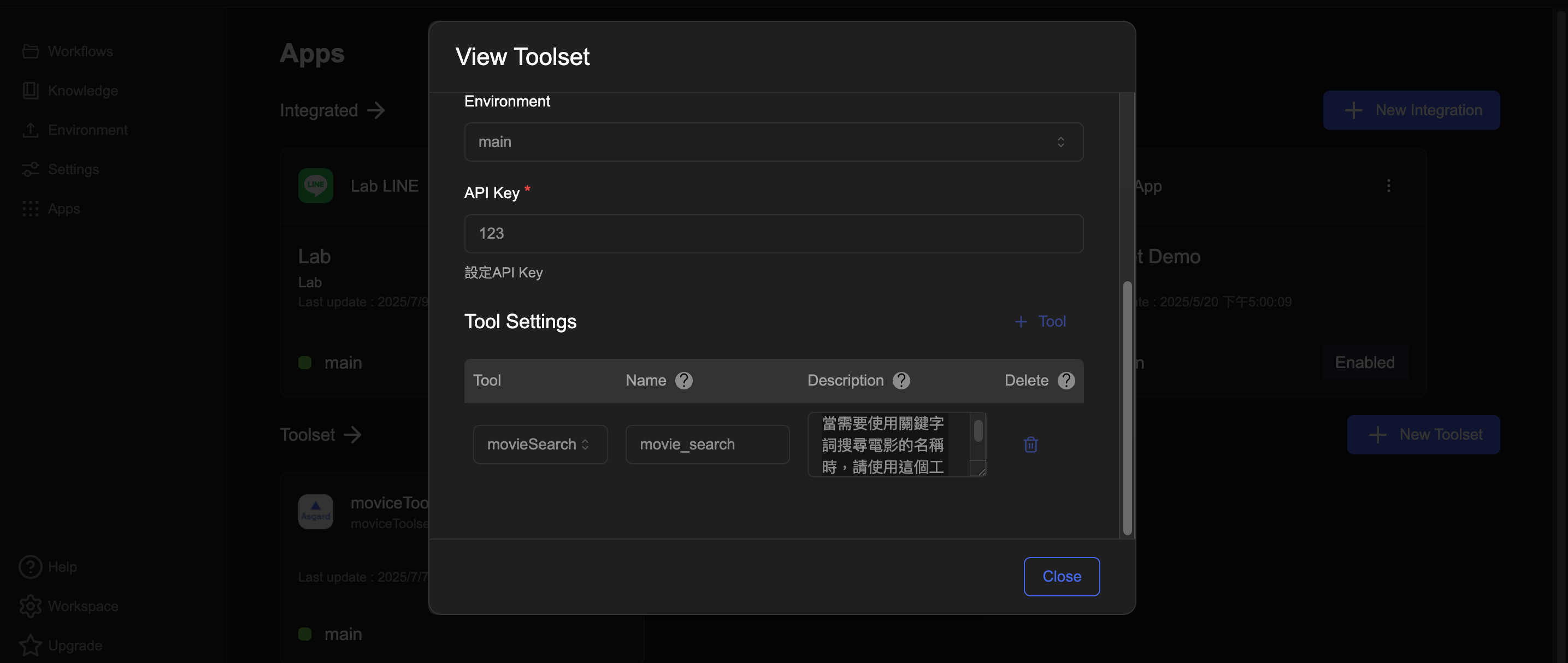 | Name of Toolset | 工具集名稱,這會在 Workflow 流程中顯示 | movieToolset |
