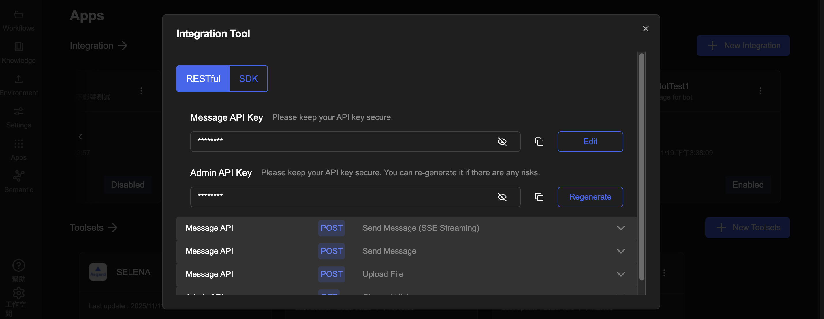 Message API KeyGeneric (Bot)呼叫 Message API 時填入。點右側複製圖示即可貼用;要換新 Key,按 Edit 回到 Integrated 編輯模式,在 Auth 設定重新儲存即可。