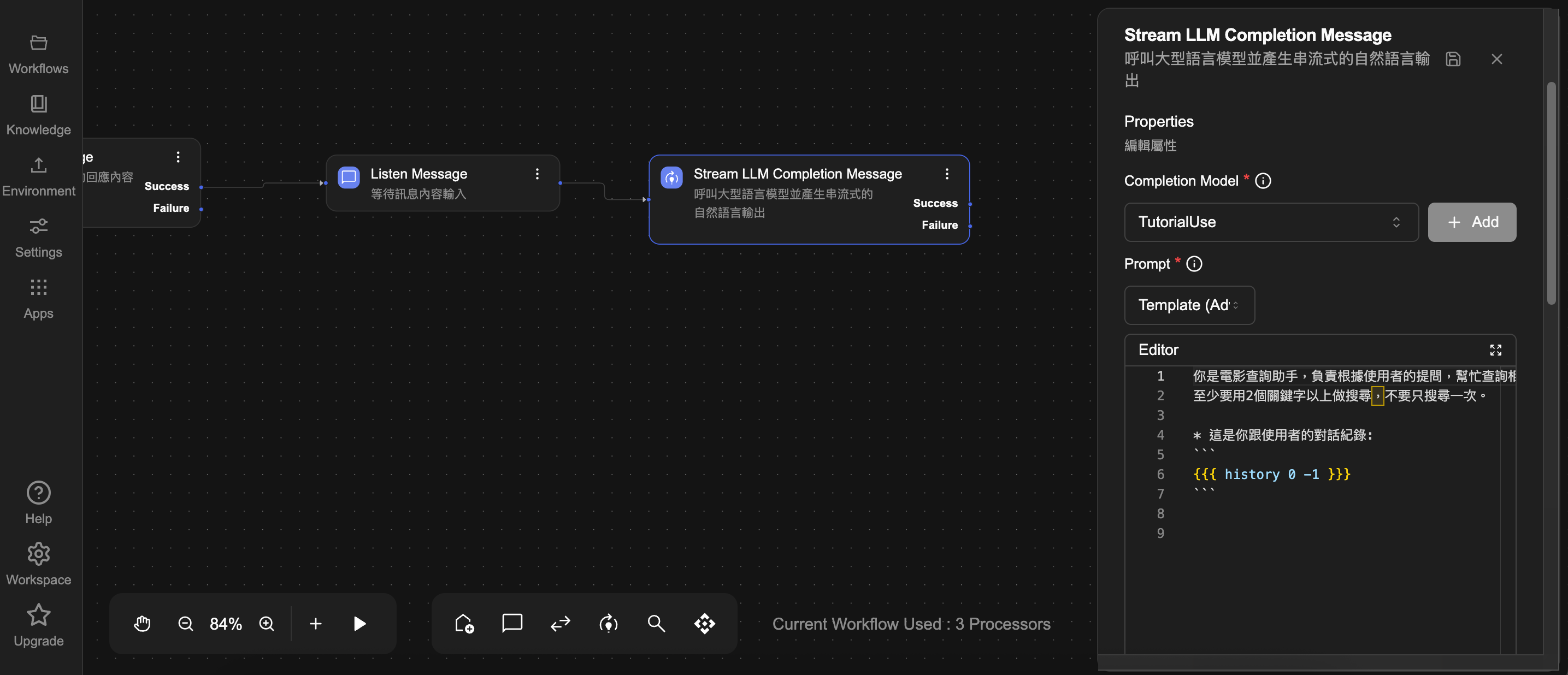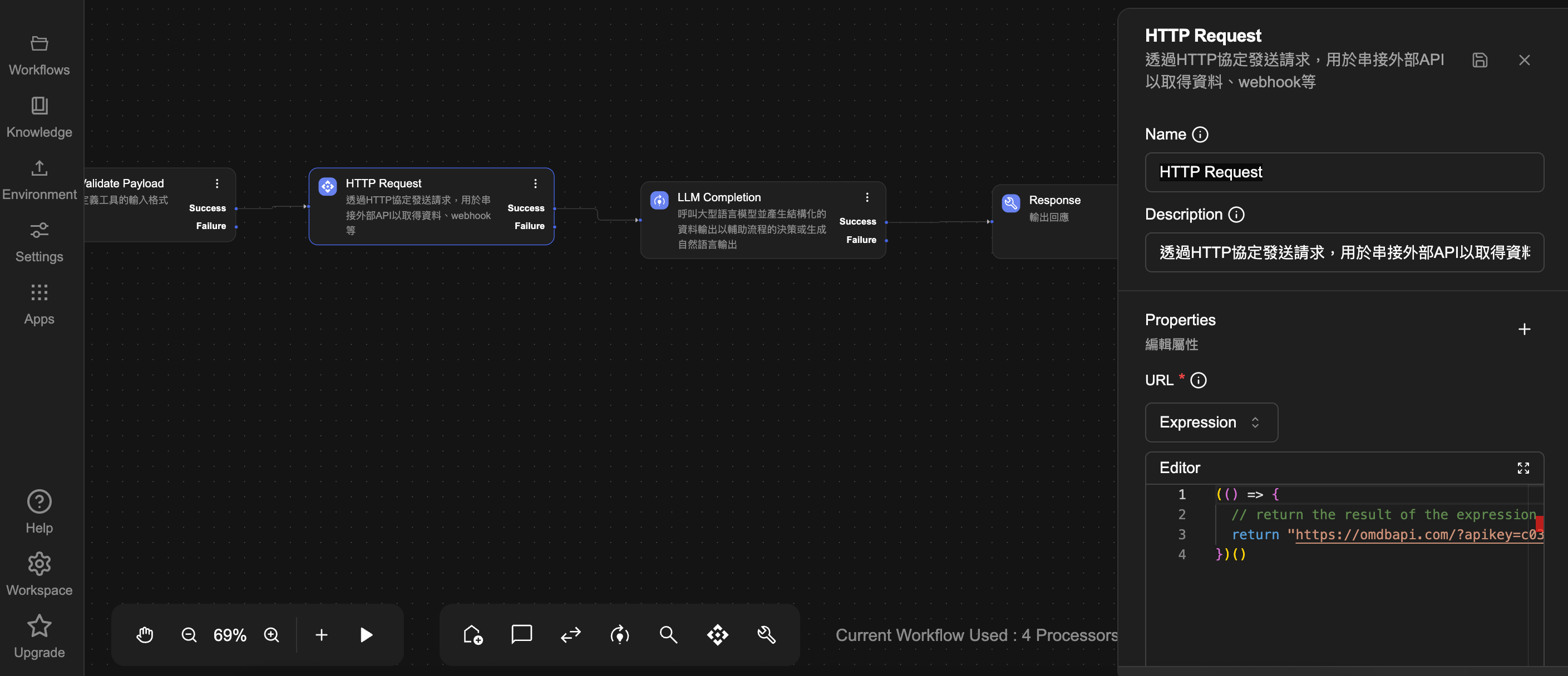 我們還可以在工具的工作流程設計裡加入更多方法調整,讓 AI 能夠更精準的參考,例如使用 HTTP Request Processor 去呼叫外部服務的 API,再將結果帶回給 AI 分析。