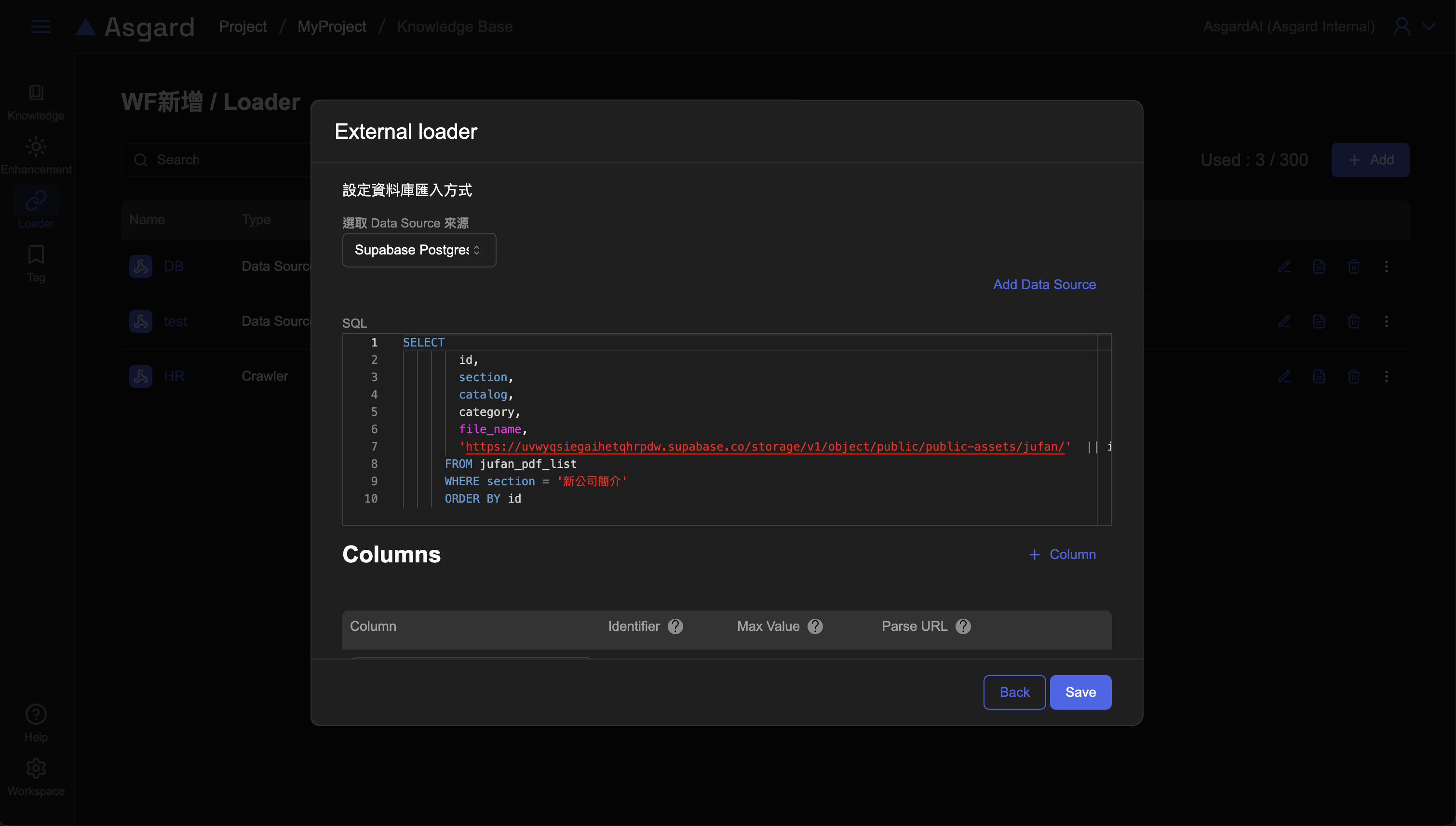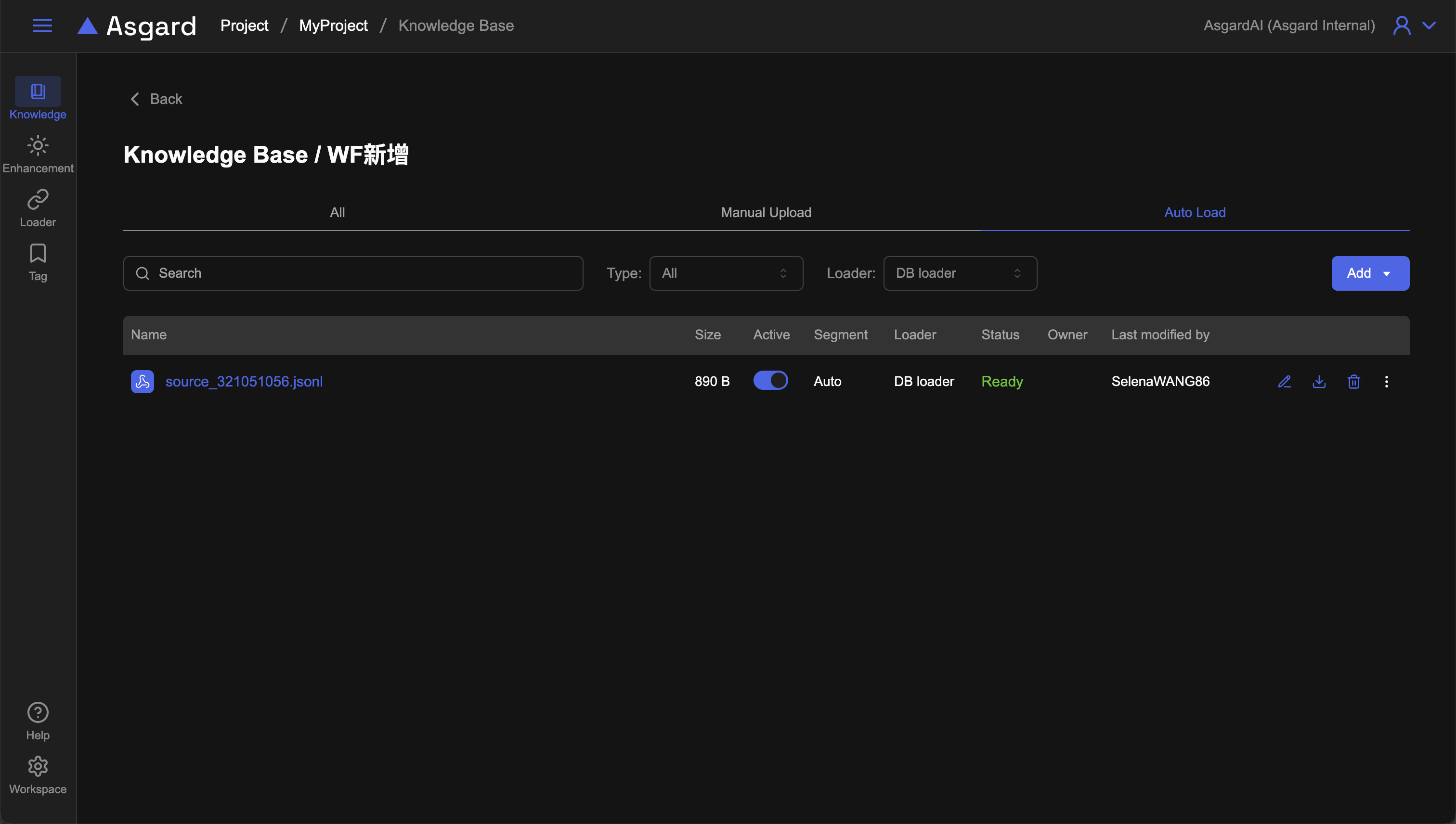 可以在知識庫列表的「Add」按鈕點擊後選擇「Auto Load」或是直接進到左側 Loader 功能列表後,點擊「Add」新增。