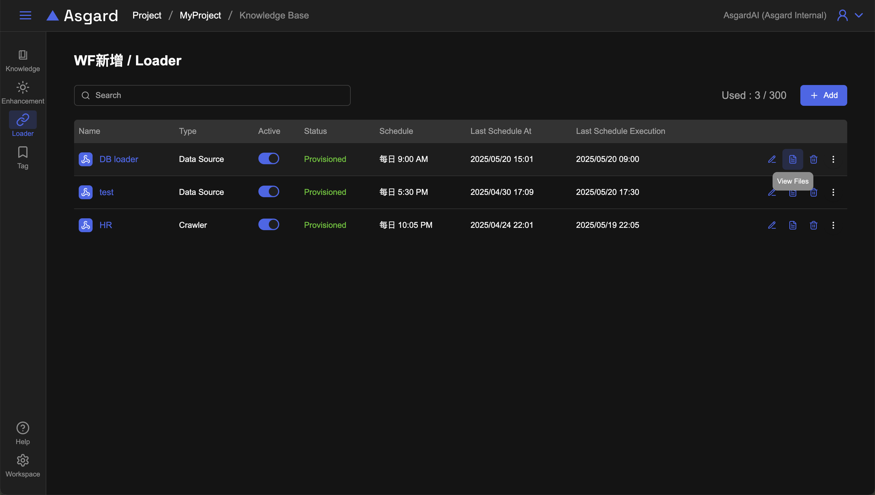 在設定好執行的排程時間,系統會自動擷取知識並載入,可以看到 Loader 最後執行完成的時間(Last Schedule Execution)。點擊該列的「View Files」可以檢視該 Loader 載入後的檔案。