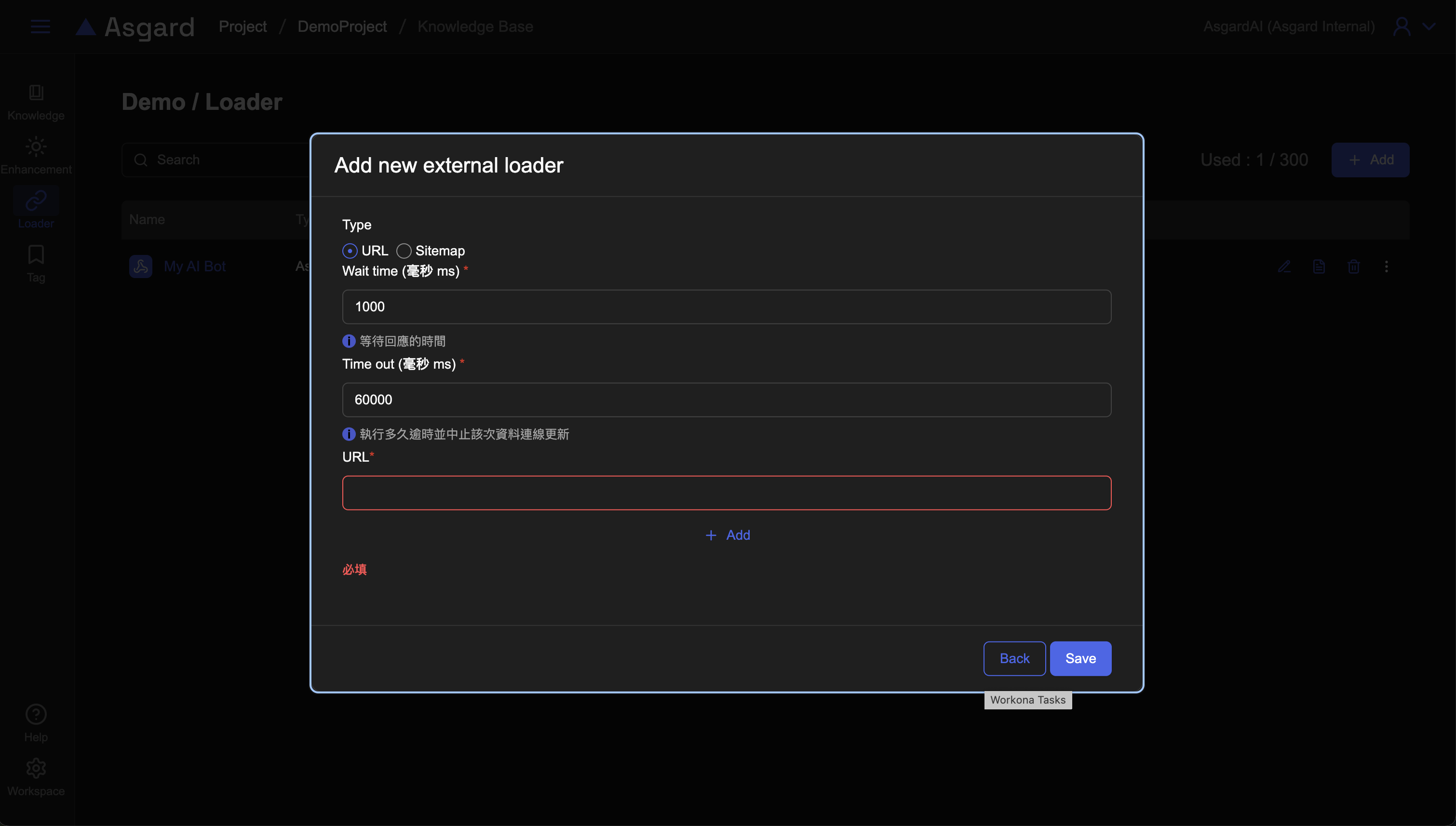 Crawler Loader 可以選擇 URL 類型或是 Sitemap 類型。選擇 URL 類型可以在底下點擊「Add」新增更多 URL,Sitemap 類型僅能設定一組 URL。請選擇需要的類型並且設定好 Wait time(毫秒 ms)與 Time out(毫秒 ms),等待回應時間與逾時時間必須介於 0~120,000 毫秒(ms)的範圍,也可以直接使用預設的值執行。