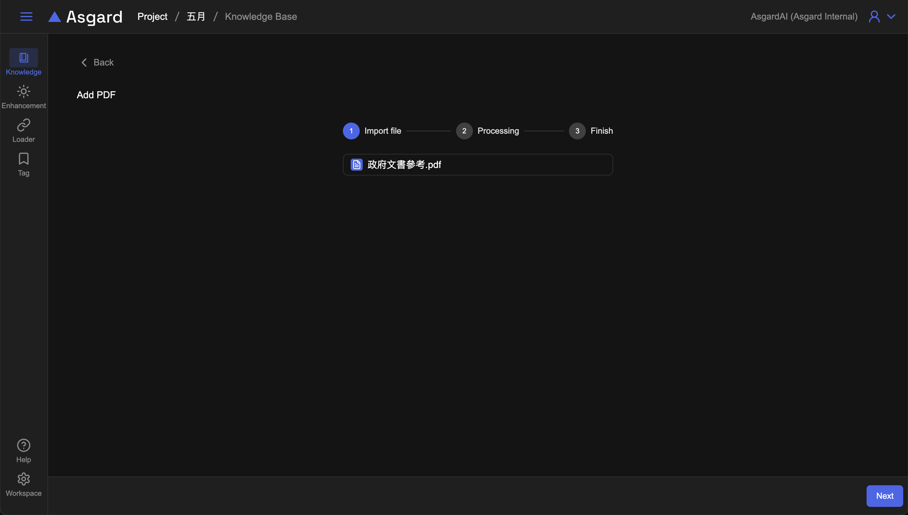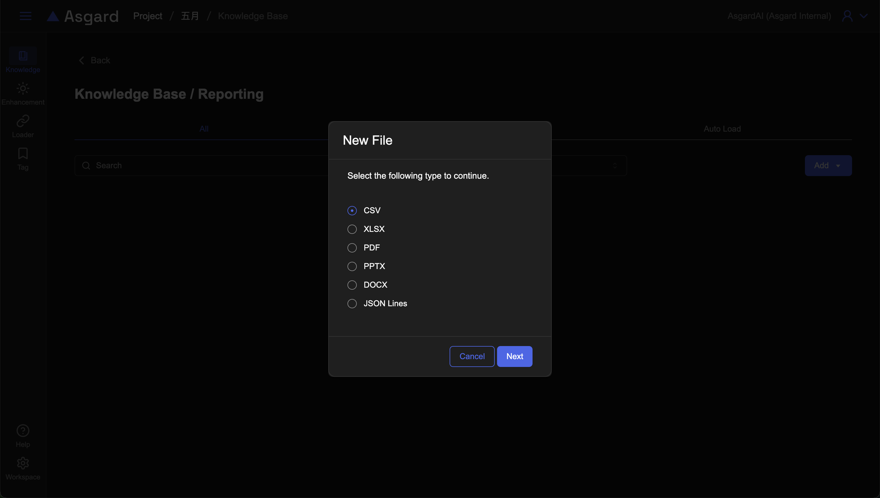 剛建立好的知識庫進入後預設會進到所有知識的列表,底下分頁可以看到區別了All、手動上傳(Manual Upload)、自動載入(Auto Load)三個分頁。最簡便的方式是直接從電腦手動上傳一個新的檔案,點擊「Add」選擇「Manual Upload」來新增一個新的檔案到知識庫。