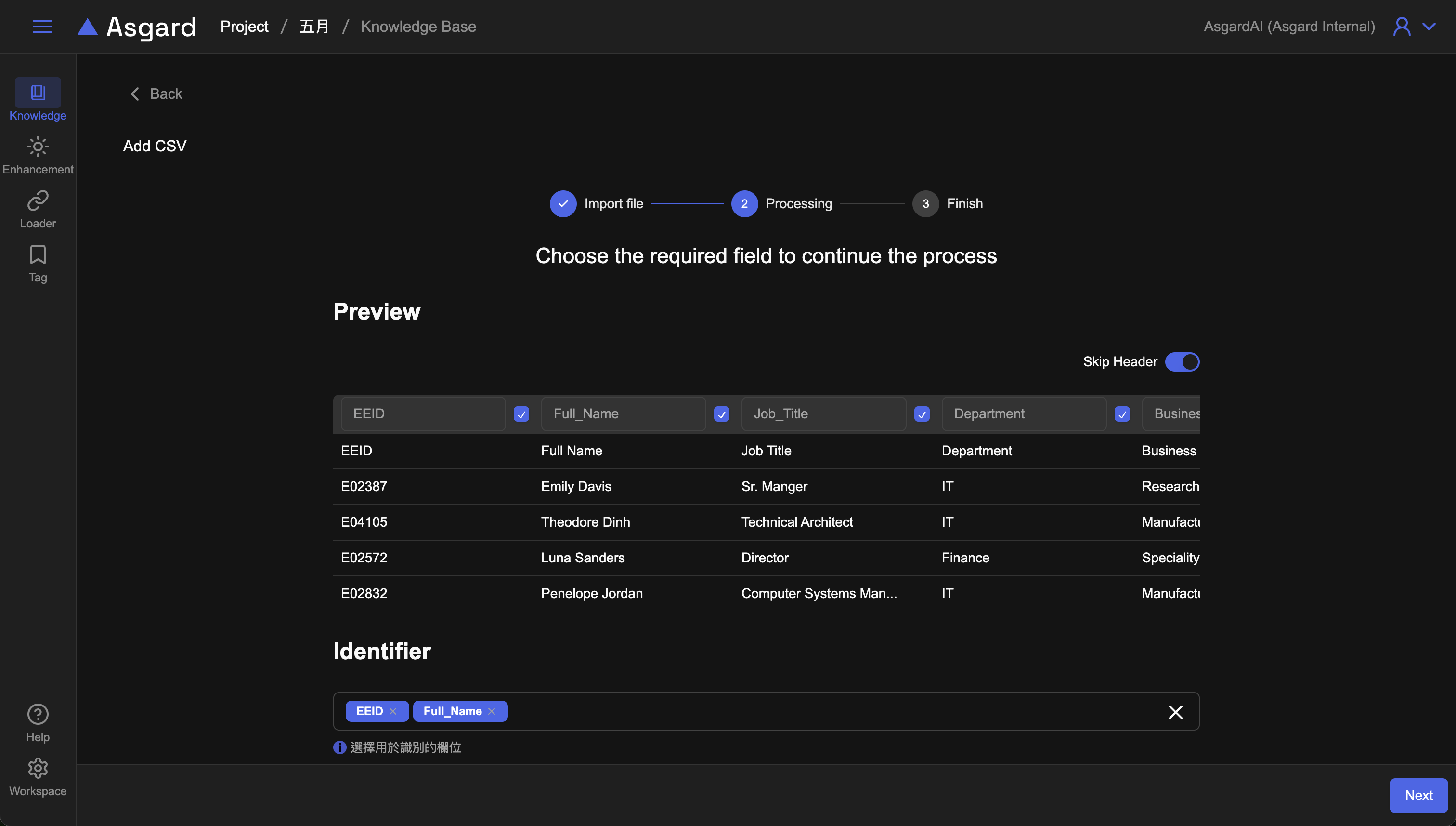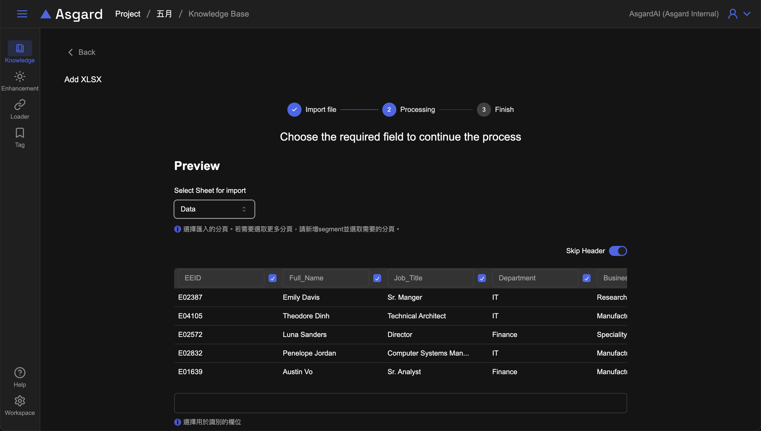 CSV與XLSX是常用的表格類型資料,選擇該類型後,請依據步驟上傳檔案,上傳完成點擊下一步可以預覽檔案,此處可以挑選需要的欄位加入處理即可,並依據資料內容選擇是否需要保留匯入首行標題列或是跳過(Skip Header),後續可以新增分段設定並調整所需欄位,儲存後即可到知識庫資料夾查看。