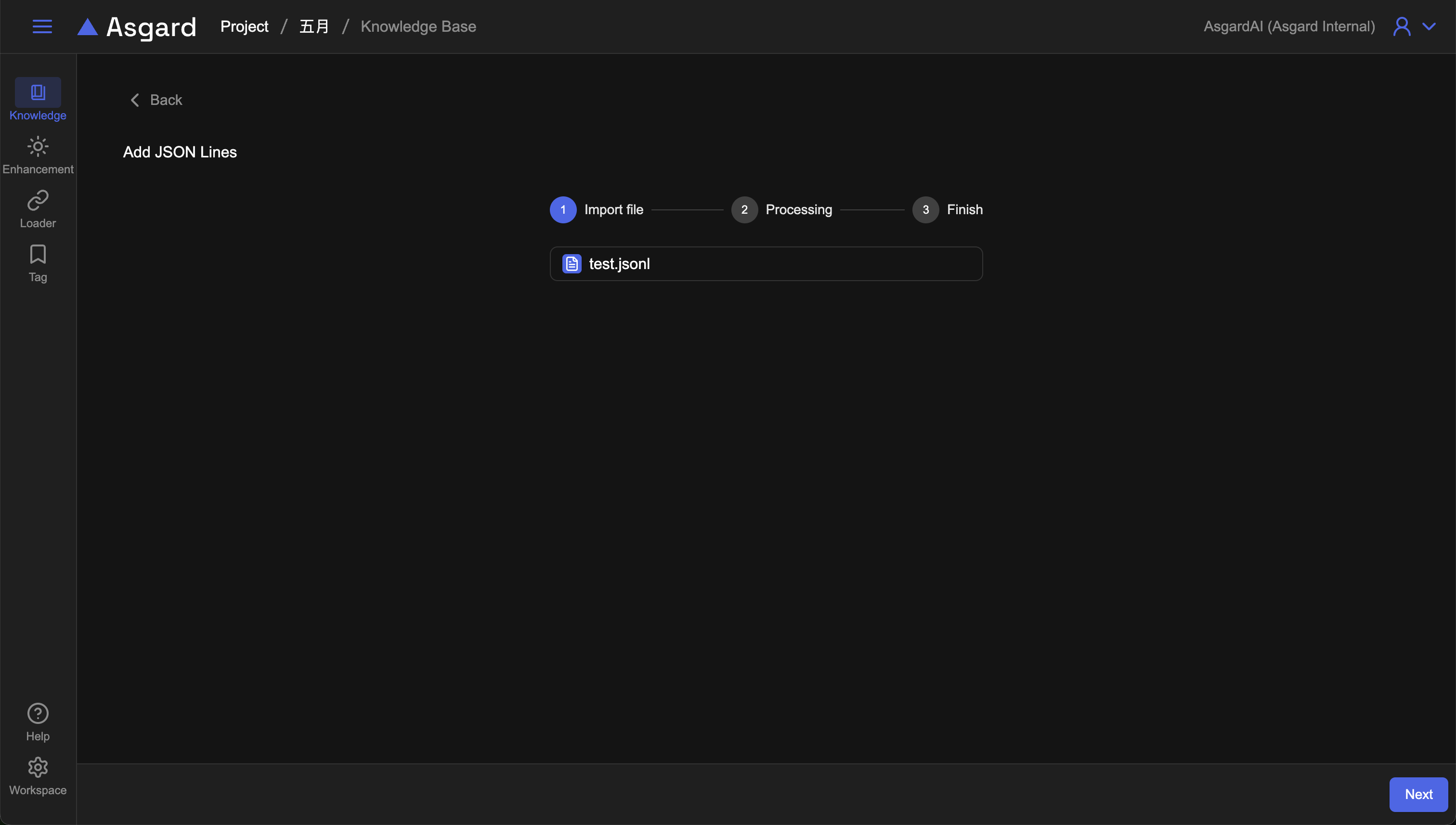 JSON Line是一種文字格式,十分方便用於儲存結構化的資料。選擇該類型後,請依據步驟上傳檔案,上傳完成點擊下一步可以預覽檔案。