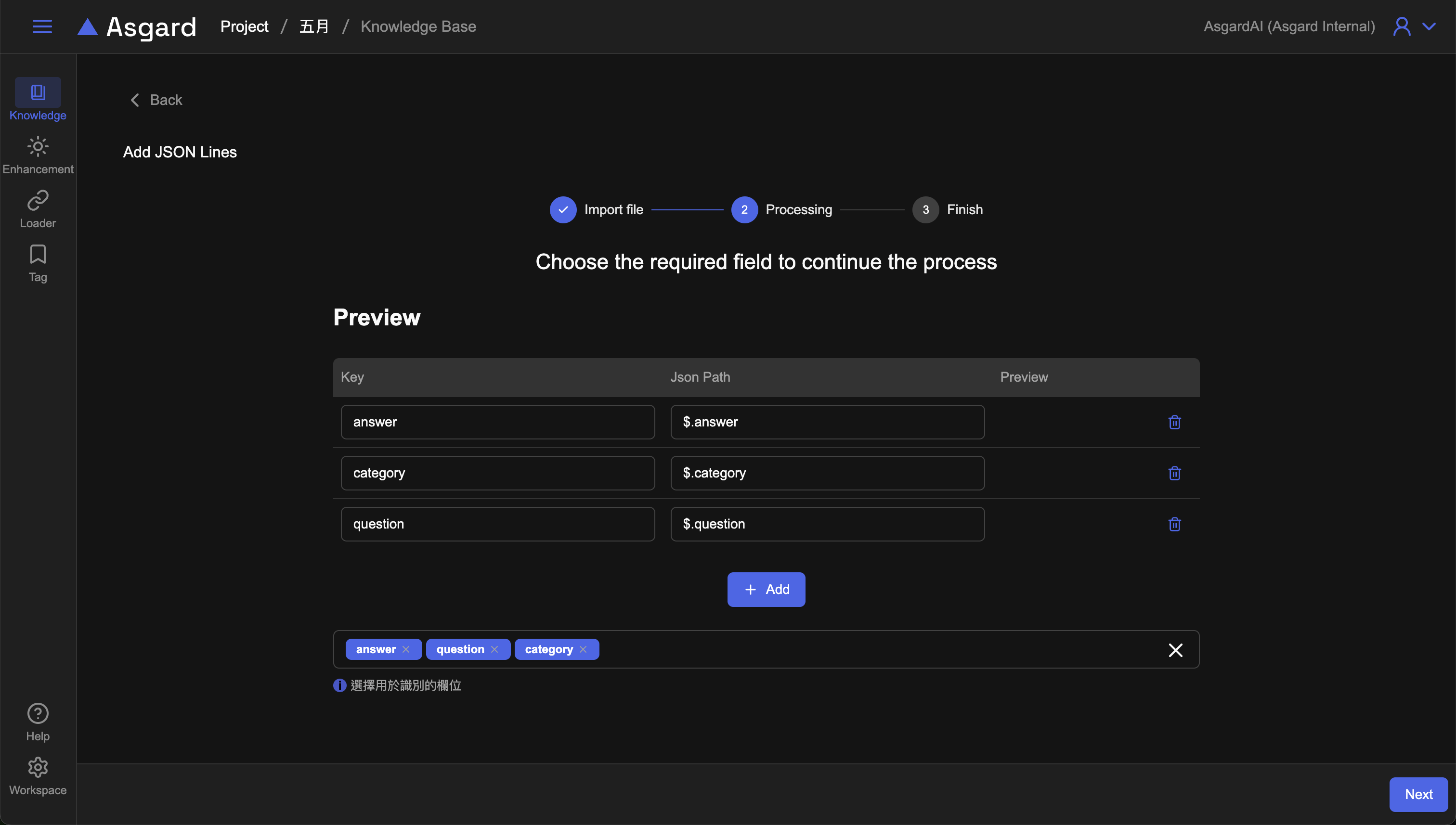2. 可編輯或新增Key與Json Path並選擇哪些欄位用於識別